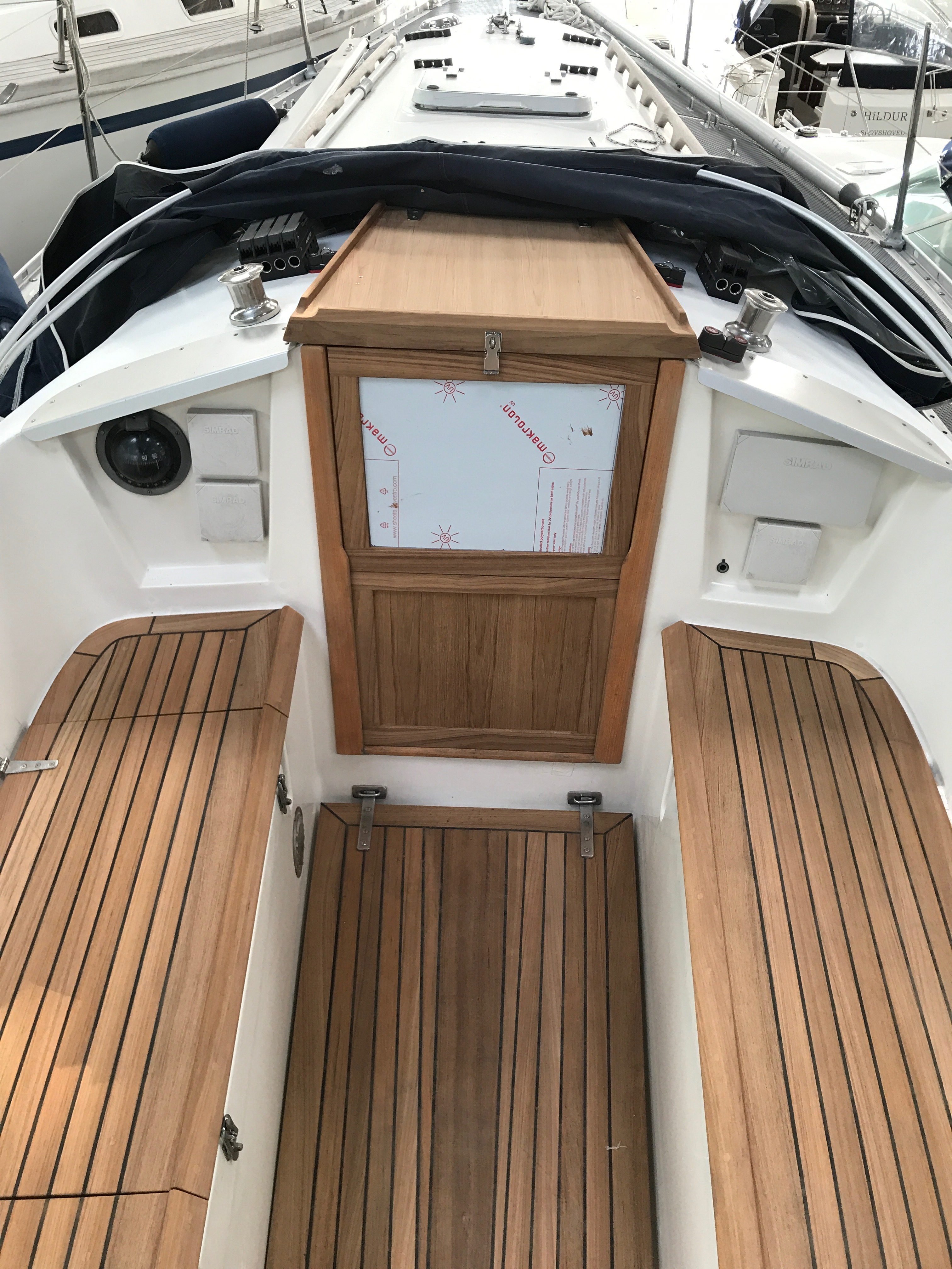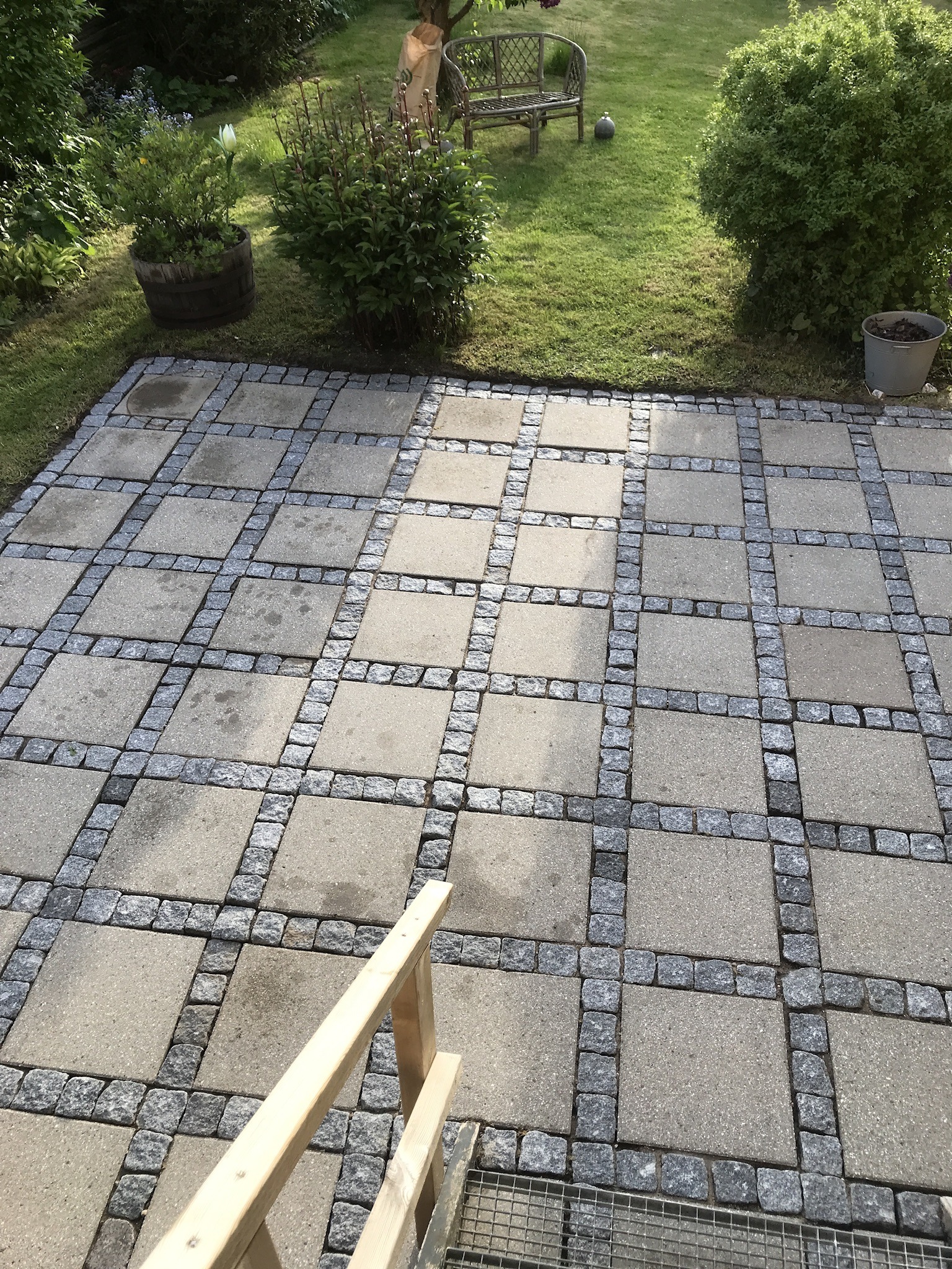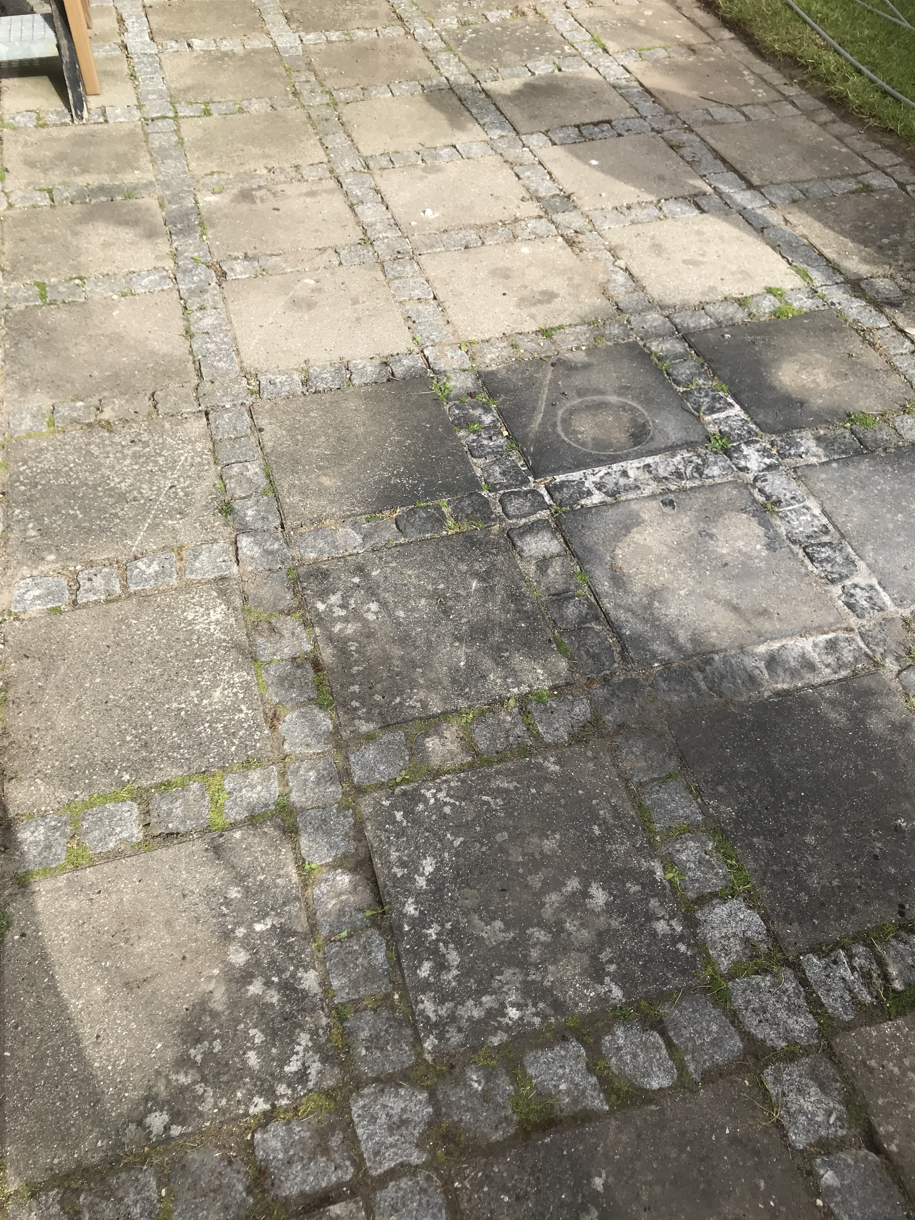 På den ene terrasse har vi et granitdæksel til en kloak, med en vindrose mejsleti. Dette dæksel fjernede den unge mand, uden at vi havde talt om det, hvor det havde været en idé at tildække det så man kunne rense udenom. Bagefter lagde han det på plads, men desværre vendte nord nu mod øst, hvilket først blev set da han var kørt, og vi opdagede samtidigt at dækslet lå skævt så det i den ene side var ca. 5cm over terrassefladen, så man kunne snuble over det. Efterfølgende kom der en anden dygtig ungmand, som skulle rette op på miseren, men han fortalte at det var vor terrasse der var sunket, men dækslet havde ligget totalt plant med terrassen før Nanostones besøg!