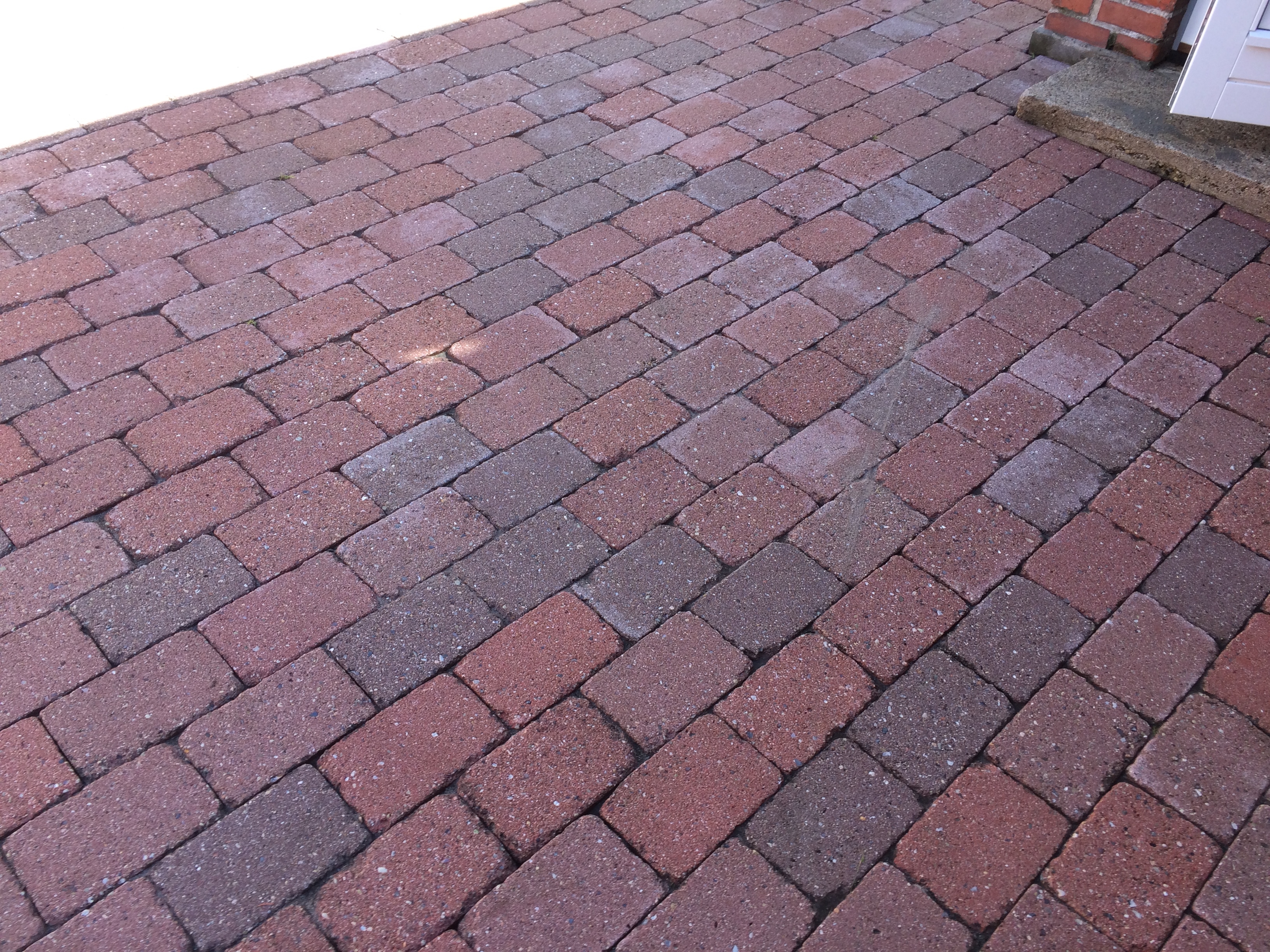 Den første operatør( marts 2018 ) rensede fliserne med en højtryksrenser. Sand, jord og ukrudt blev sprøjter op ad huset, skur og døre.