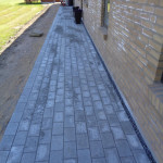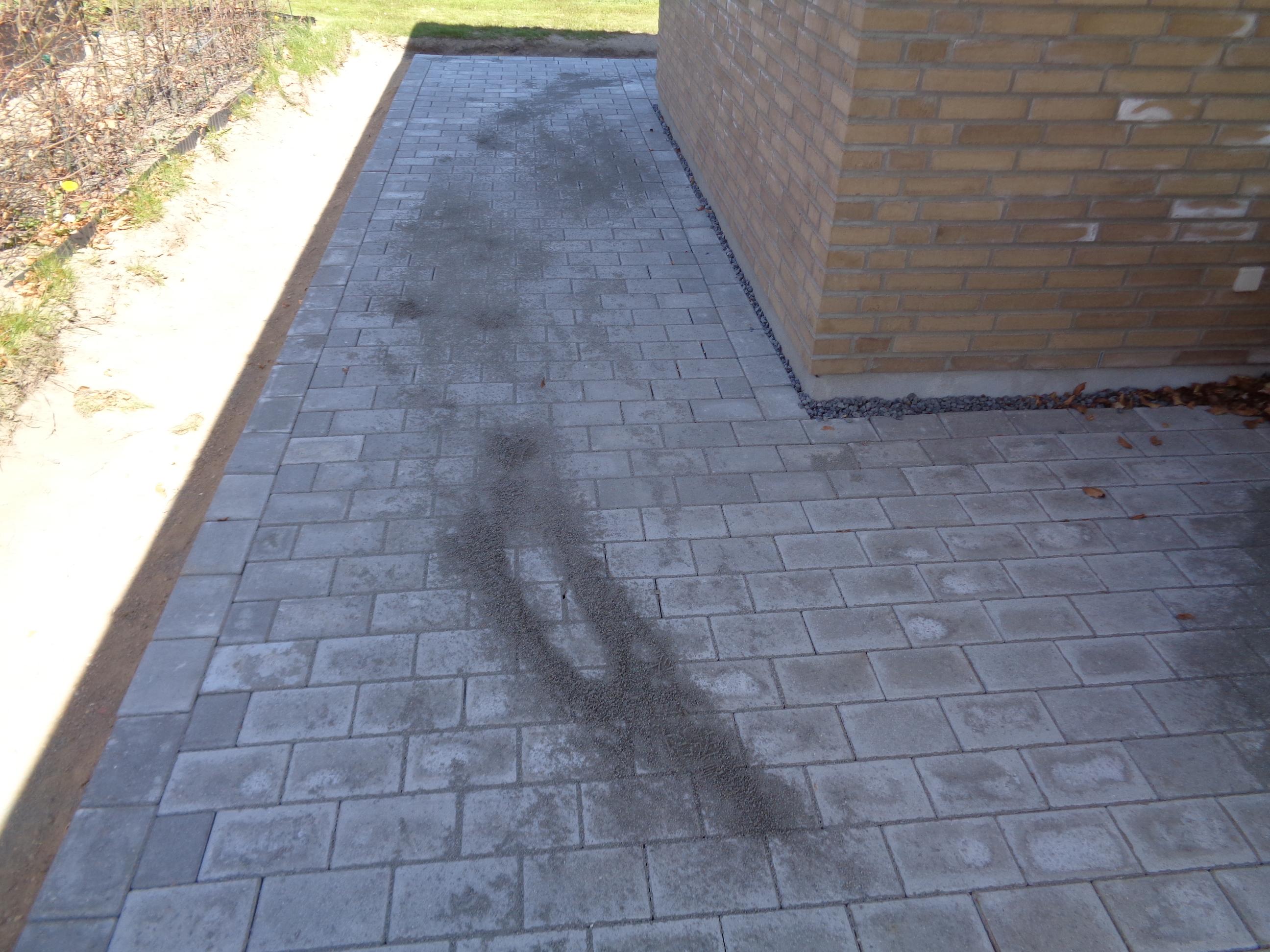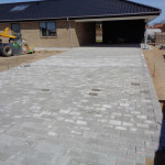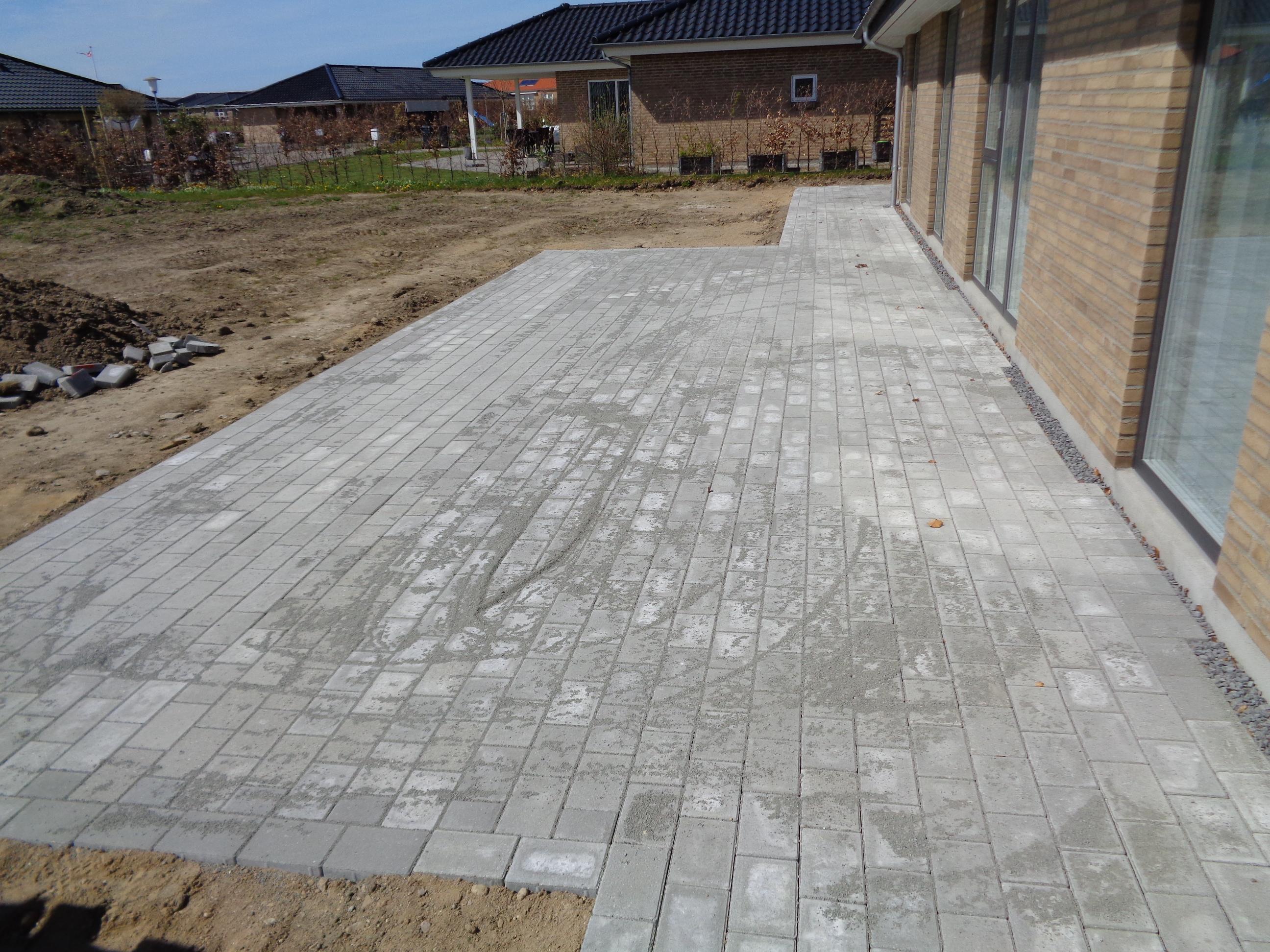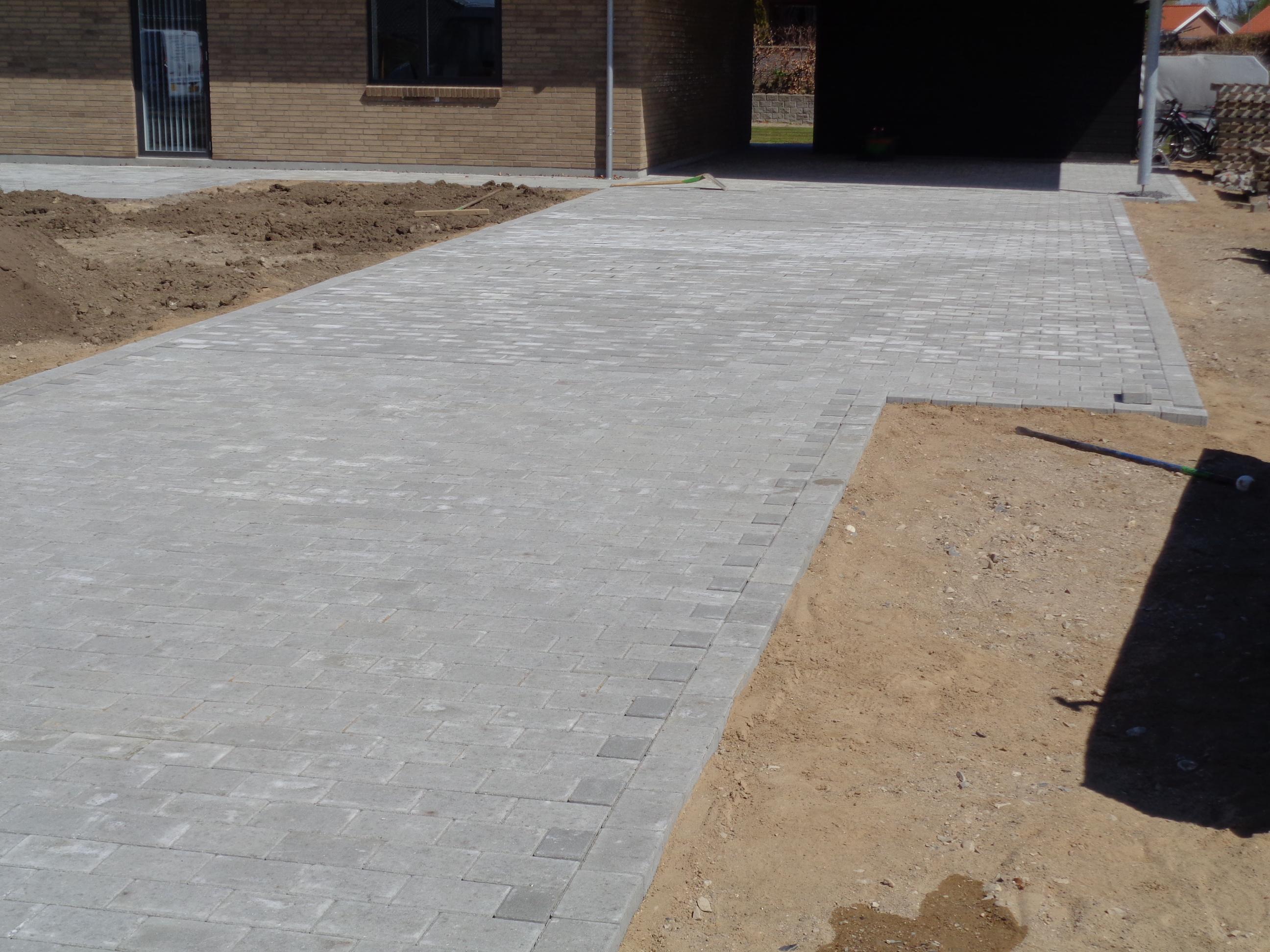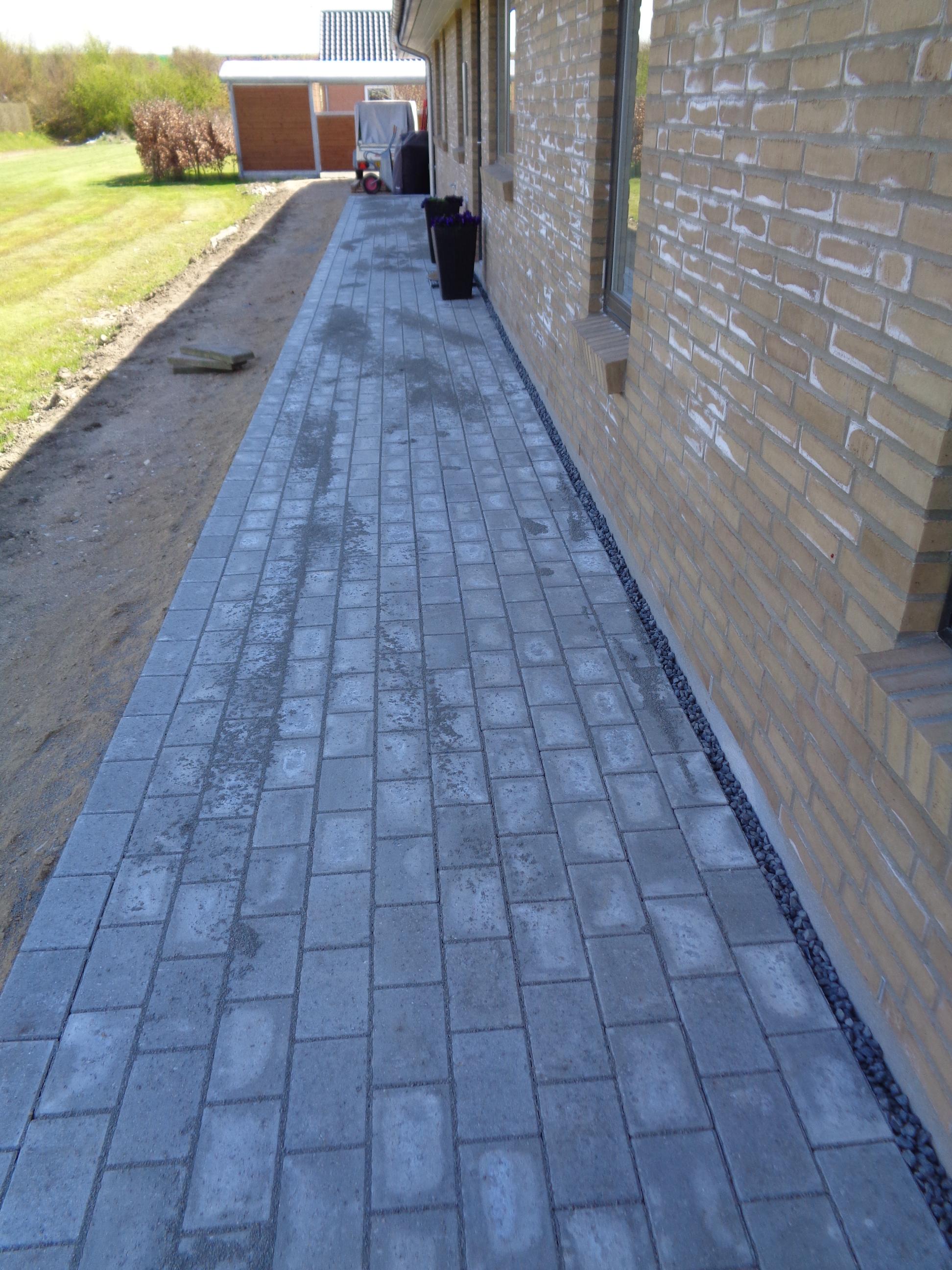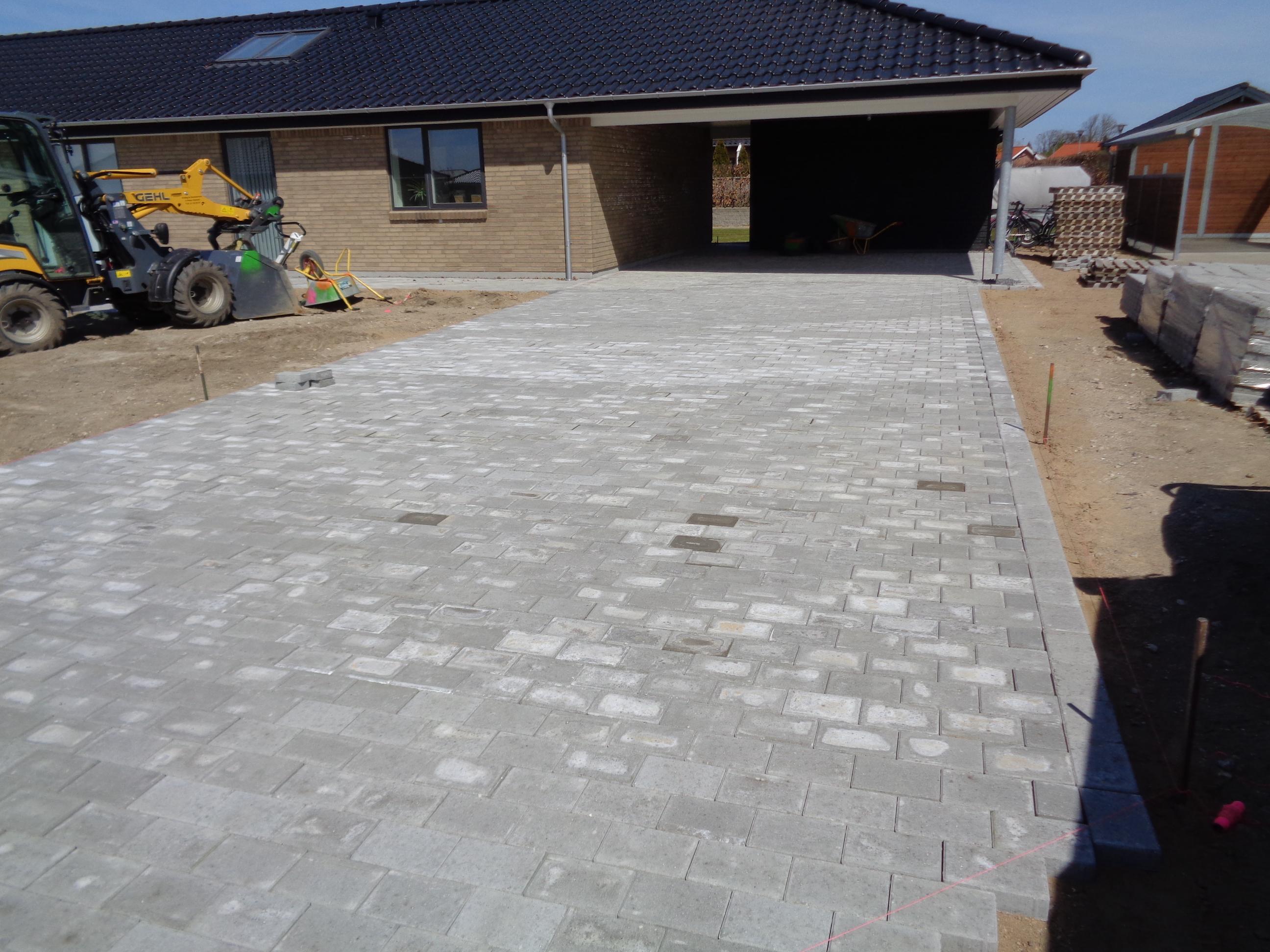 Omkring et nybygget hus, hvor jorden omkring naturligt ikke er den bedste, har vi fået lagt 28 meter lang indkørsel, terrasser samt belægning omkring hus - i alt ca. 270m2.