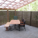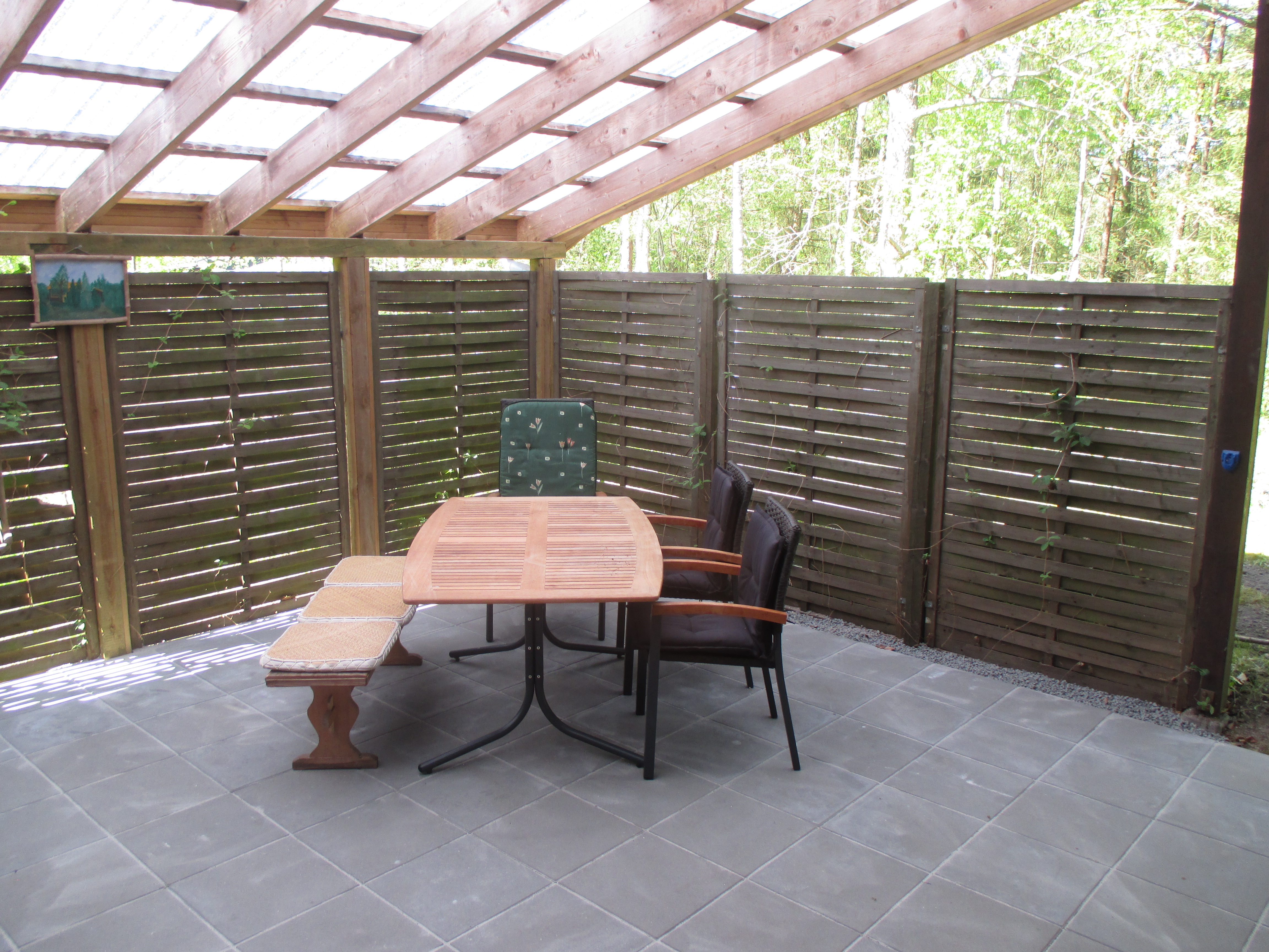 terrasse samt græs, planter og en hæk rundt om matriklen.