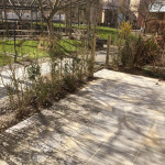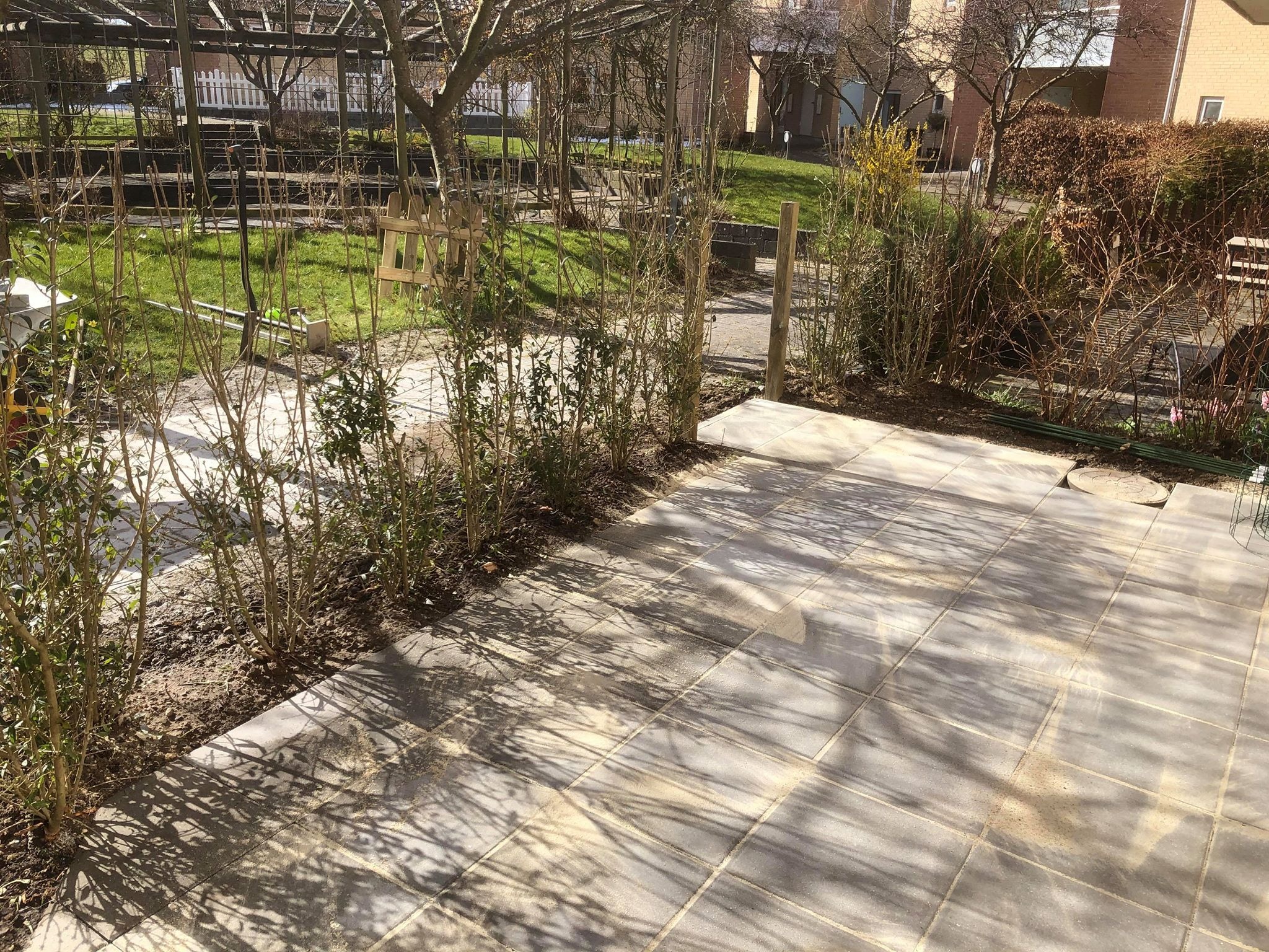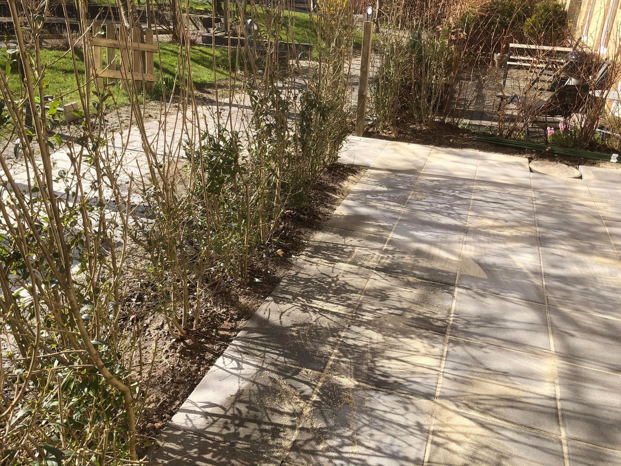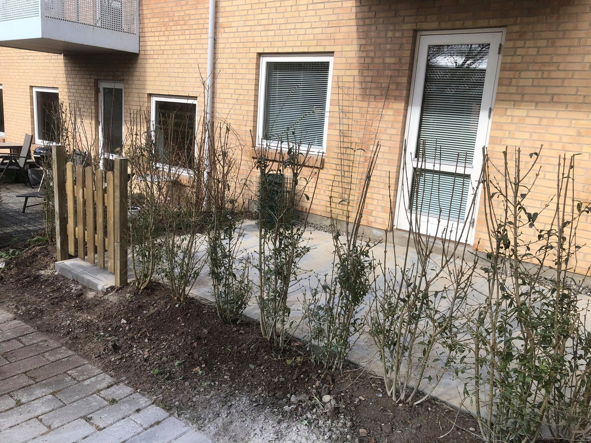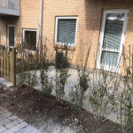 Eksisterende belægning blev fjernet og erstattet med betonfliser. Omkring terrassen blev der plantet ligusterhæk med klump og ny låge blev etableret. Vi har nu fået en rigtig fin ny terrasse, med en hæk af en god størrelse der snart vil vokse til og skærme fir indkig.