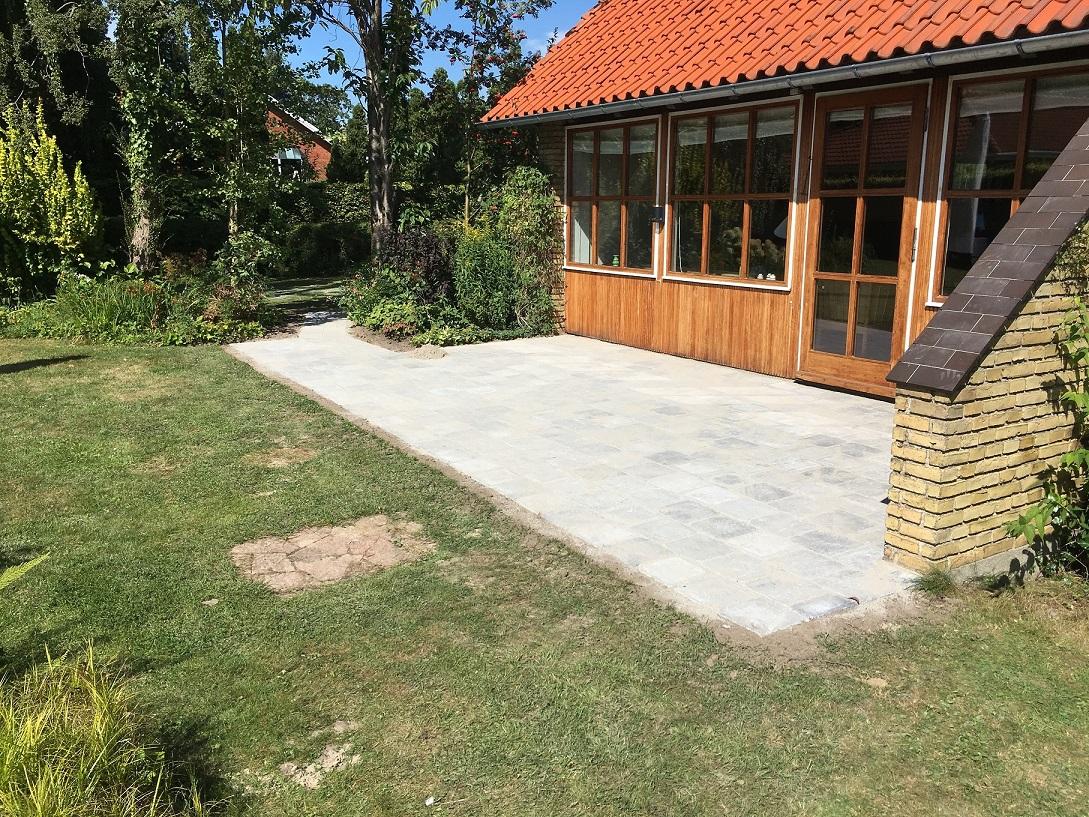Stort projekt med ca 120m2 fliser i indkørsel og terasse.