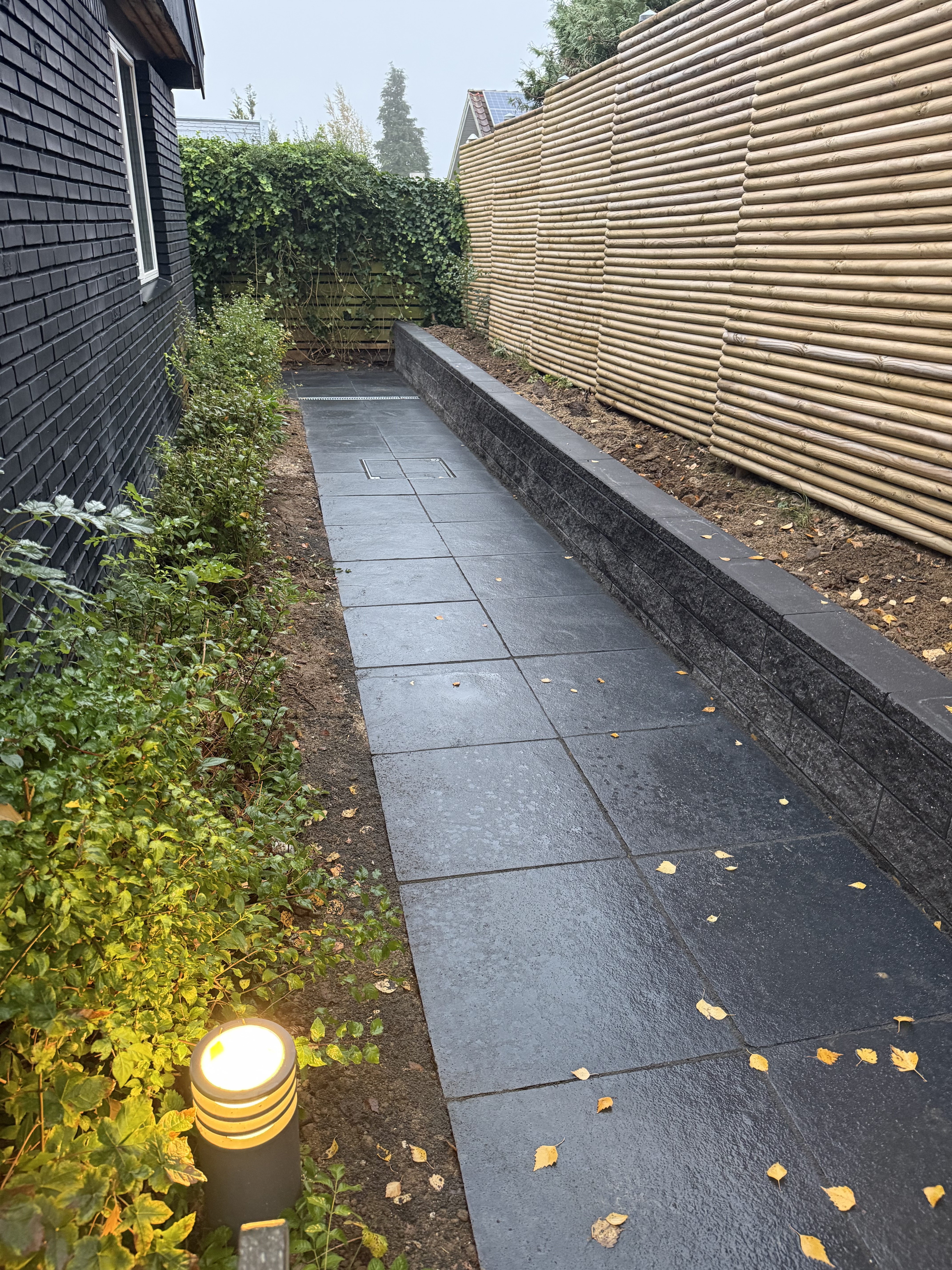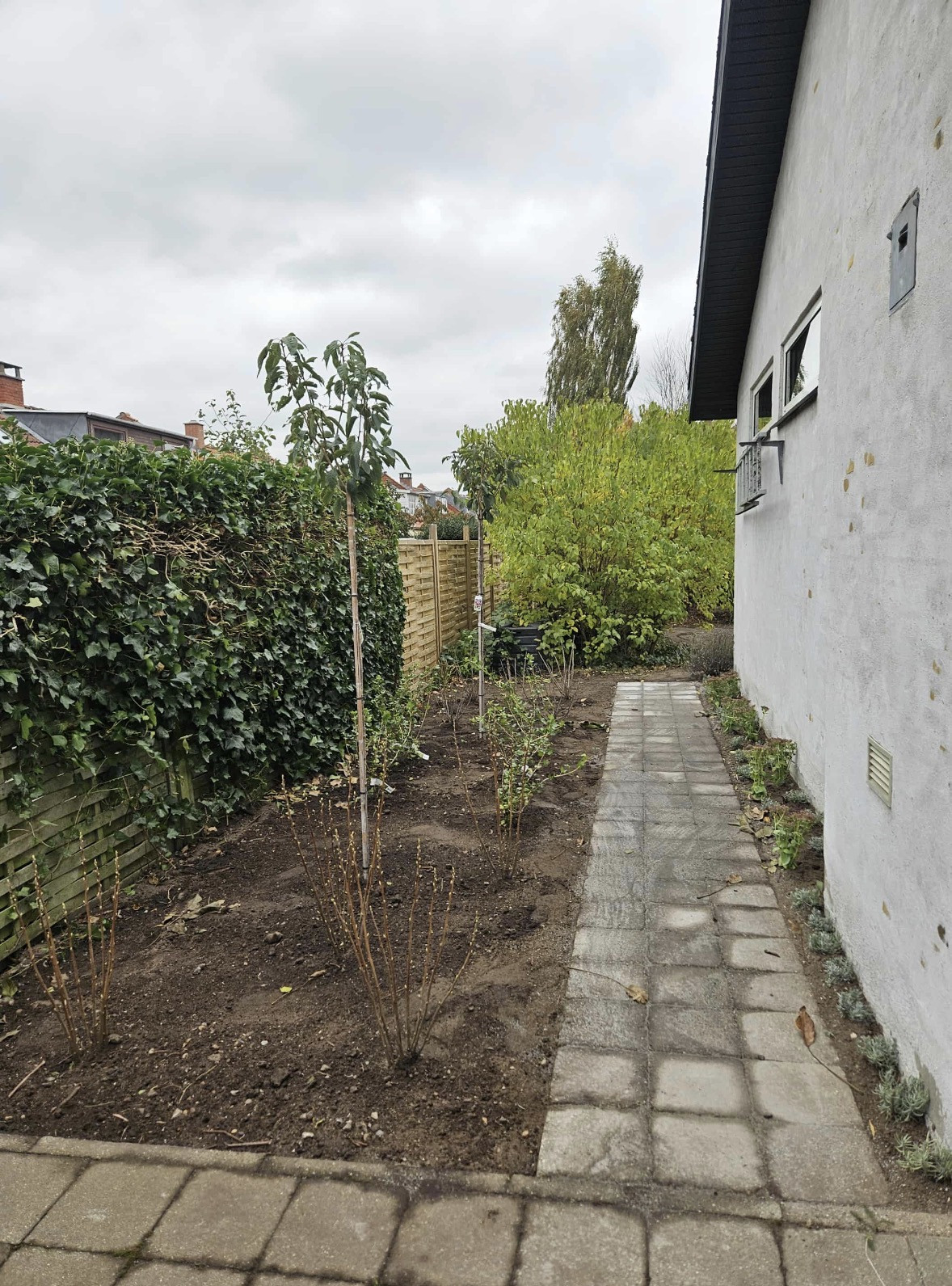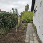 Vi skulle have fjernet eksisterende beplantning i forhave og lagt fliser, samt opsat hegn.
