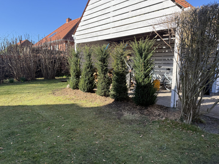 Vi har fået udført en ny stor flot terrasse med skifferfliser samt planter ny færdighæk mod vores nabo.