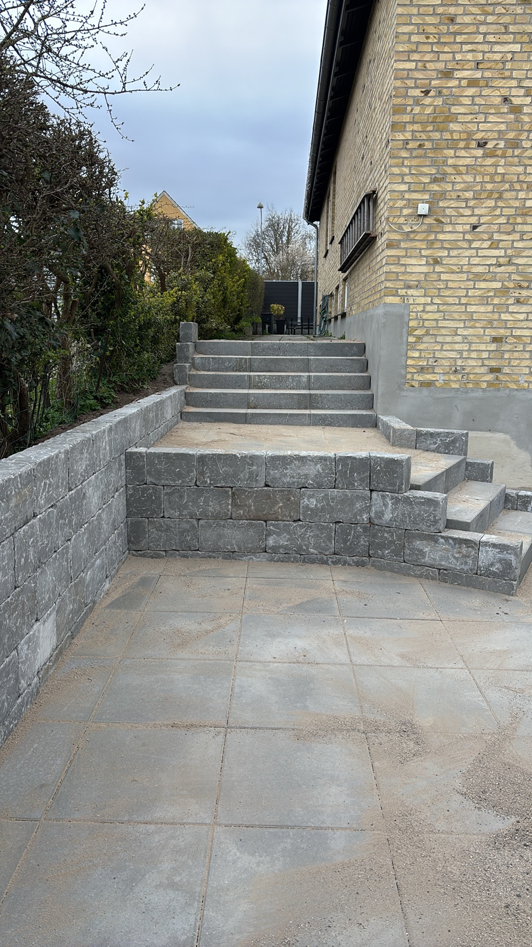 Vi skulle have udvidet og hævet parkering til to biler, fliser hele vejen rundt om huset, ny trappe, støttemur, og omrokering af buske og planter.