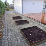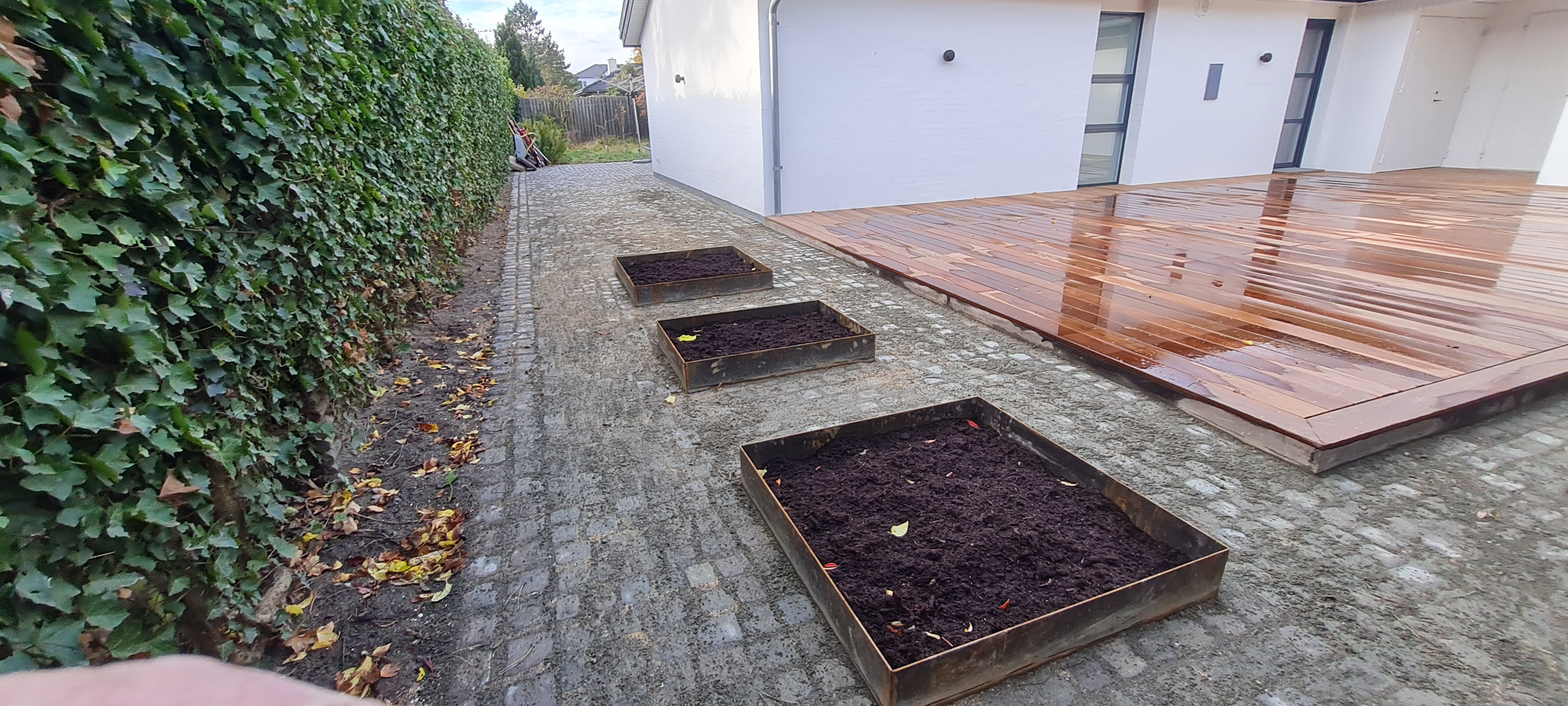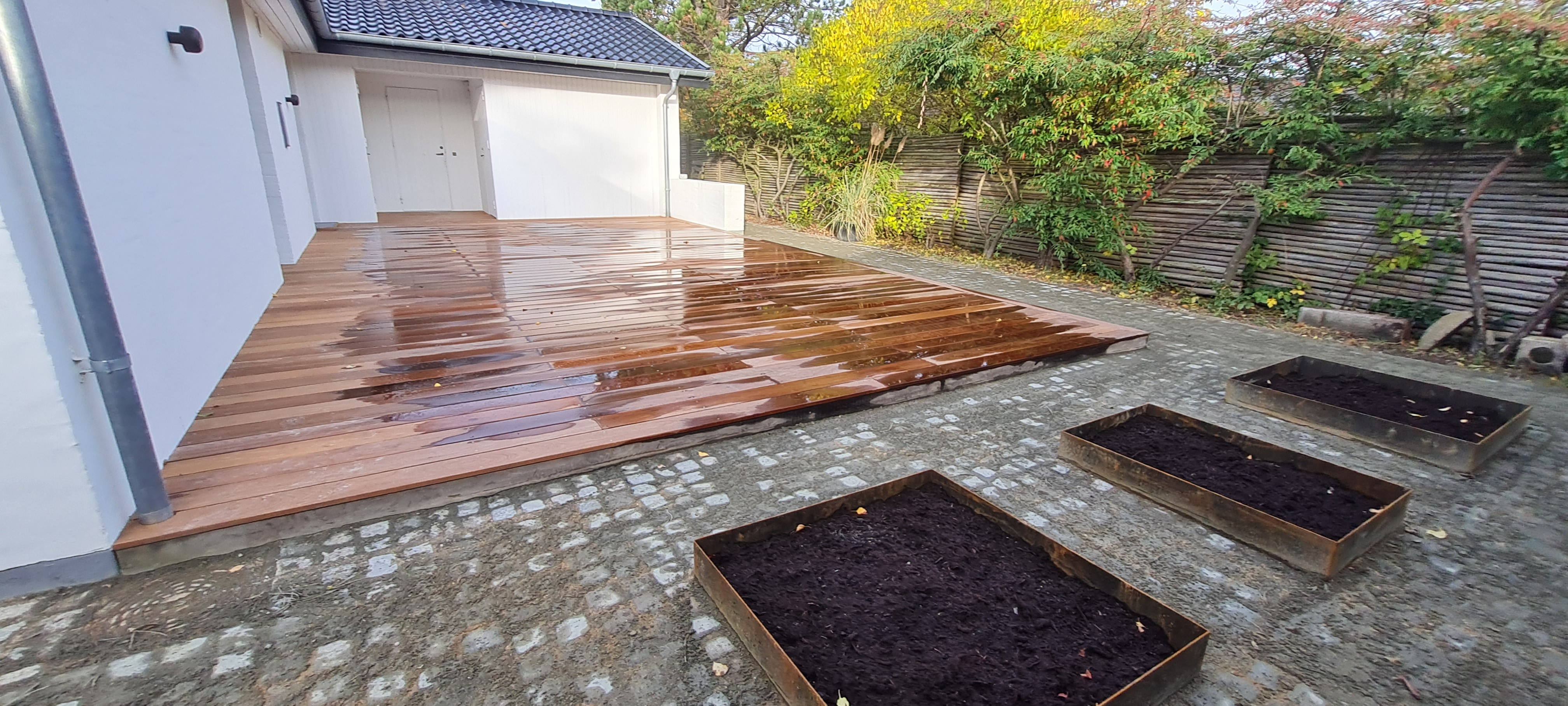 Det har været en rigtig god oplevelse for os i TRÆ & BUSK at anlægge chaussestens-havegange og terrasse, brostensindkørsel og hårdttræ-træterrasse. Vi ser frem til, at se det hele igen og gå anlægget igennem efter vinteren. Vi retter naturligvis evt. fejl, som vinterens frost kan have forårsaget.
