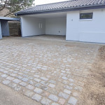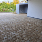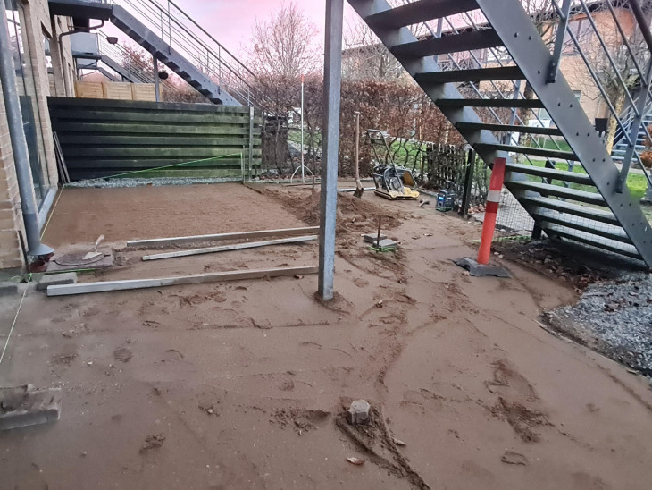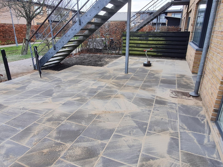 Tre granitblokke foran entrédør. Underlag planeret og belægningssten tilpasset.