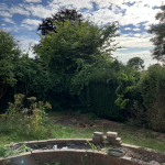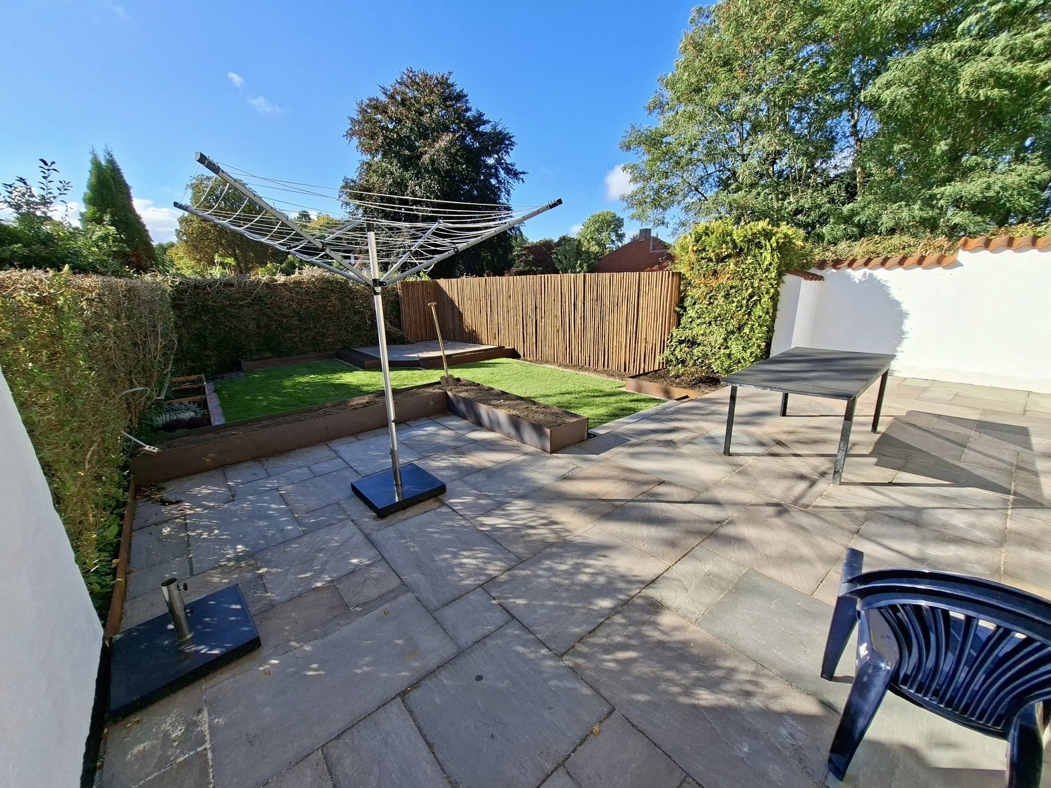 En masse ting i vores have: nedgravet trampolin, anlagt terrasse, stentrappe, træbænk, pilehegn, gyngestativ, bålplads, indkørsel