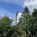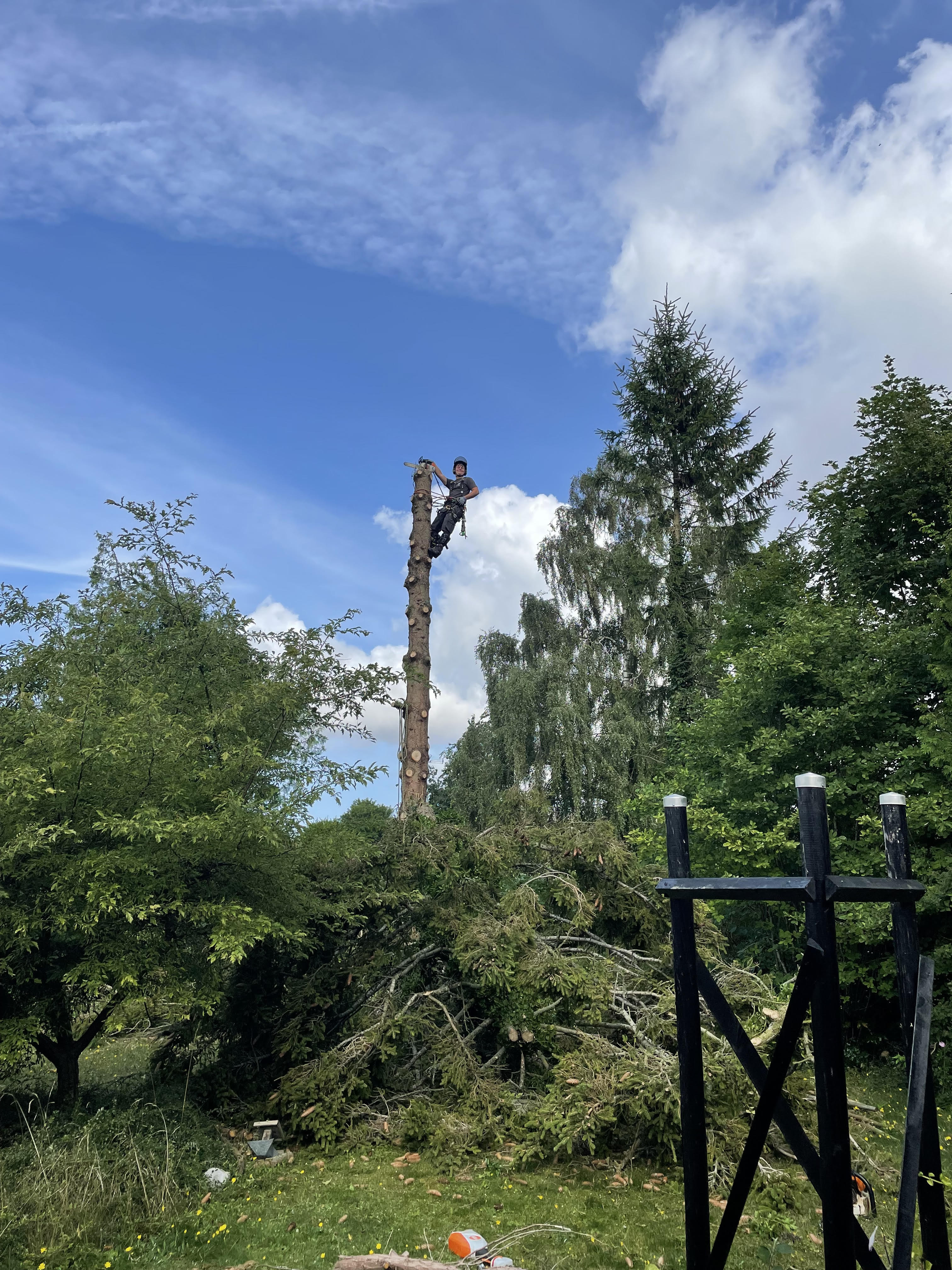 Vi havde Mathias ude og fælde hele 14 gamle grantræer, nogle af dem over 30 meter høje. Det er nu 3. gang vi bruger Lilleskov Træpleje til forskellige skovnings og træplejeopgaver, og Mathias er yderst professionel, venlig, behagelig og meget arbejdsom med alt det nødvendige udstyr til at fælde og bearbejde træerne både fra jorden og oppe i vejret.