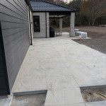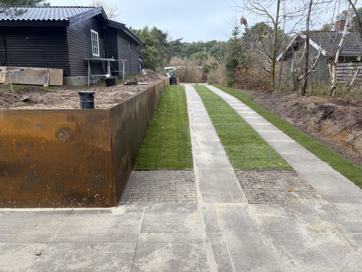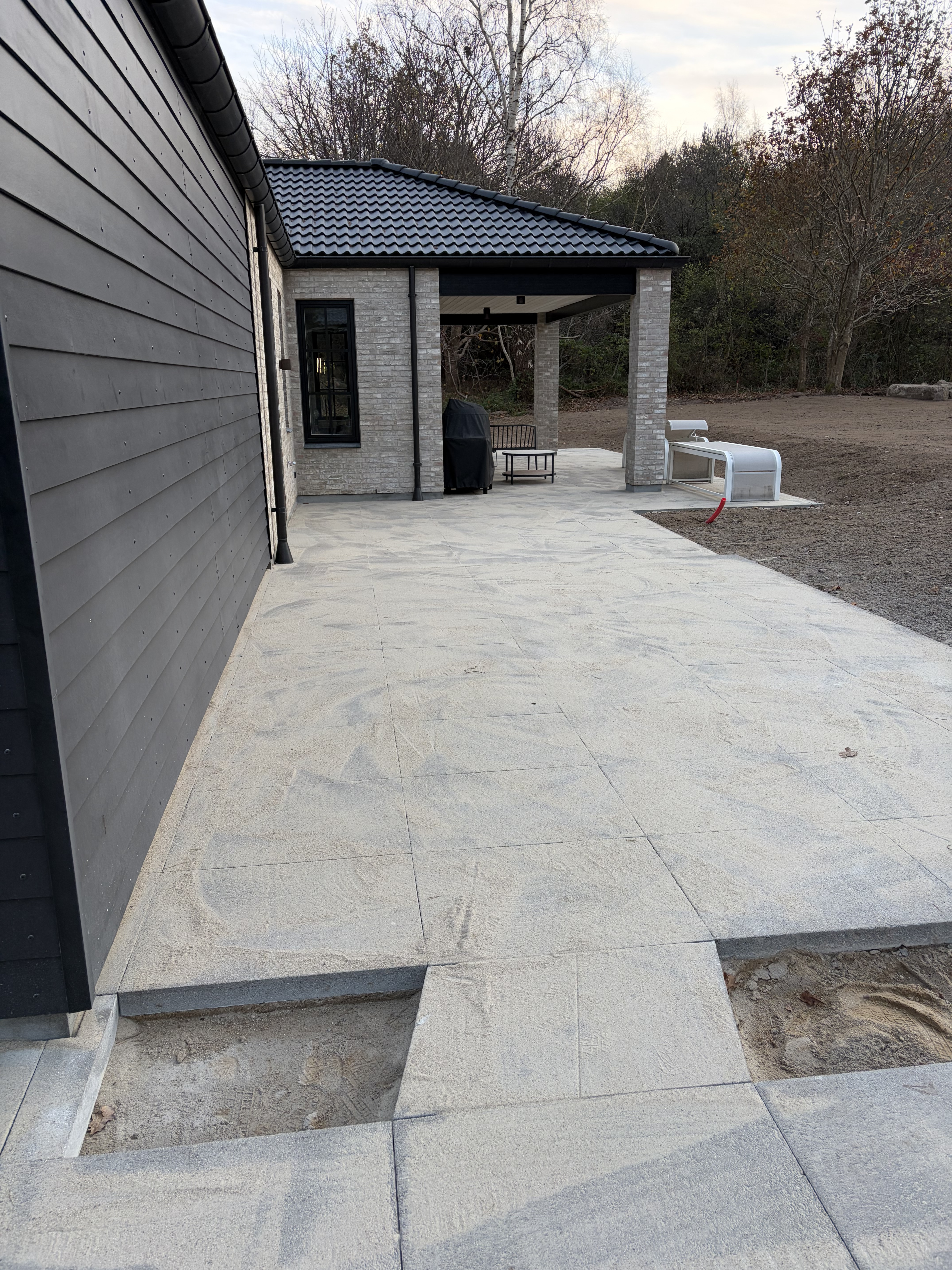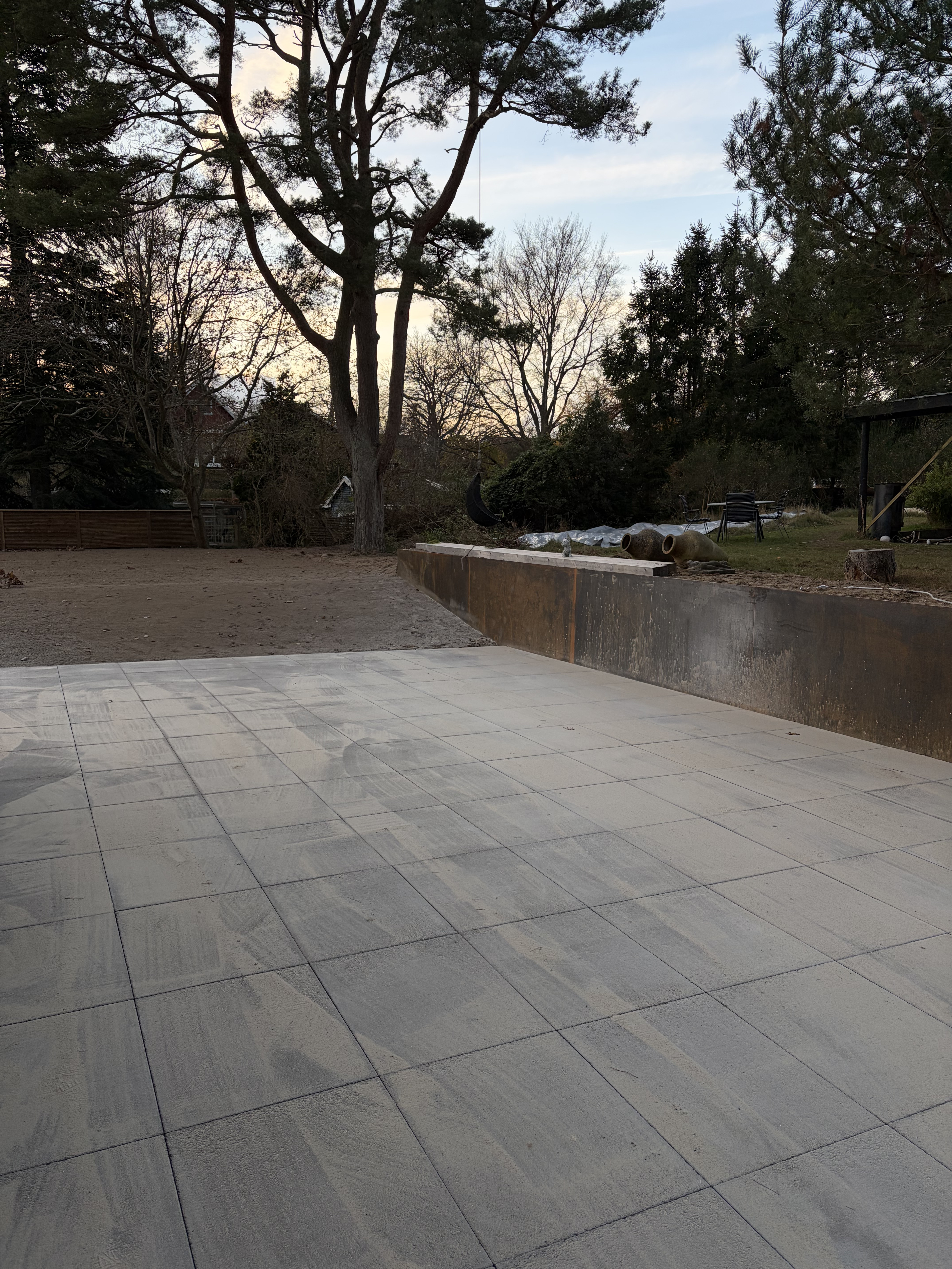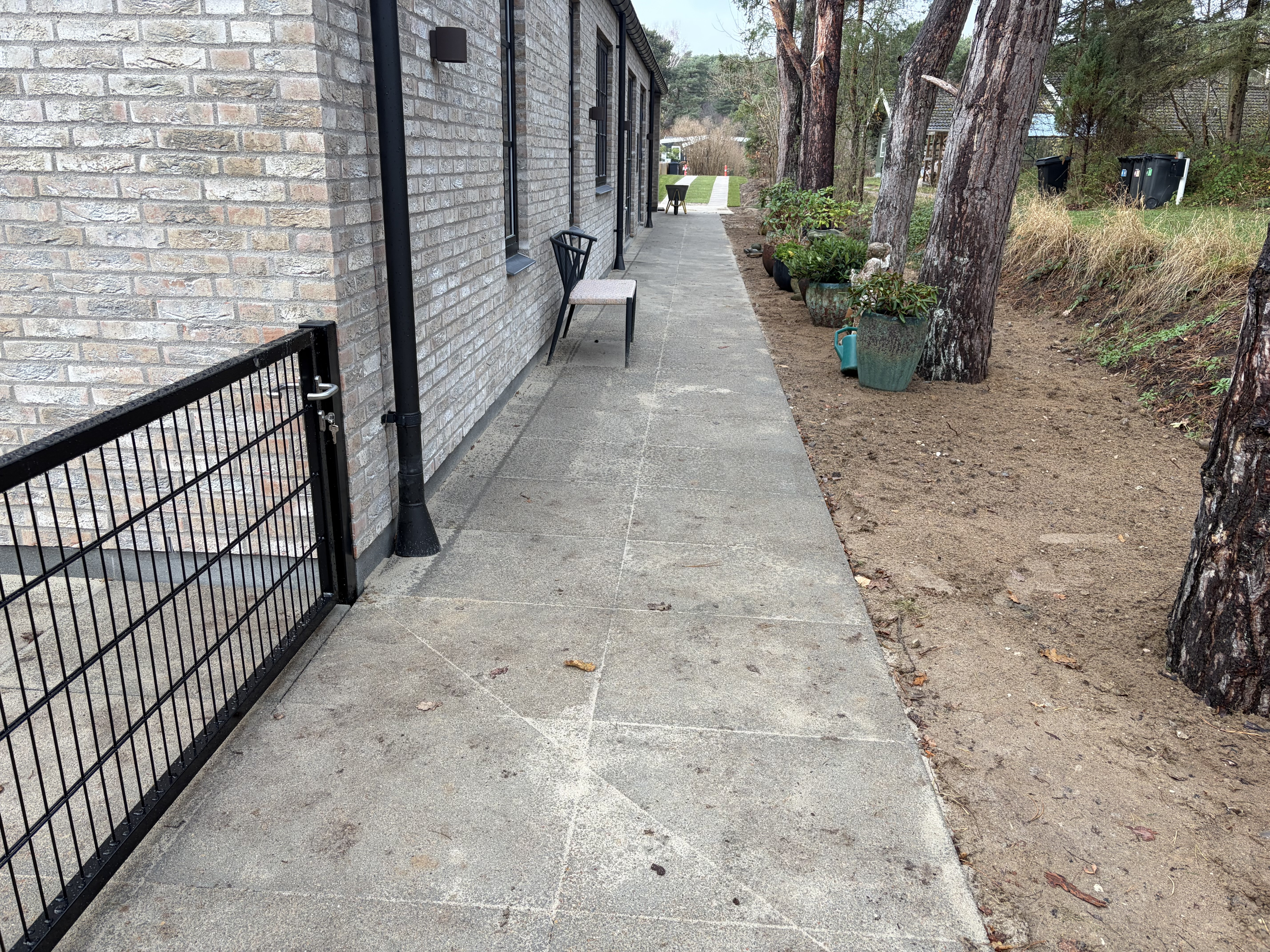Vi har fået lavet et rimeligt stort projekt med 60 x 80 cm fliser hele vejen rundt om huset. Derefter blev der sat en lang stålmur, langs den ene side i vores meget lange indkørsel. Alt udført til UG.