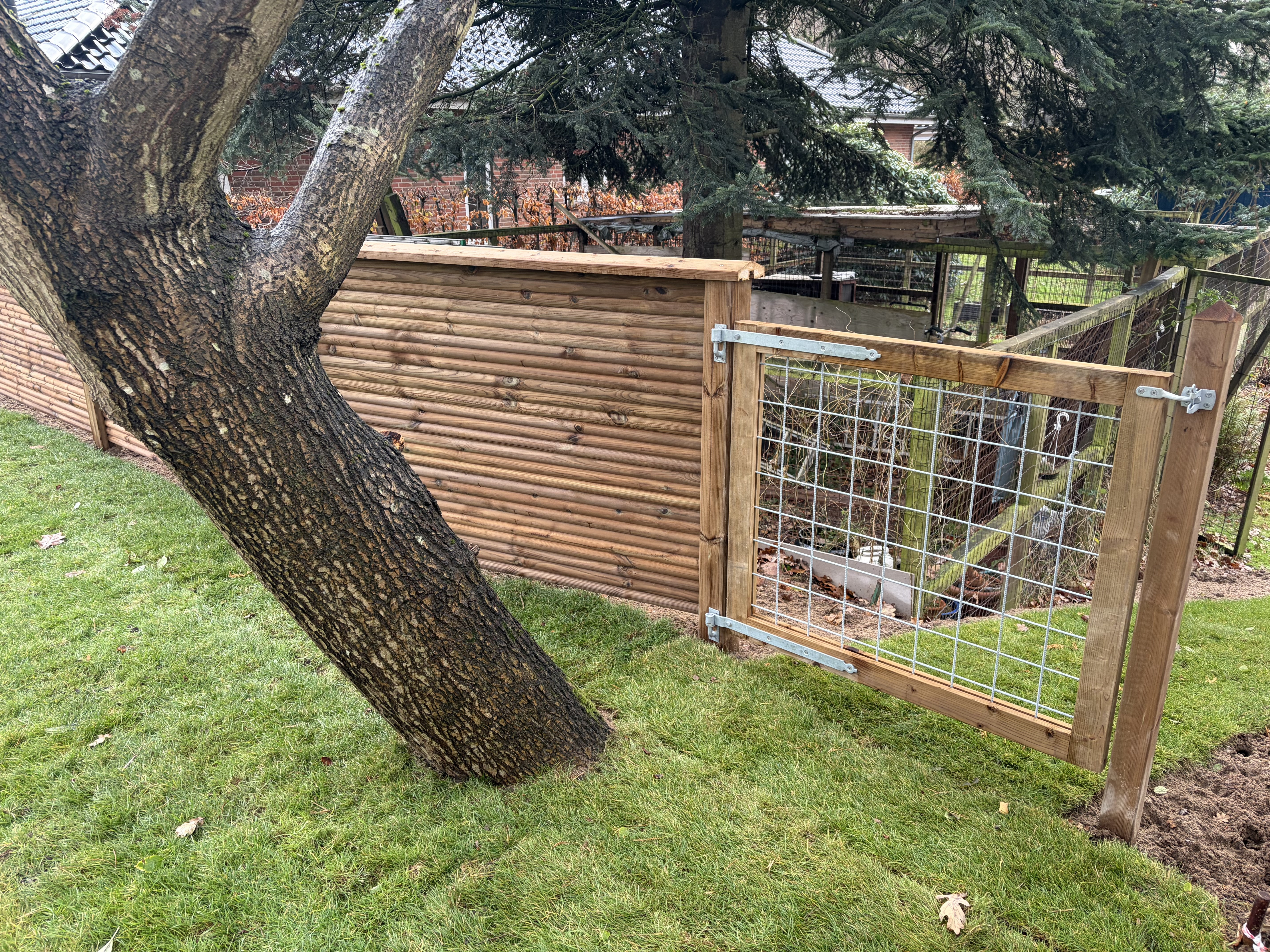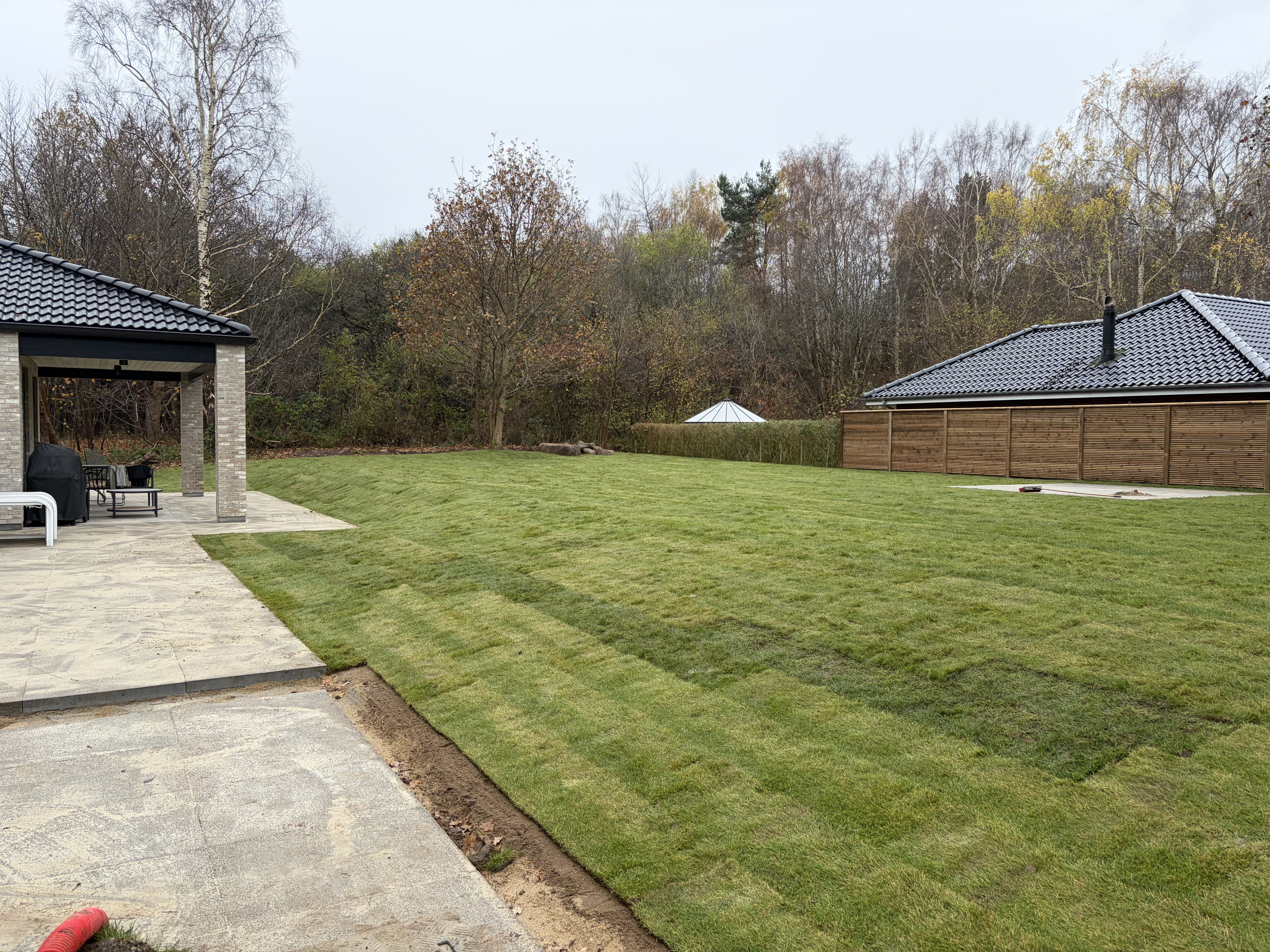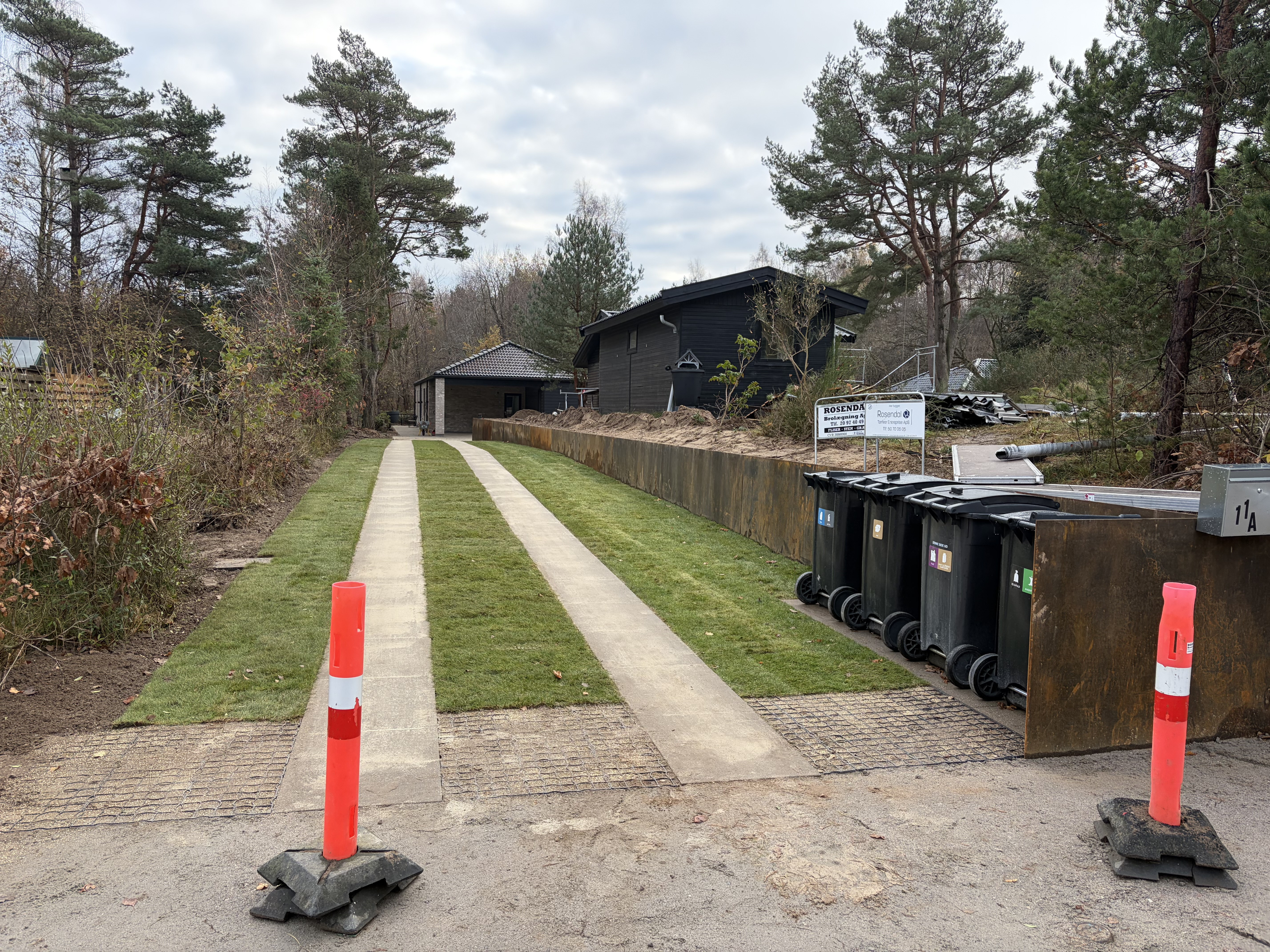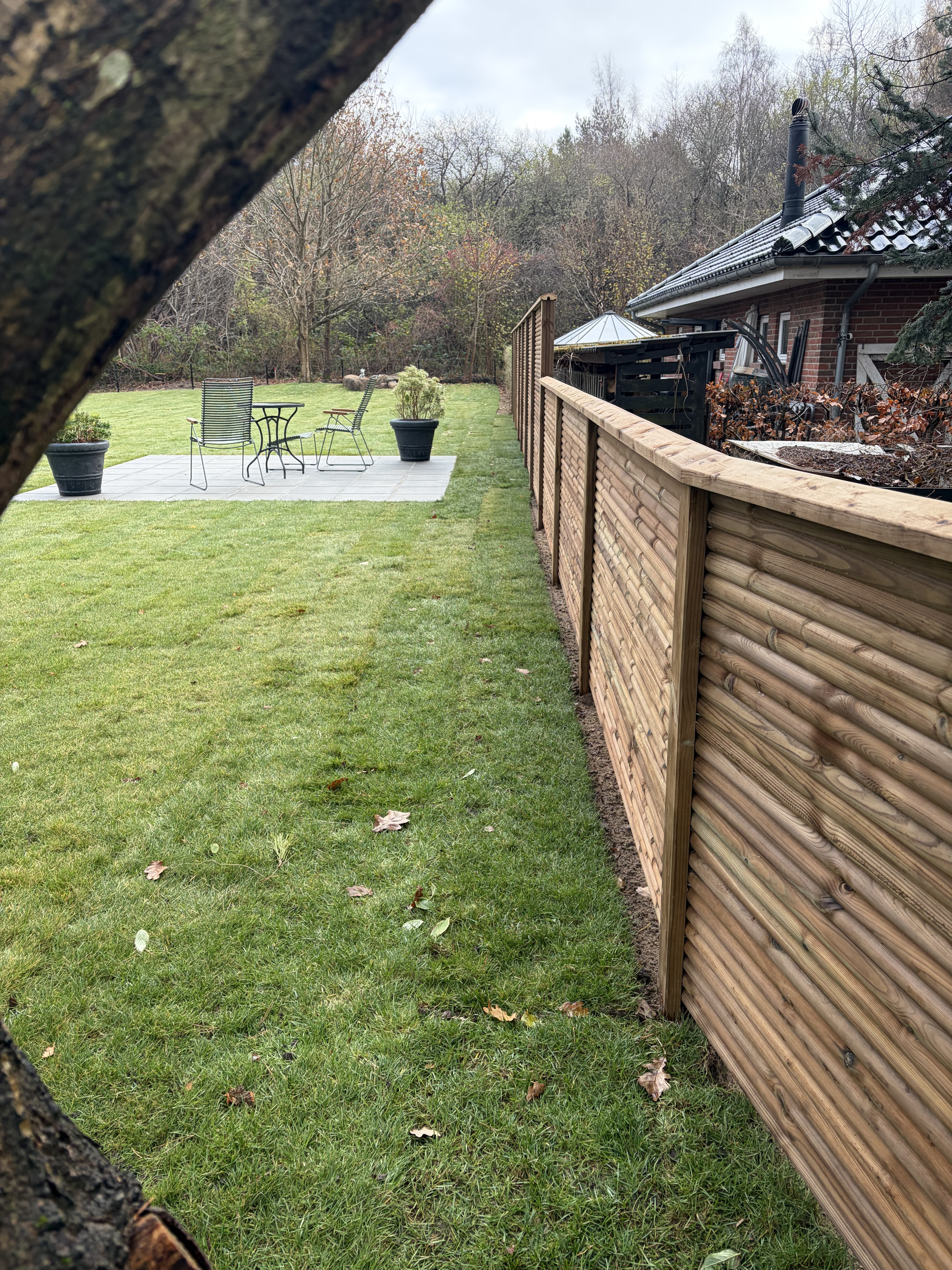 En stor bunke jord fra husbyggeriet blev siet og planet ud så der var klar til rullegræs. Hegn vi selv havde købt hjem påtog Rosendal sig også at sætte, for os. Endda to forskellige hegn :-)
