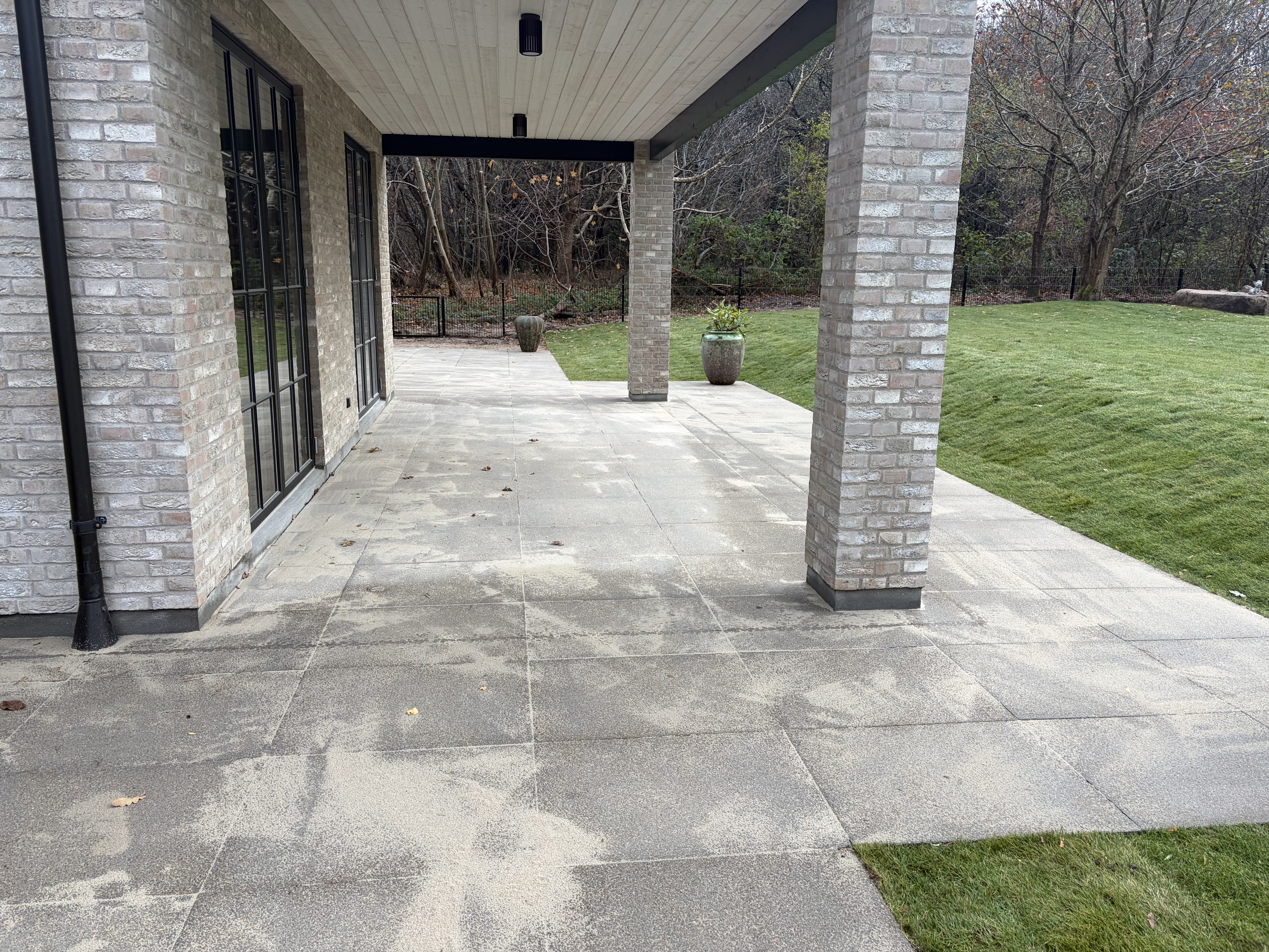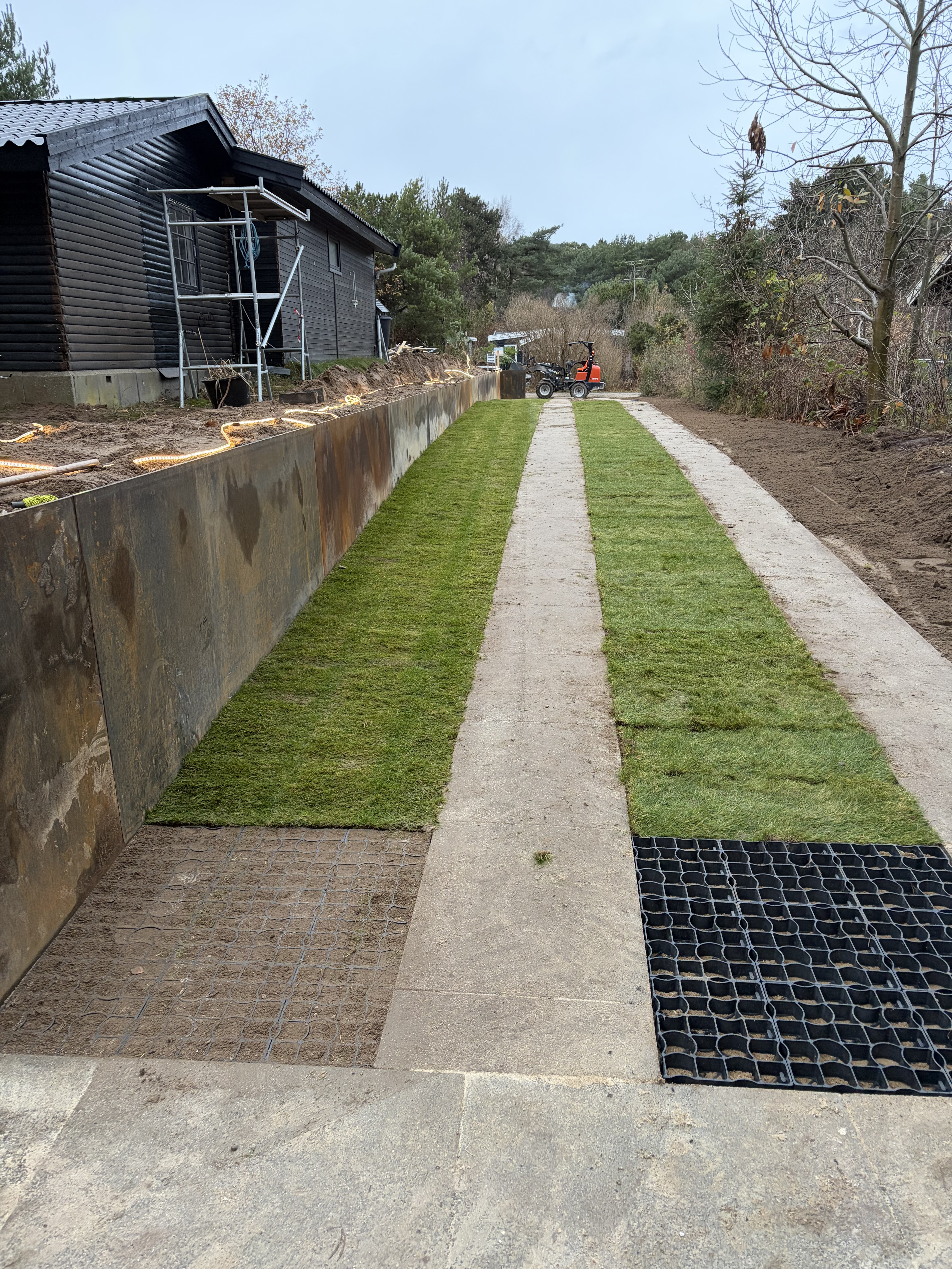 Der blev lagt fliser på "vendepladsen". De samme som de lagde i første omgang rundt om huset. De fliser er for øvrigt nogle Martin Rosendal foreslog og som vi er rigtig glade for, at vi valgte at sige ja til. De blev også lagt som kørespor igennem hele indkørslen hvorefter der blev lagt rullegræs på alle sider af fliserne samt i hele haven.