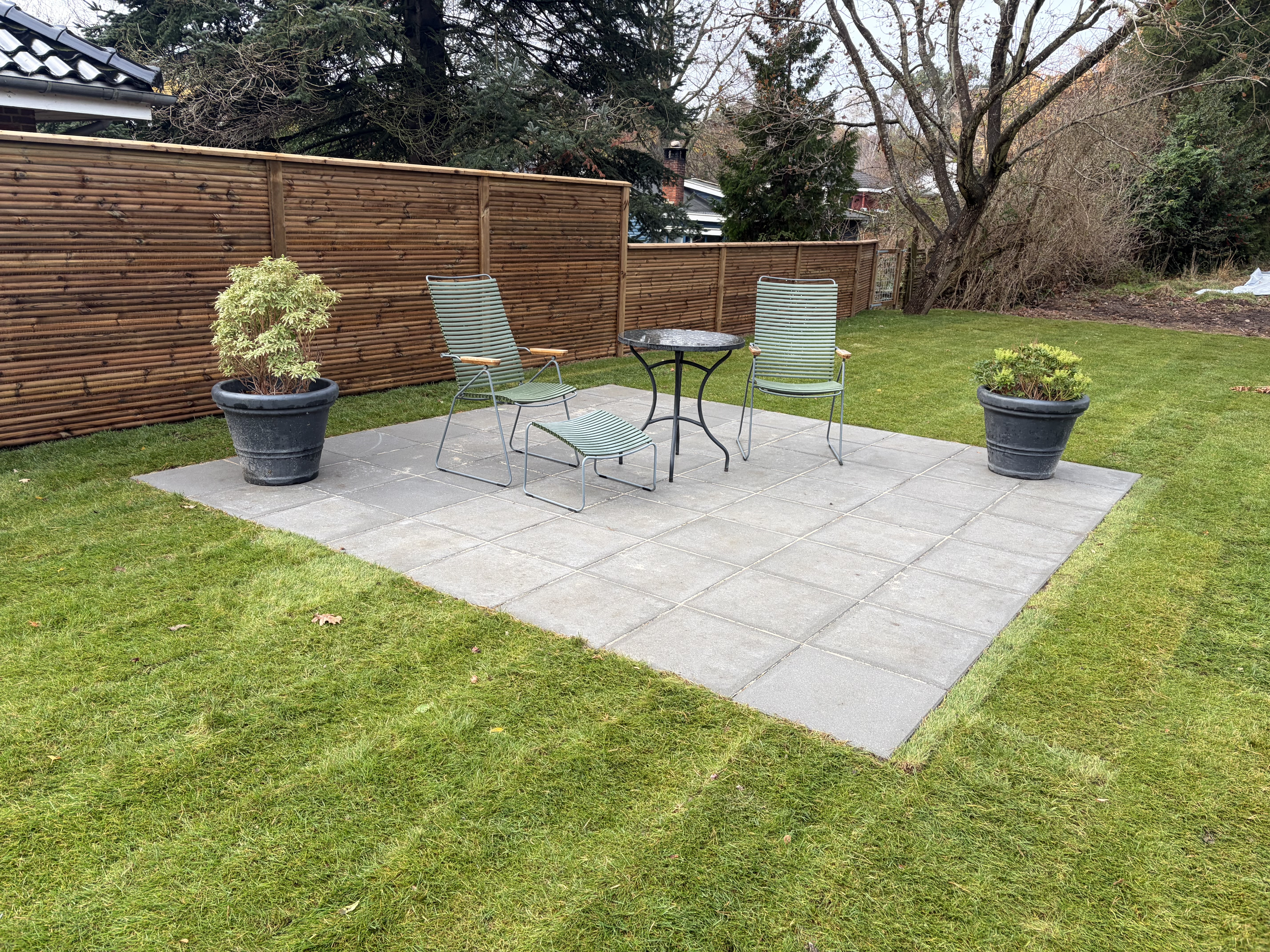 Vi har fået anlagt en smuk støttemur, ny trappe, græsplæne og hæk, og resultatet er blevet helt fantastisk.