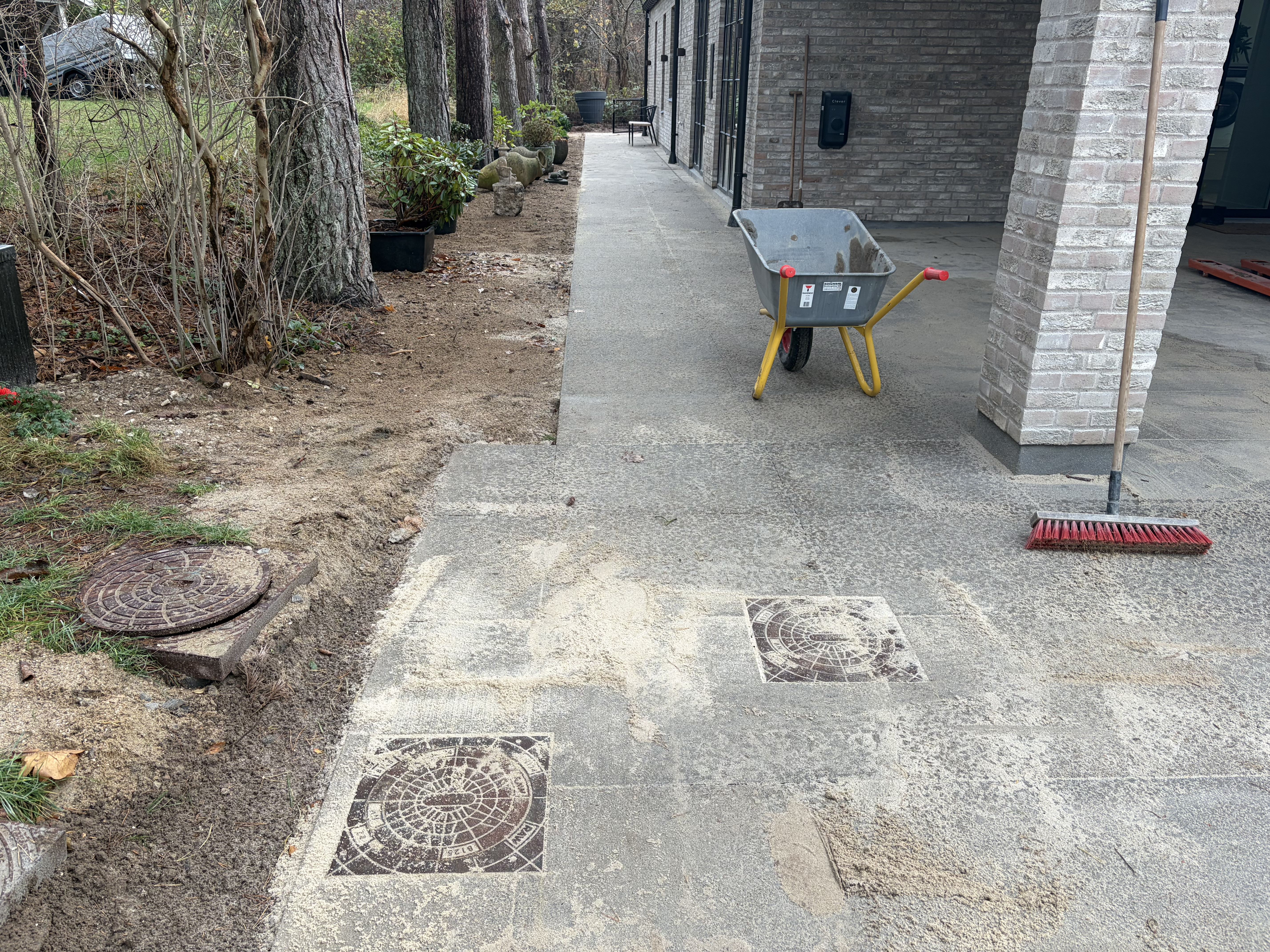 Fjernelse af jord, stabil grus ,sand lagt og stampet. Fliser lagt. God oprydning.