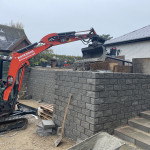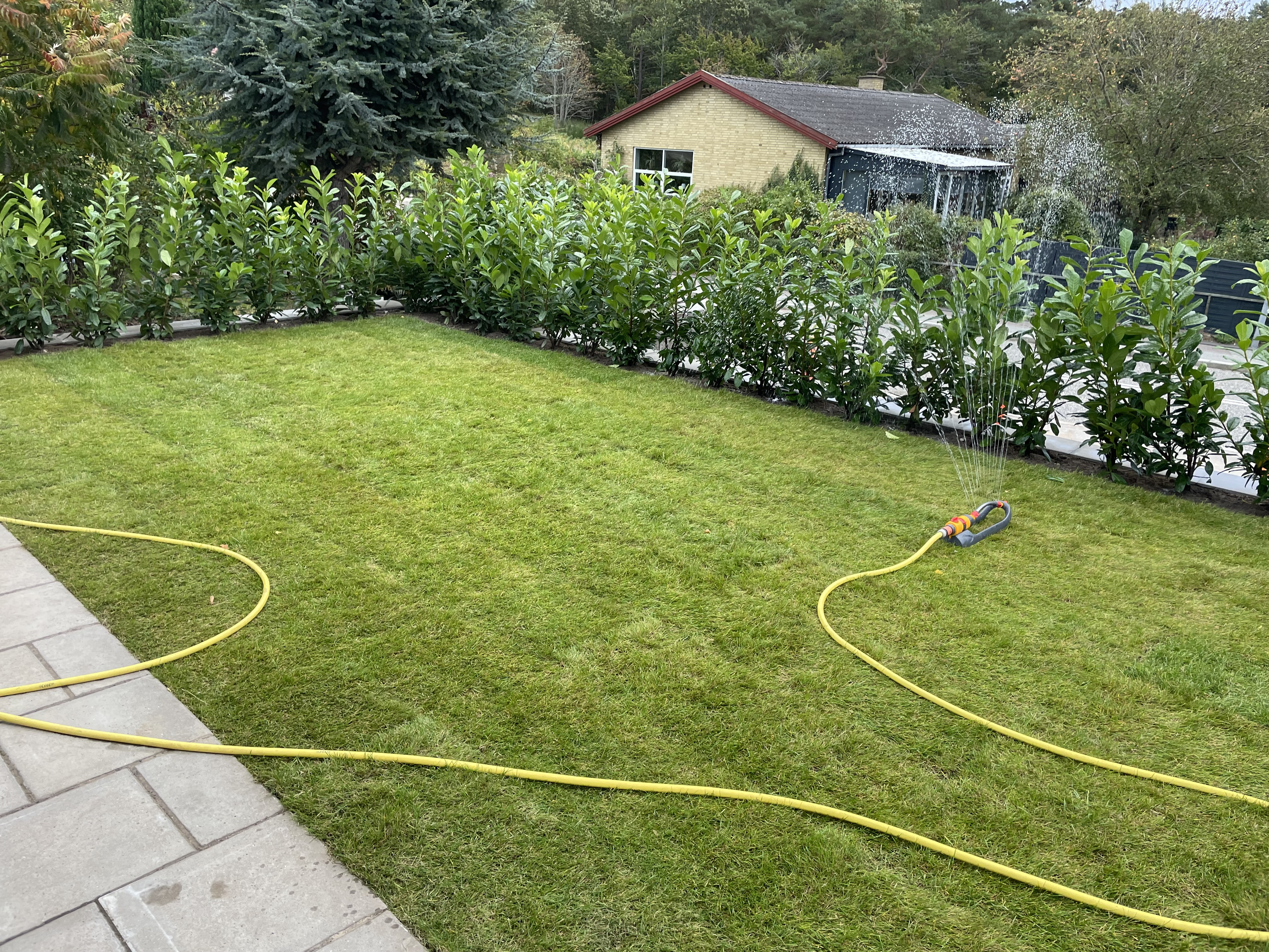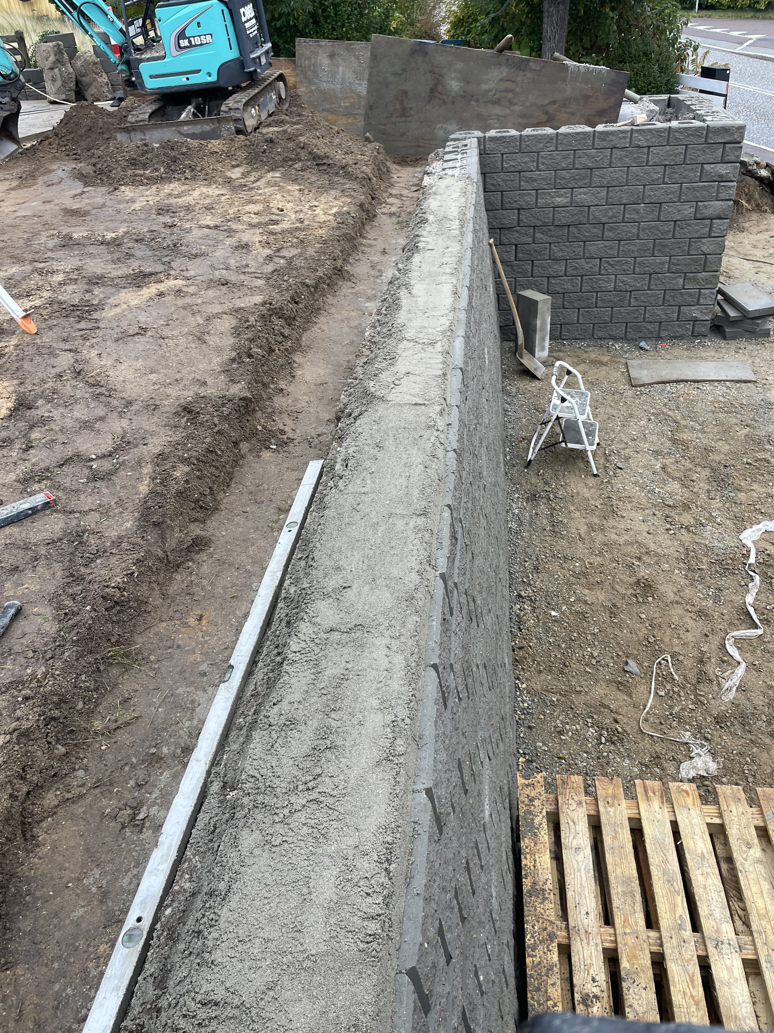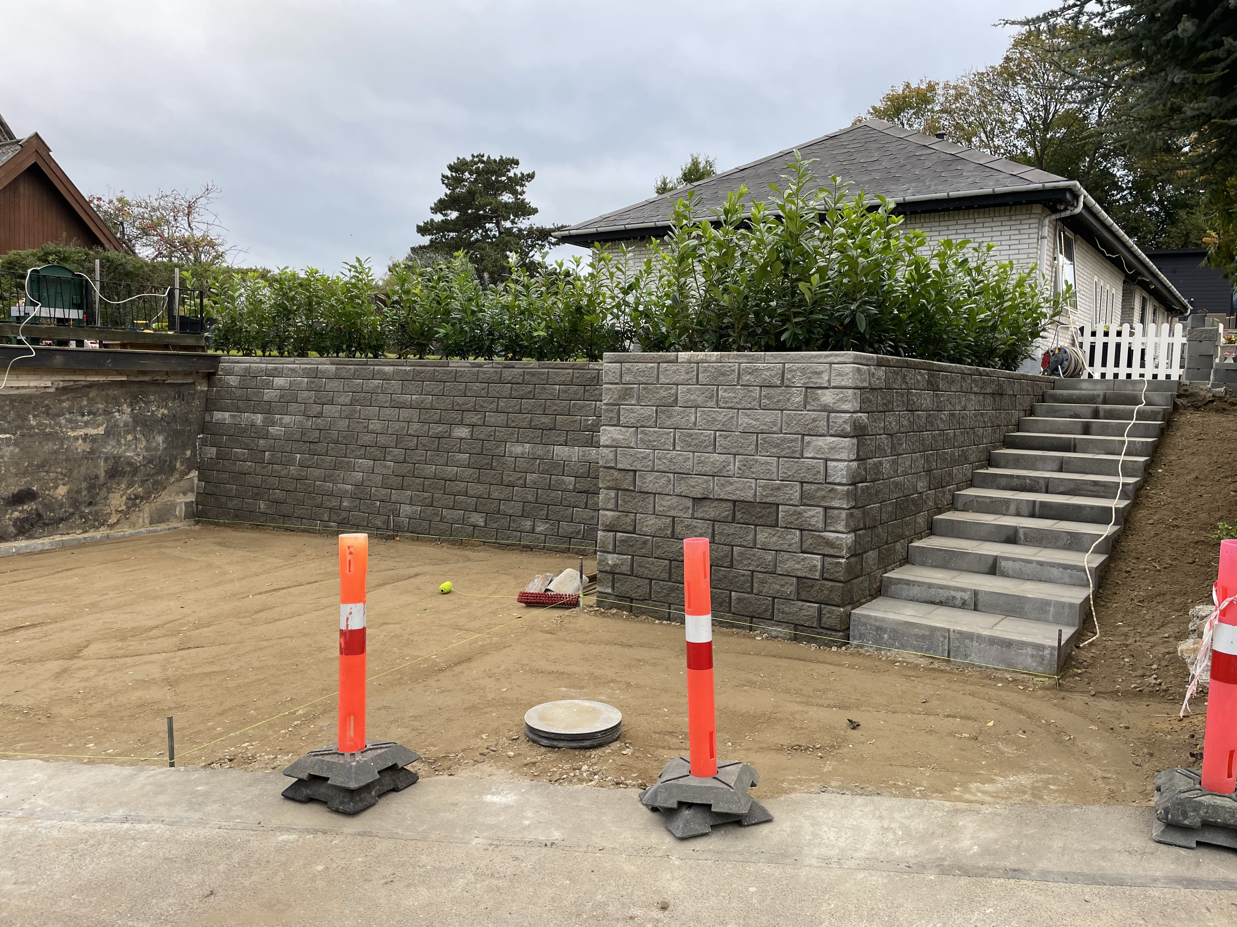 Vi har fået anlagt en smuk støttemur, ny trappe, græsplæne og hæk, og resultatet er blevet helt fantastisk.