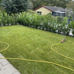 Denne gang er der fjernet små fliser og grus og pålagt jord i en tidligere indkørsel. En skråning som har været bevokset med buske er gjort klar til såning af græs og plantning af frugttræer.