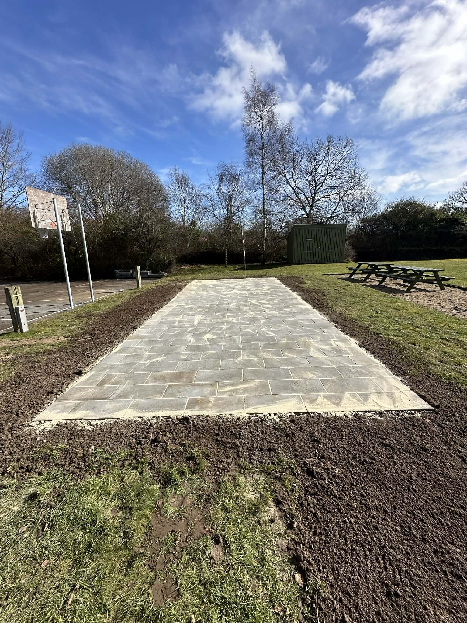 Grave arbejde i græsplæne og flise belægning for kabellægning imellem udendørs belysning. Genetablering af græsplæne og flisebelægning på Hundested skole