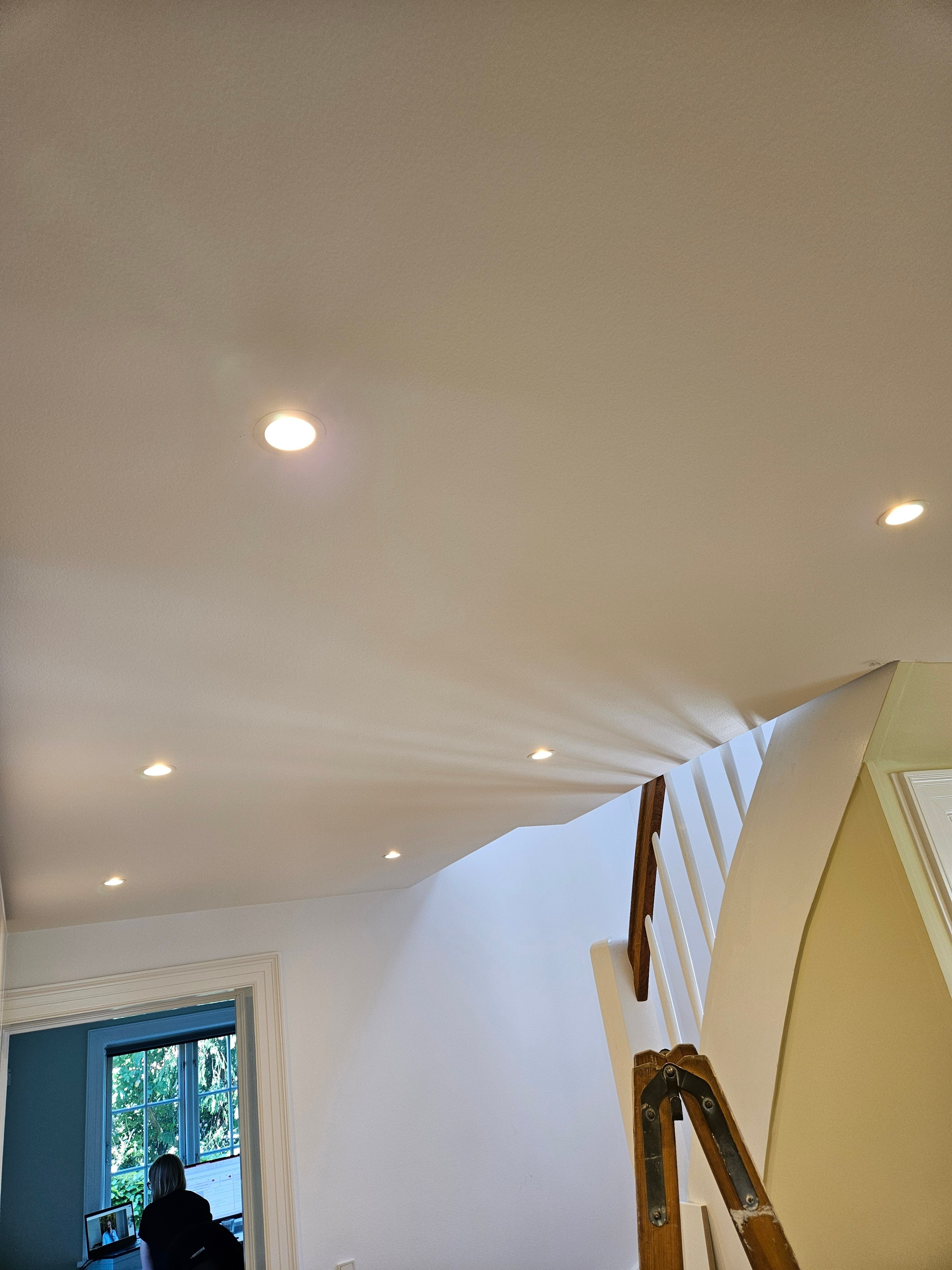 Vi fik opsat en lampe i vores nye ovenlysvinduer. Jim fra El-Korpset ordnede samtidig nogle ledninger på loftet til de elektriske vinduer uden beregning.