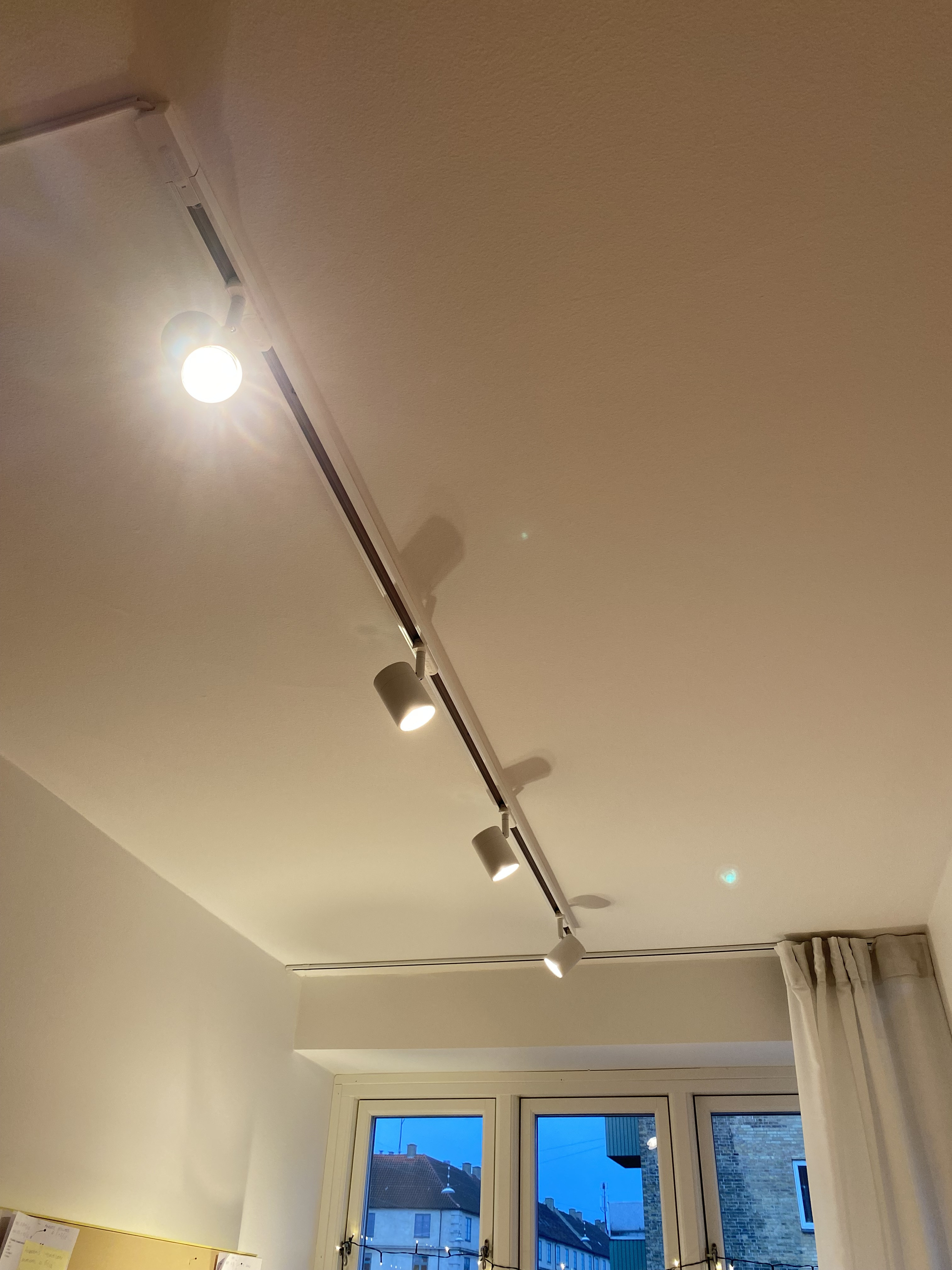 Vi fik opsat en lampe i vores nye ovenlysvinduer. Jim fra El-Korpset ordnede samtidig nogle ledninger på loftet til de elektriske vinduer uden beregning.