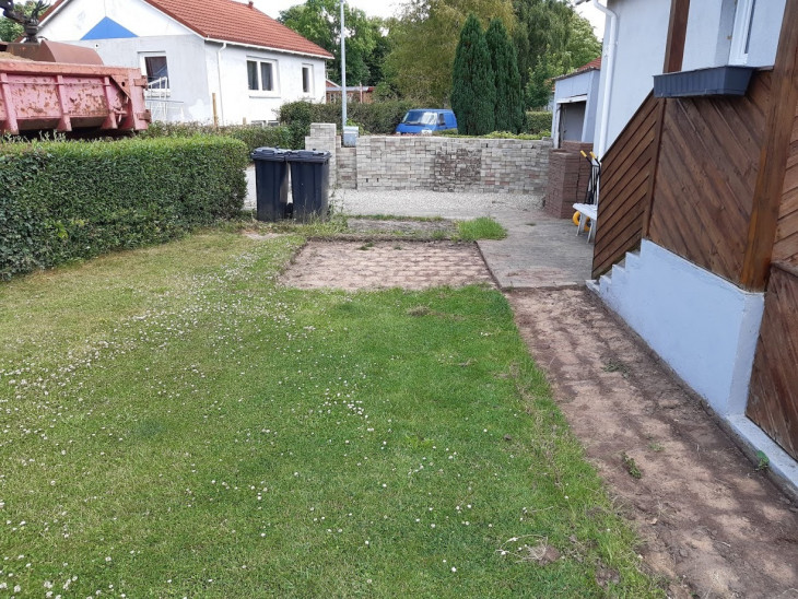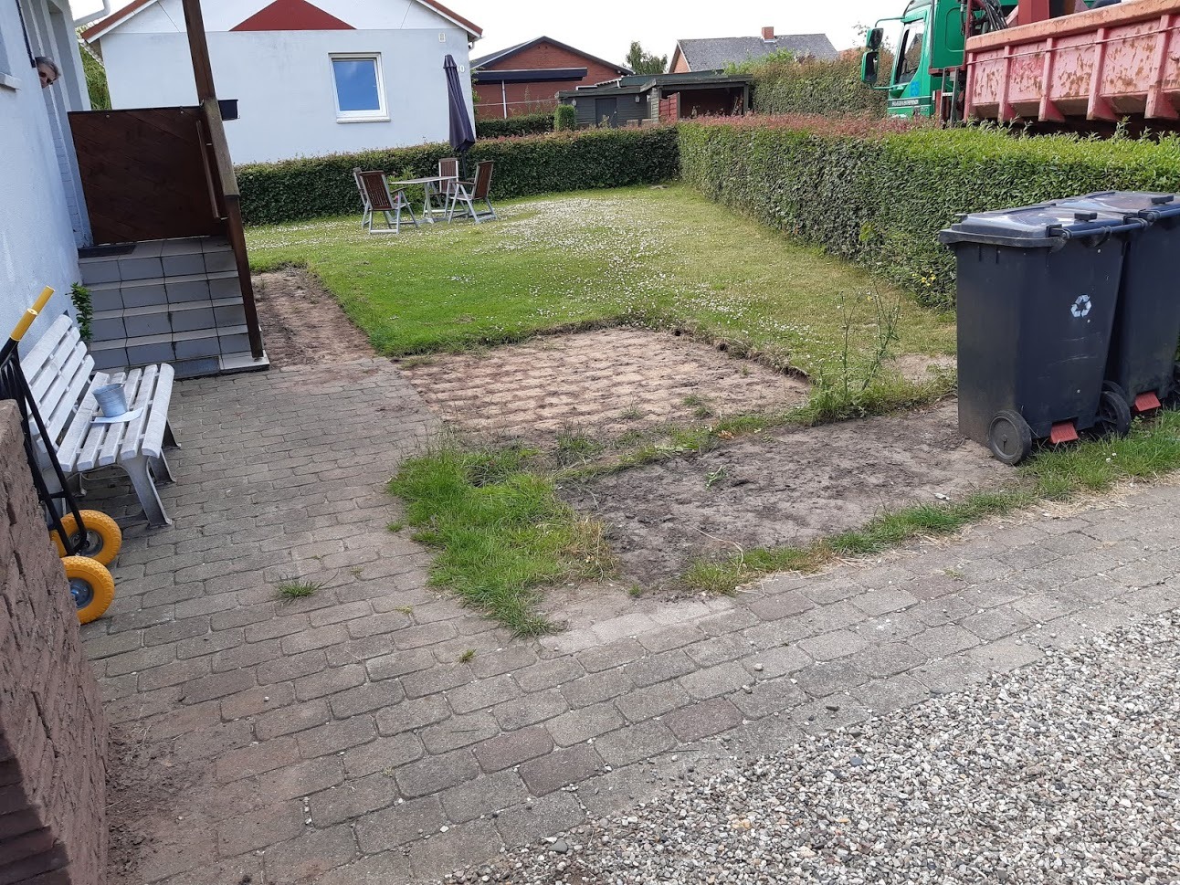 Der er lavet en udvidelse af jeres terrasse, det gav også bedre plads til havemøblerne og ny plads til skraldespandene.