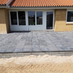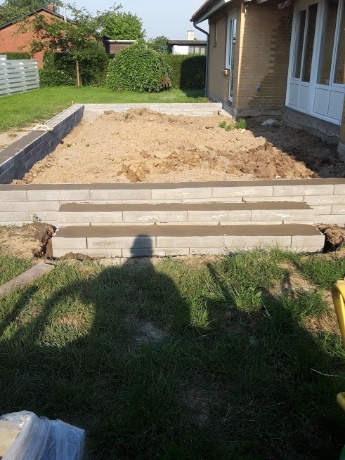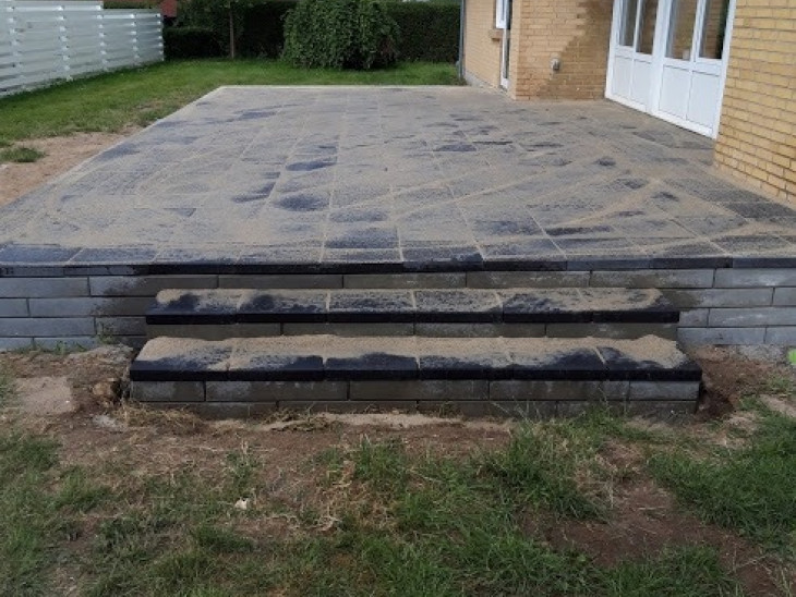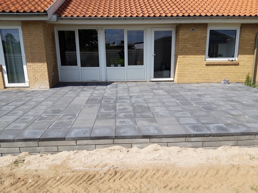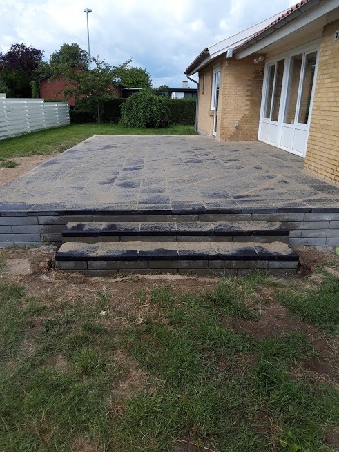 Ja man må sige at I har områdets flotteste terrasse med de flotte skalablokke som støttemur/kant omkring de flotte antracitgrå fliser.