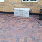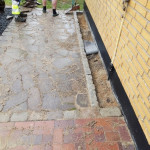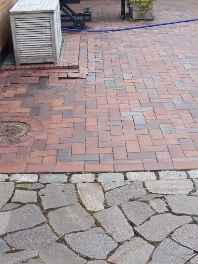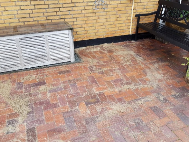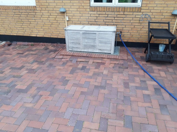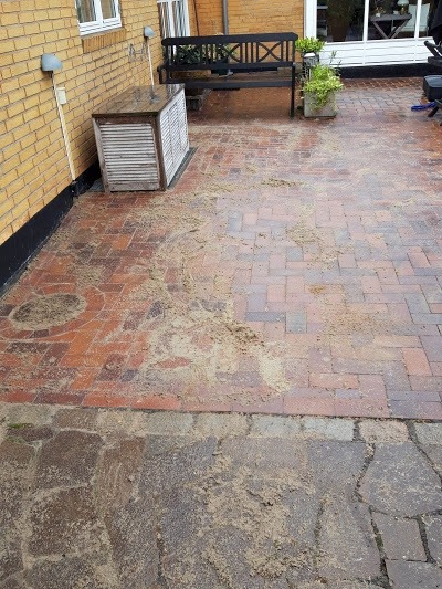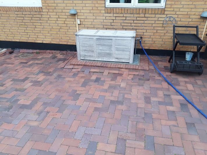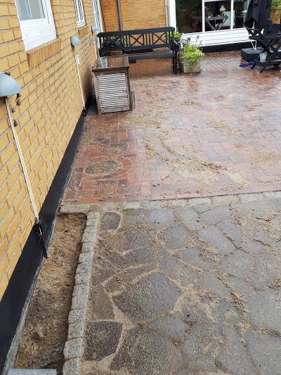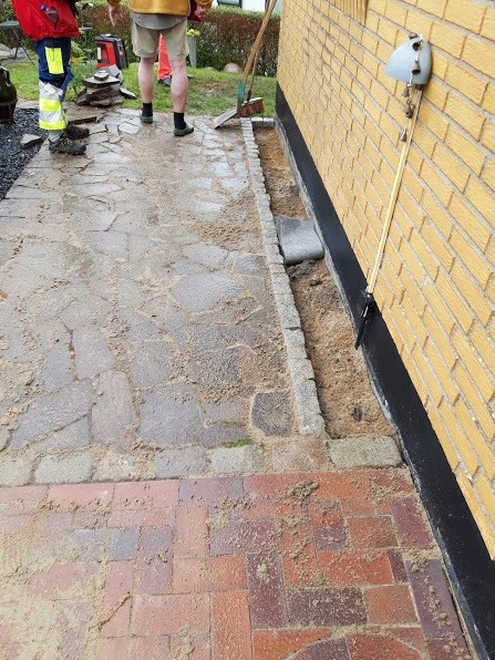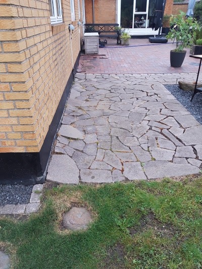 Vi fik lagt jeres terrasse om, det meste ihvertfald, da vi tog mere og mere med som vi kom fremad og så at det ville hjælpe at tage så meget med for at rette det pænt op.