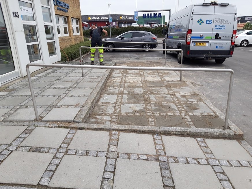 Vi fik at vide at jeres kunder var kede af de snubletrin der var ved jeres indgangsparti, det var ikke noget der lød godt og vi rykkede ud med sjakket og fik det lavet forsvarligt.