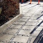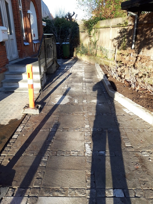 Vi har lavet en indkørsel med 50x50x8 cm grå fliser med lys grå porto chaussé sten imellem.