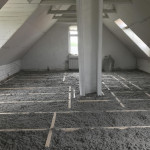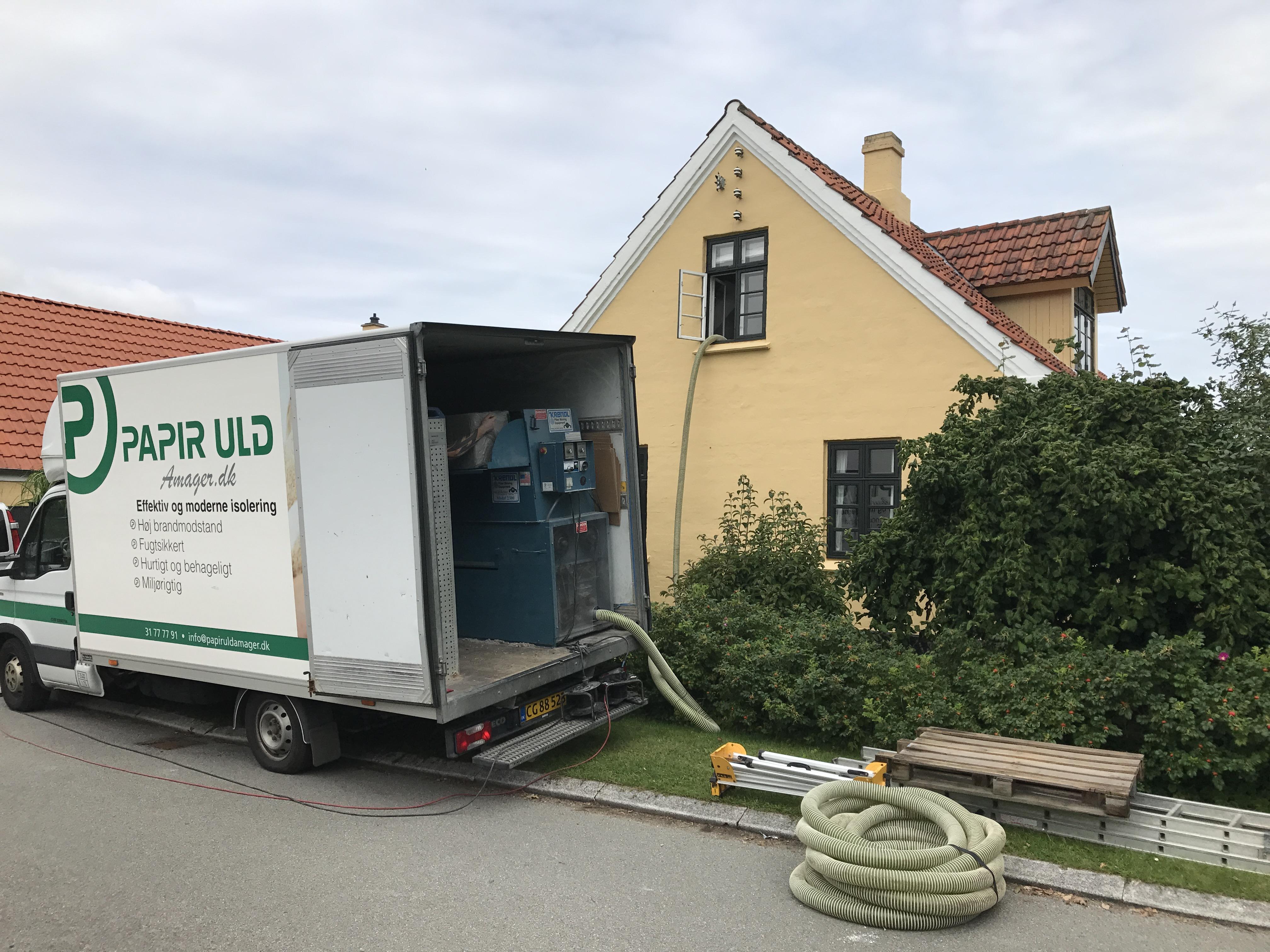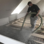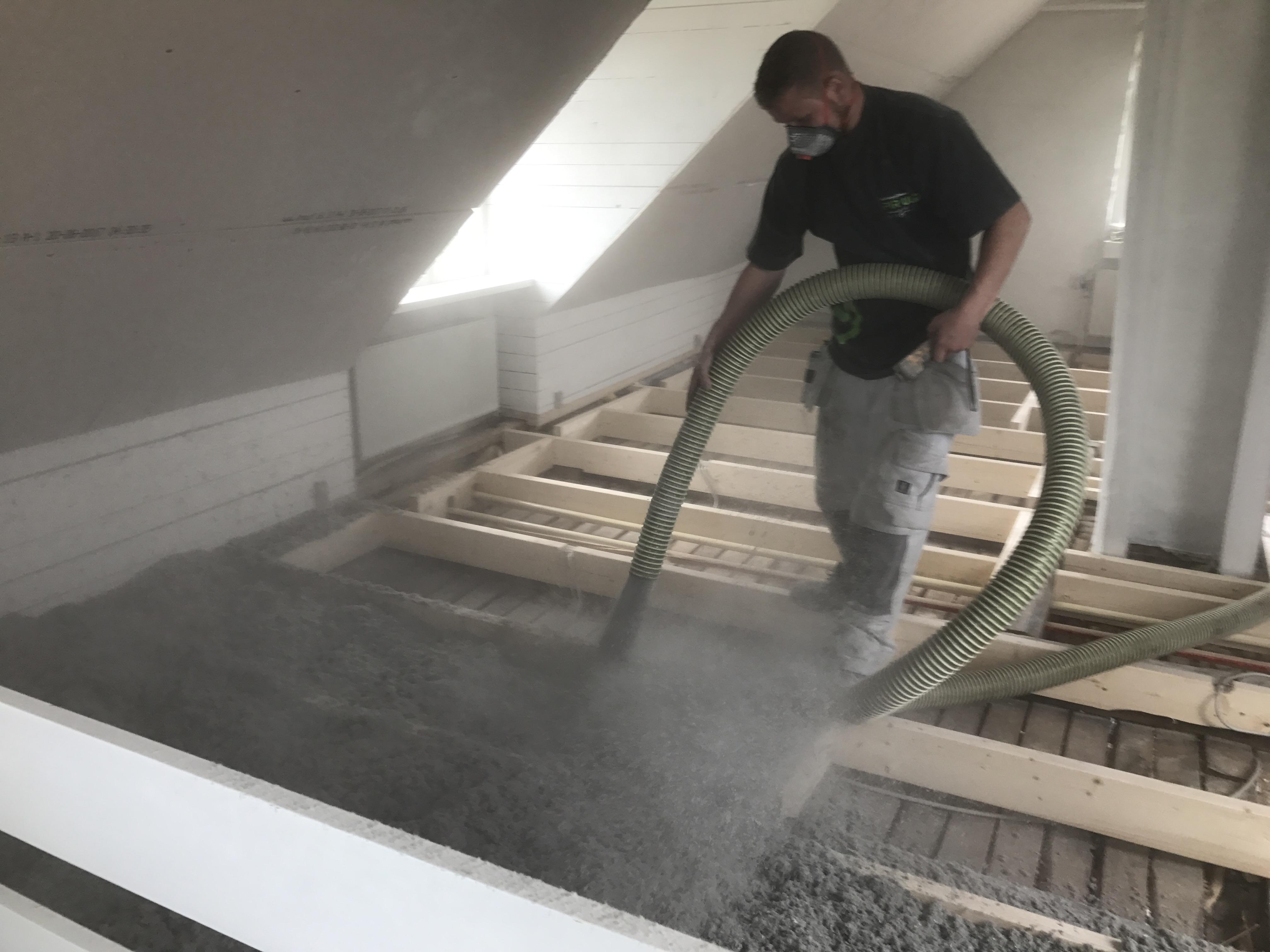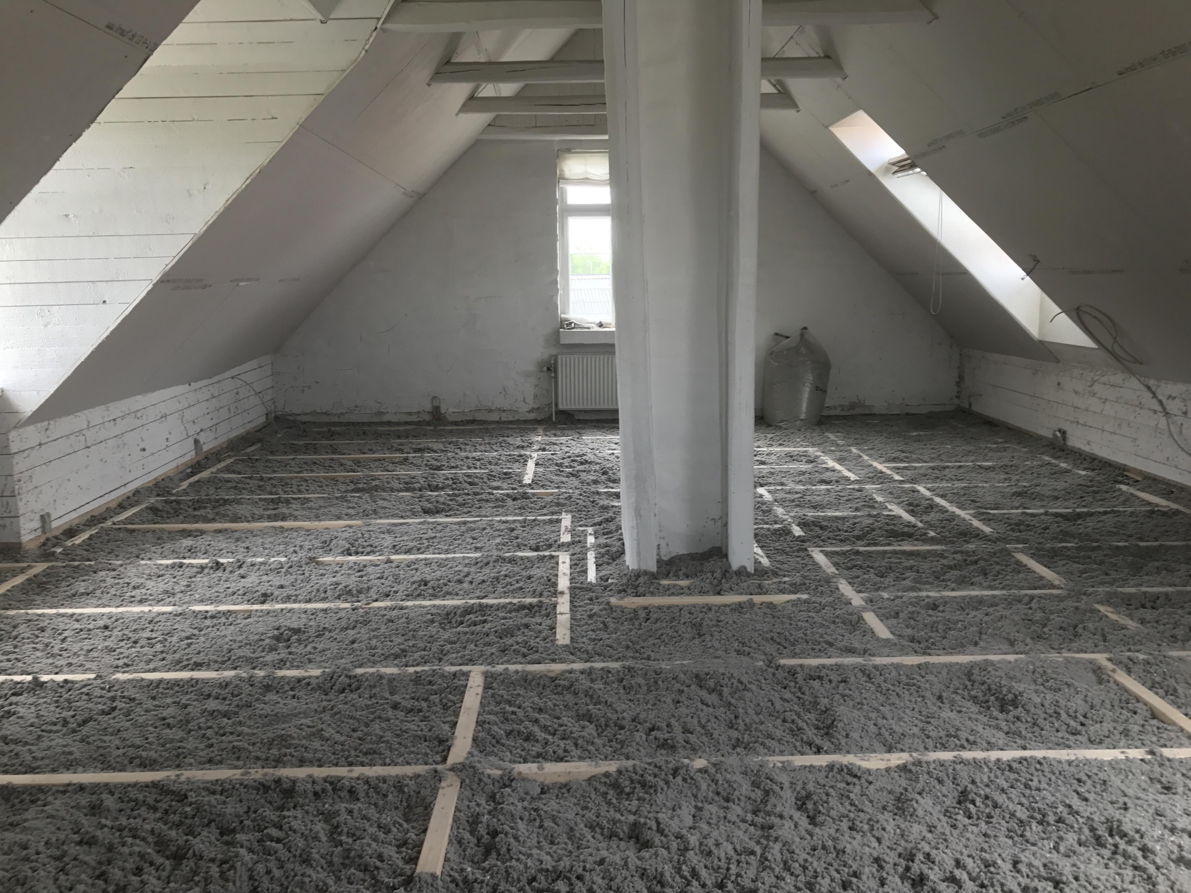 Efterisolering af åbent gulv, udført med ca. 150 mm Papiruld LYD.