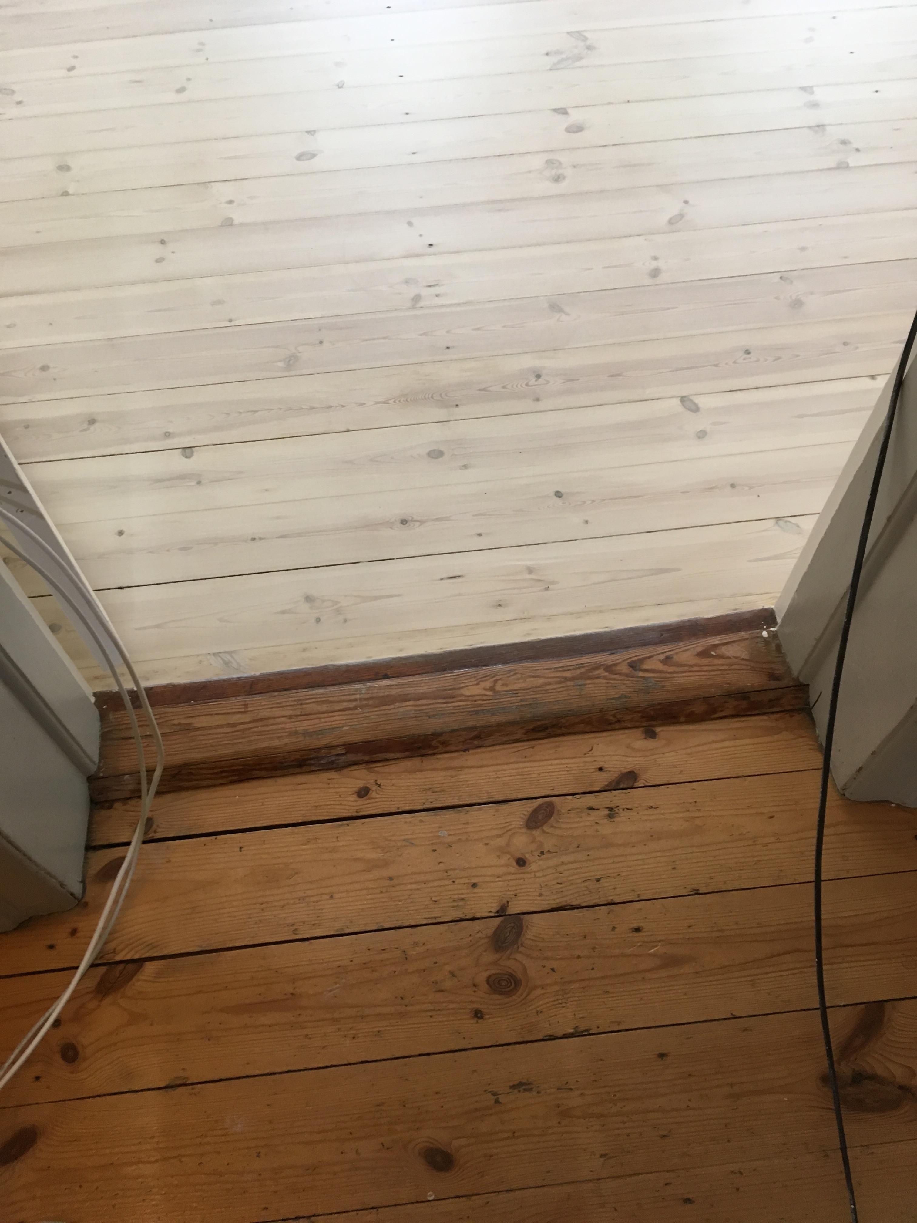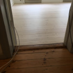 billedet ses hvordan gulvet så ud før og efter behandling. Slibning, lud