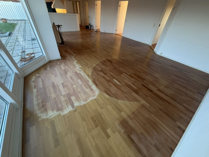 Generelt flot slibning og lakering af gulvet. En enkel solskade kunne desværre ikke blive fjernet.