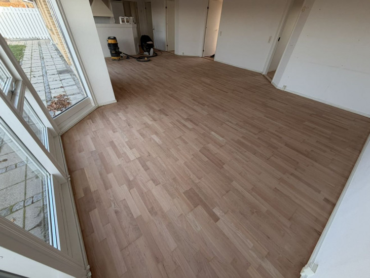 Gulvene er flot afhøvlet, og resultatet står jævt, pænt og professionelt. Et solidt stykke arbejde, der virkelig løfter rummene. Ingen ujævnheder ved kanter, flot olieret og ensfarvet overalt. Håndværkerne ryddede desuden så godt op efter sig, at man næsten ikke kunne se, de havde været her.