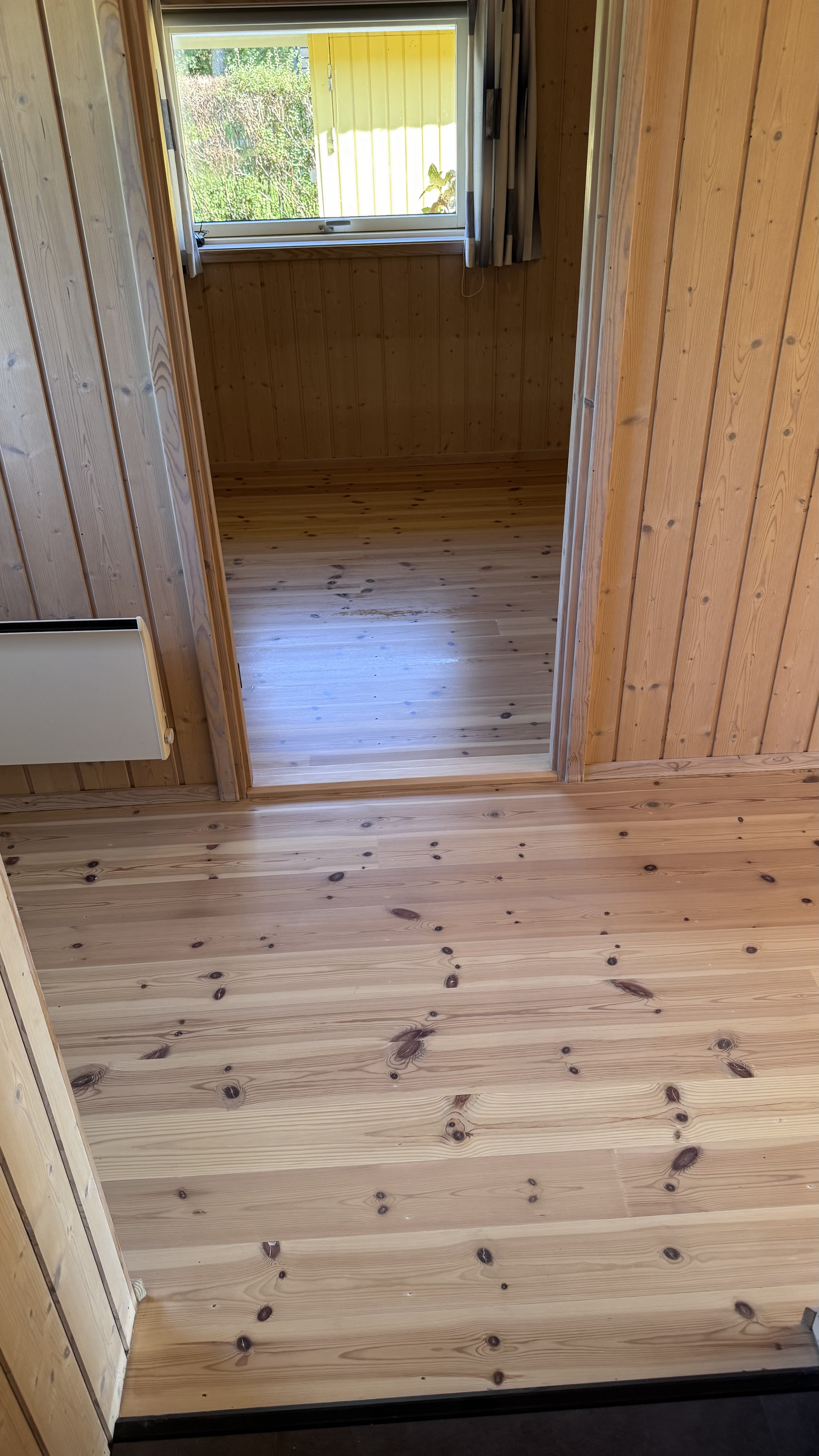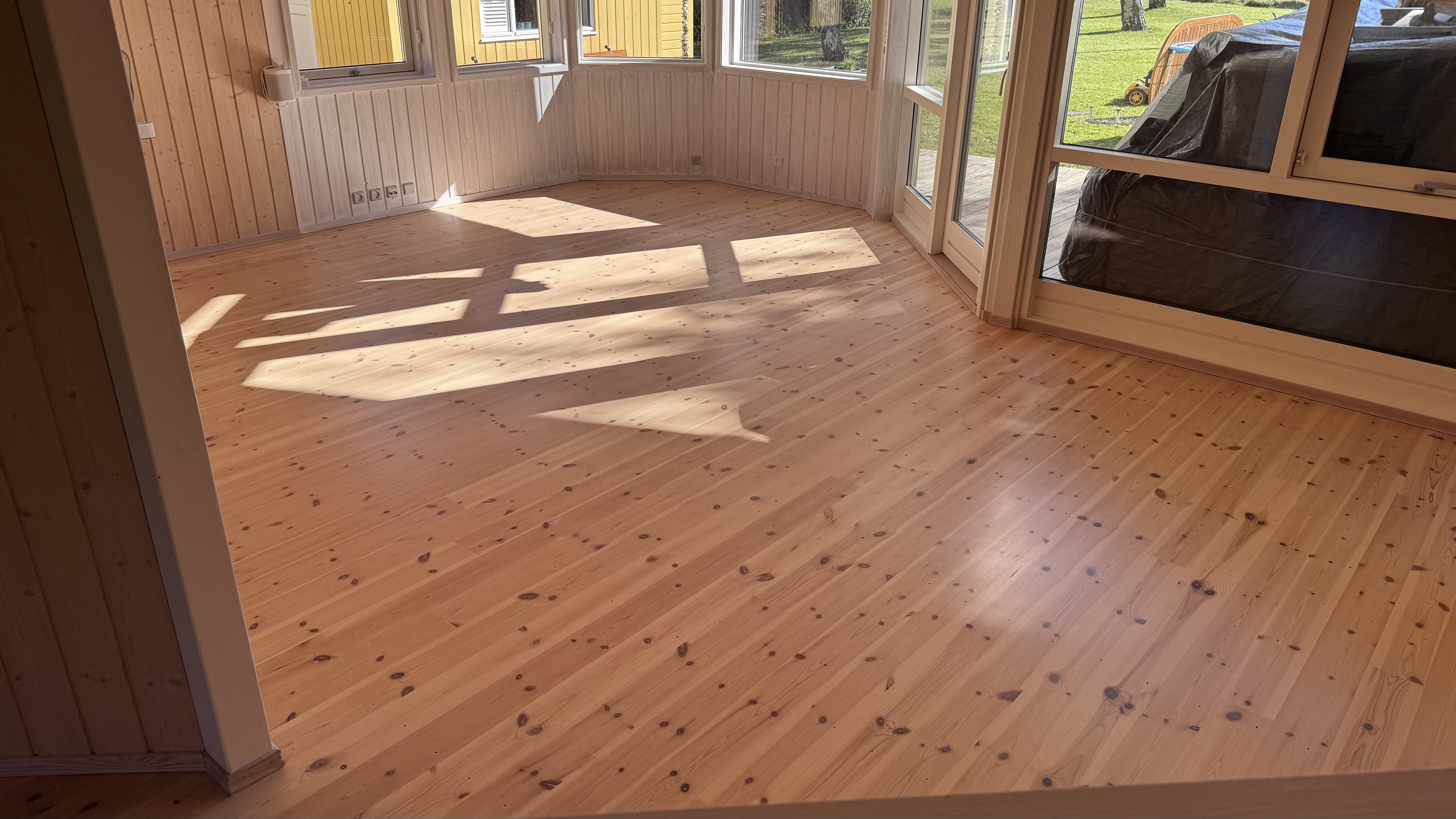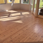 John har afhøvlet vores bøgeparket i stuen.