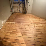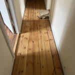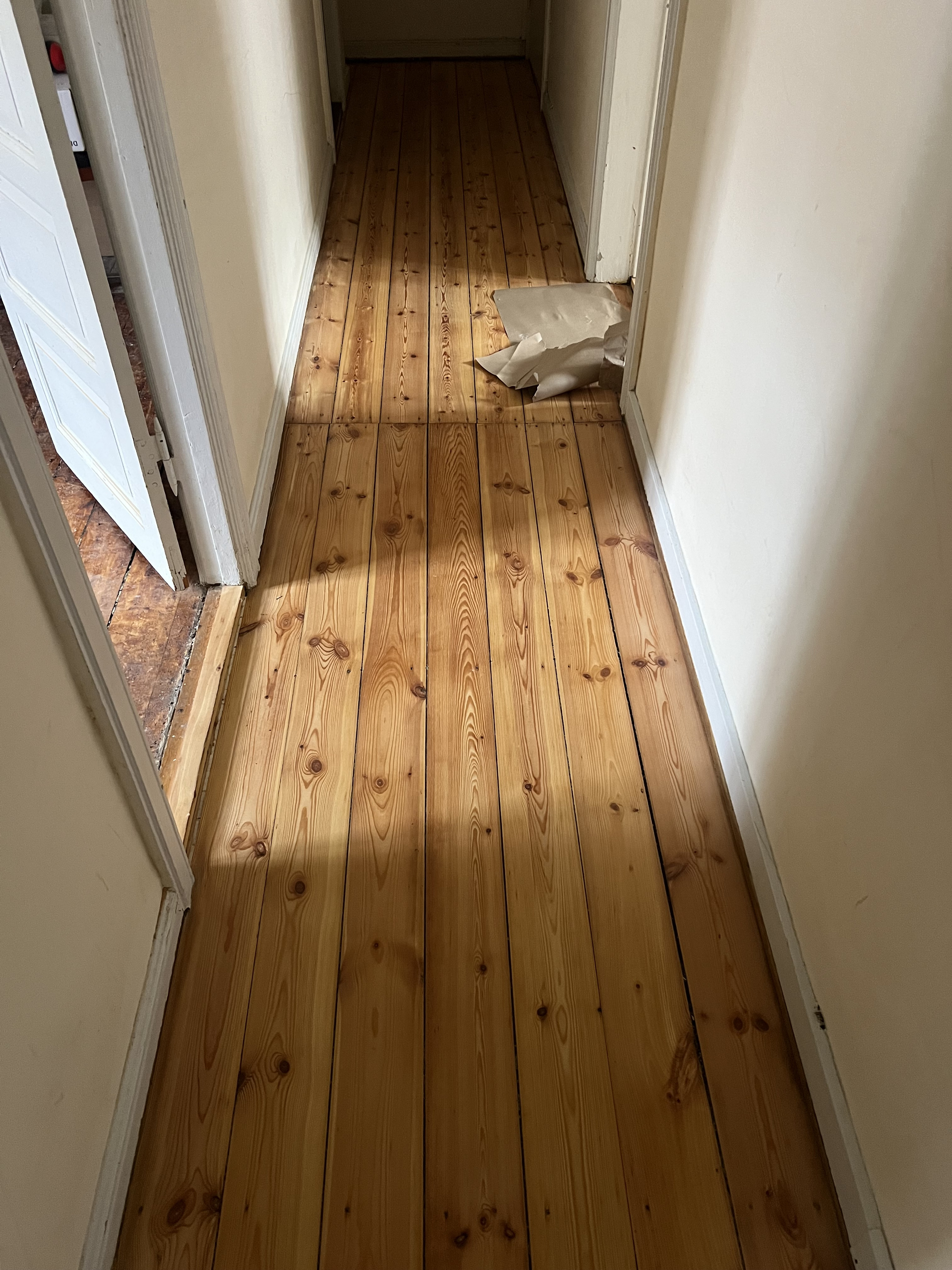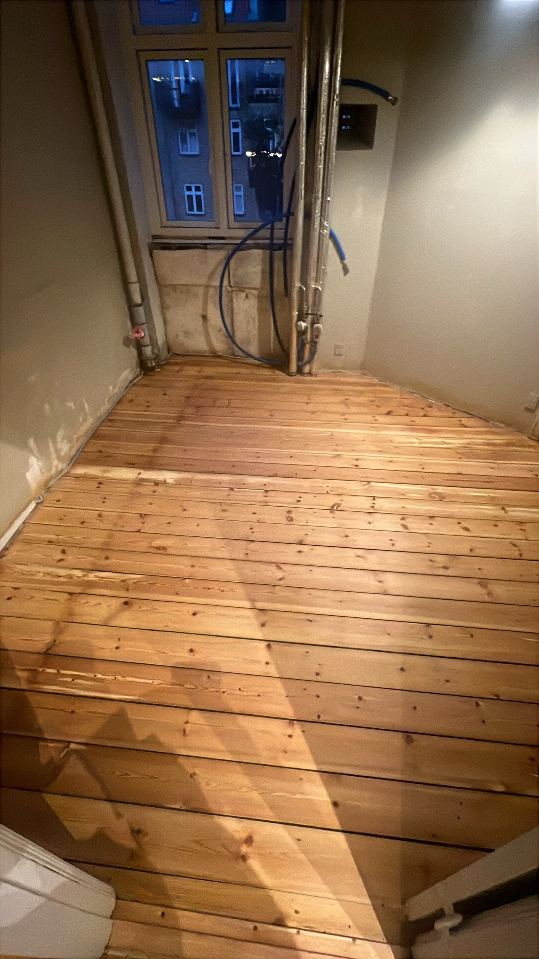 Fik høvlet gulve i tre værelser, en gang og en trappe samt lakeret det hele.