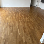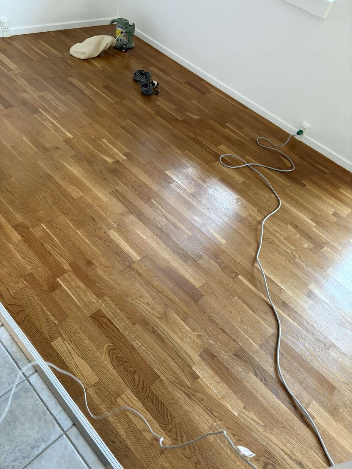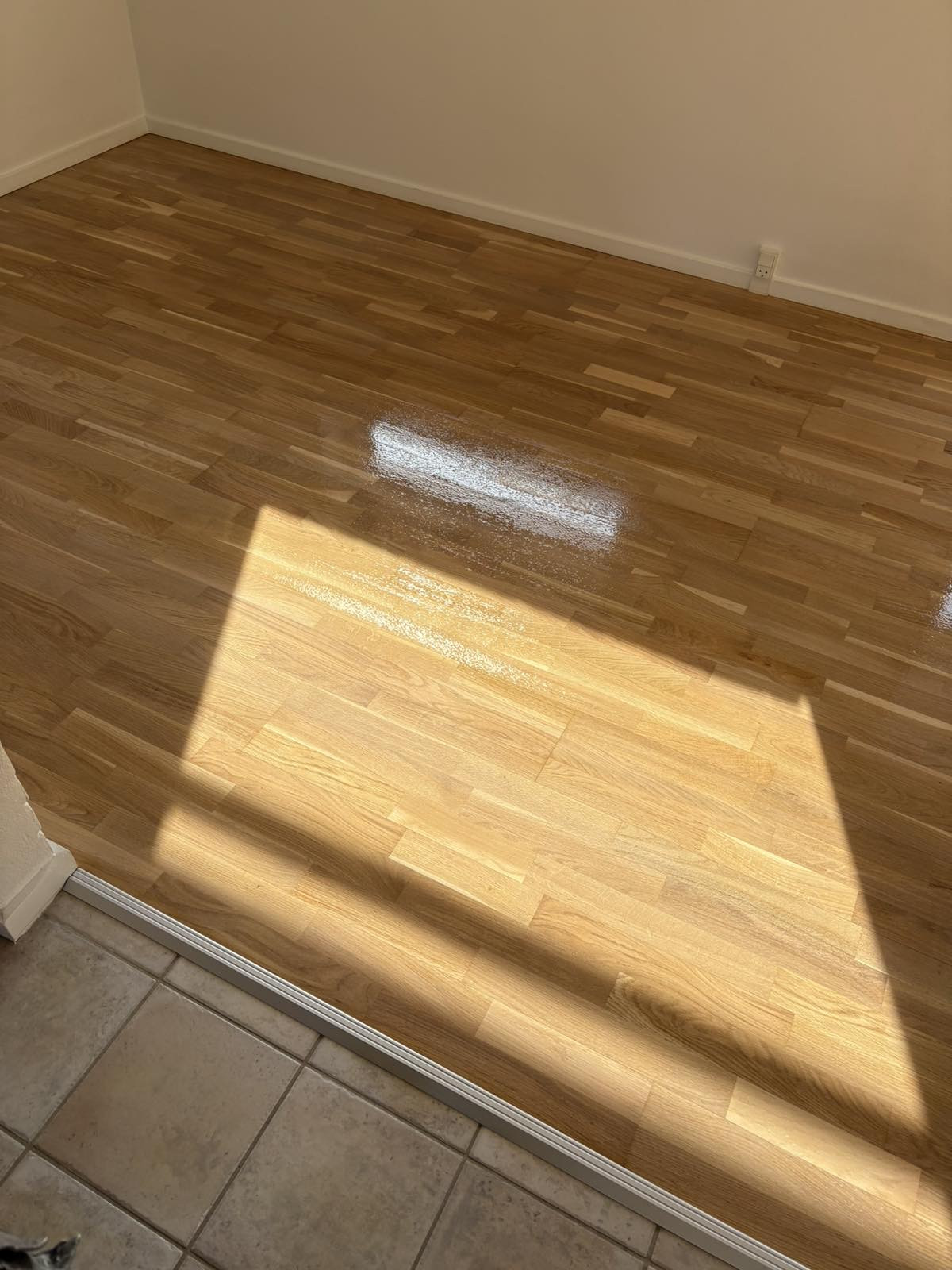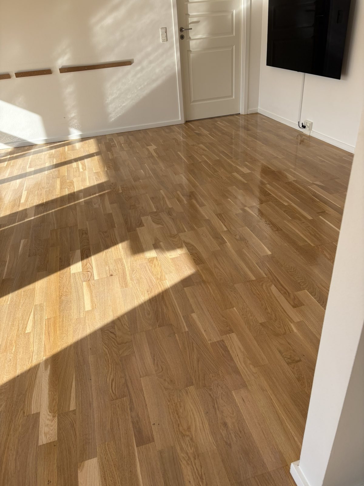 Vi aftale de skulle komme en mandag og processen ville tage ca. 3-4 dage. De mødte op på adressen til tiden og jeg skulle blot give dem nøglerne og sige god arbejdslyst. Vi aftalte, at de ville kontakte os, når gulvet var lakeret 3 gange, så vi kunne se, om det var blevet lyst nok. Efter 3 dage så vi gulvet og det var blevet rigtig fint og lyst. De var helt færdige efter 4 dage og gulvet havde så 24 timer til at hærde, så det var klar til at blive dækket af i weekenden (vi skulle filte og male efterfølgende).