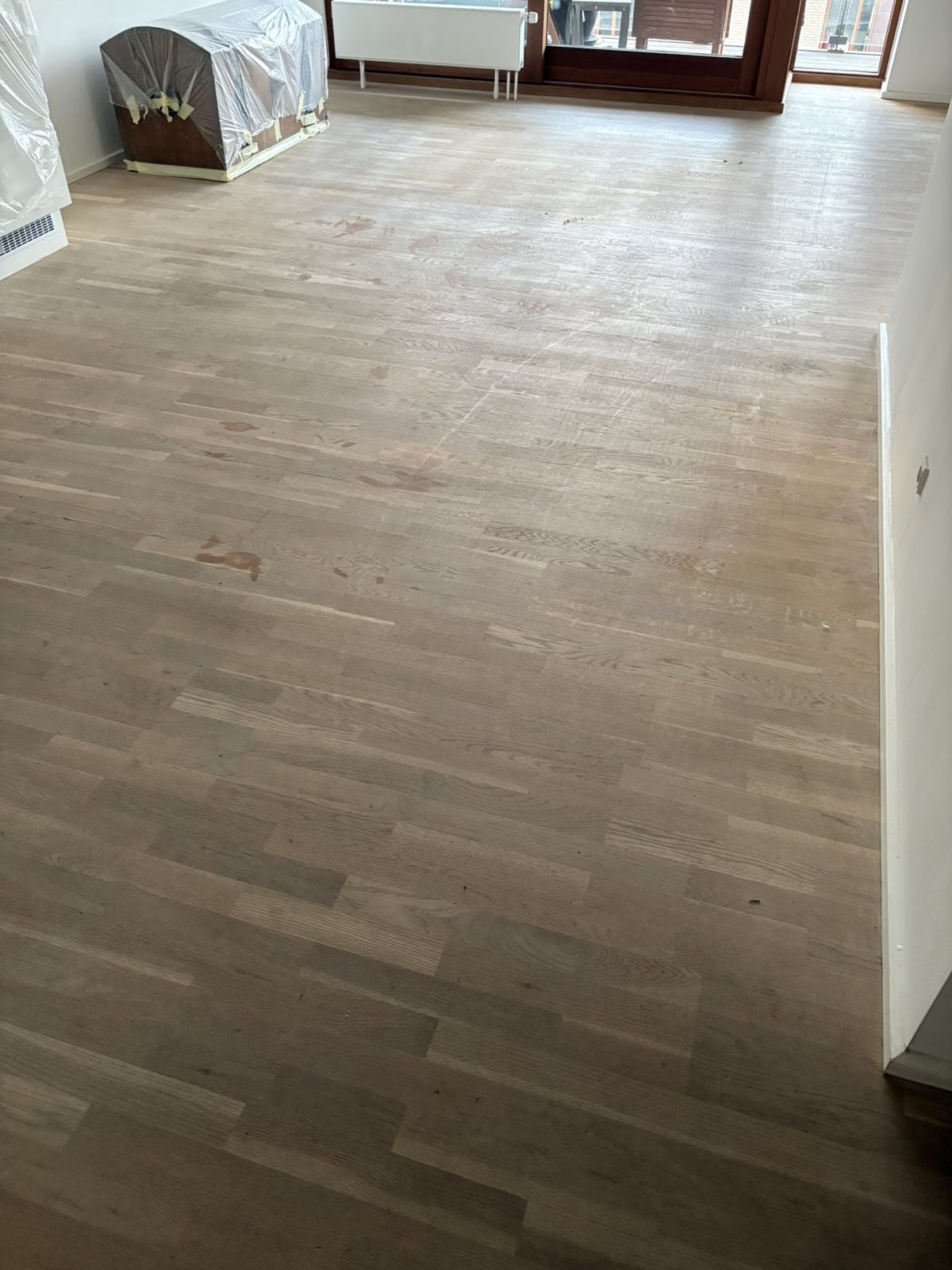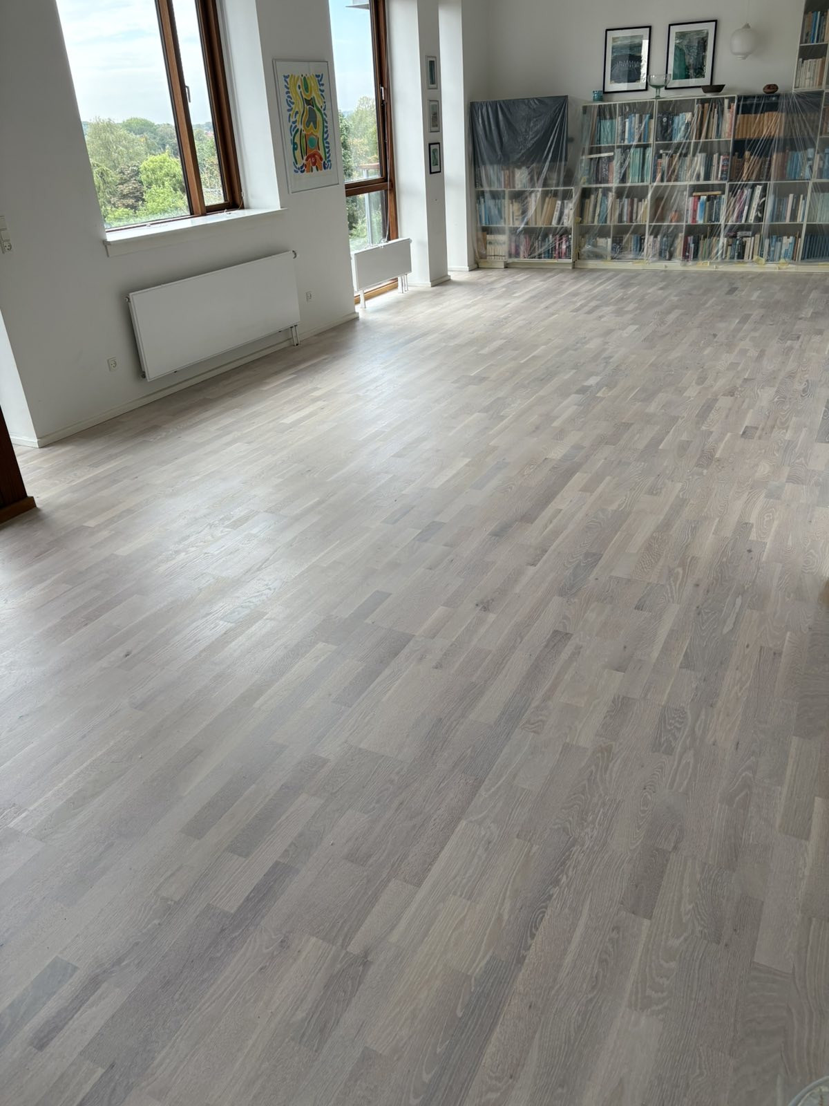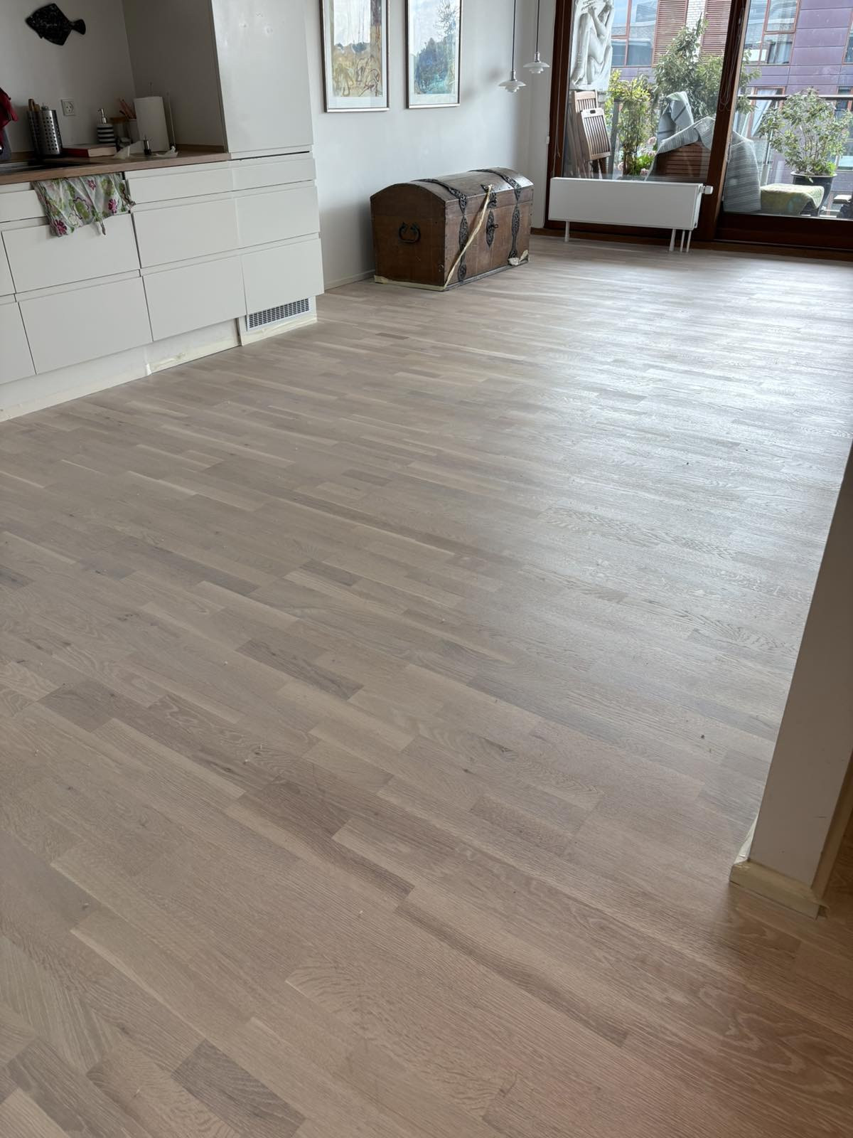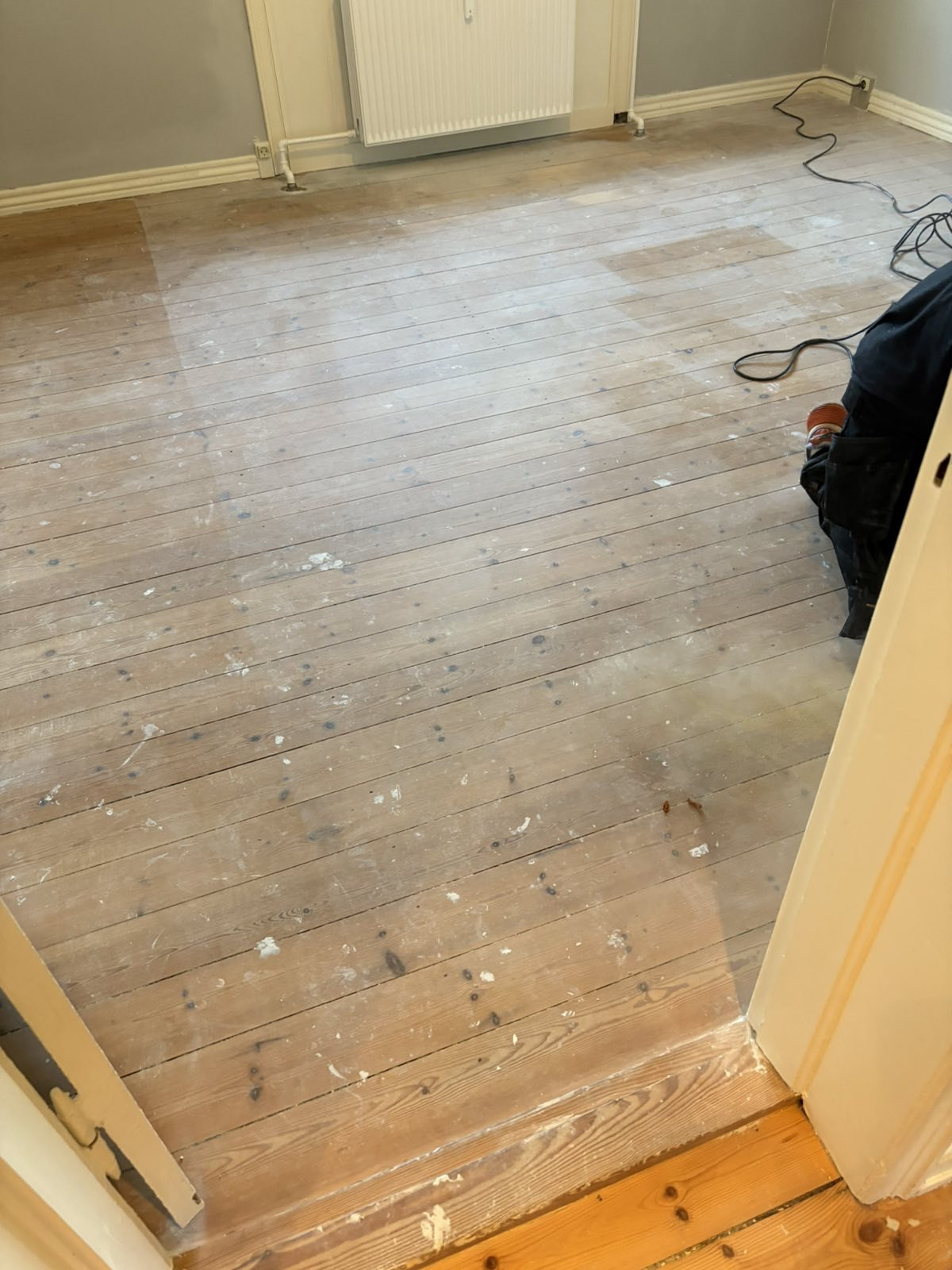 Koordinering/afdækning: Jeg havde også et separat malerfirma inde over, hvilket gjorde aftalerne lidt mere komplekse. Vi aftalte, at jeg selv stod for afdækning før gulvslibningen – det fungerede fint i praksis.
