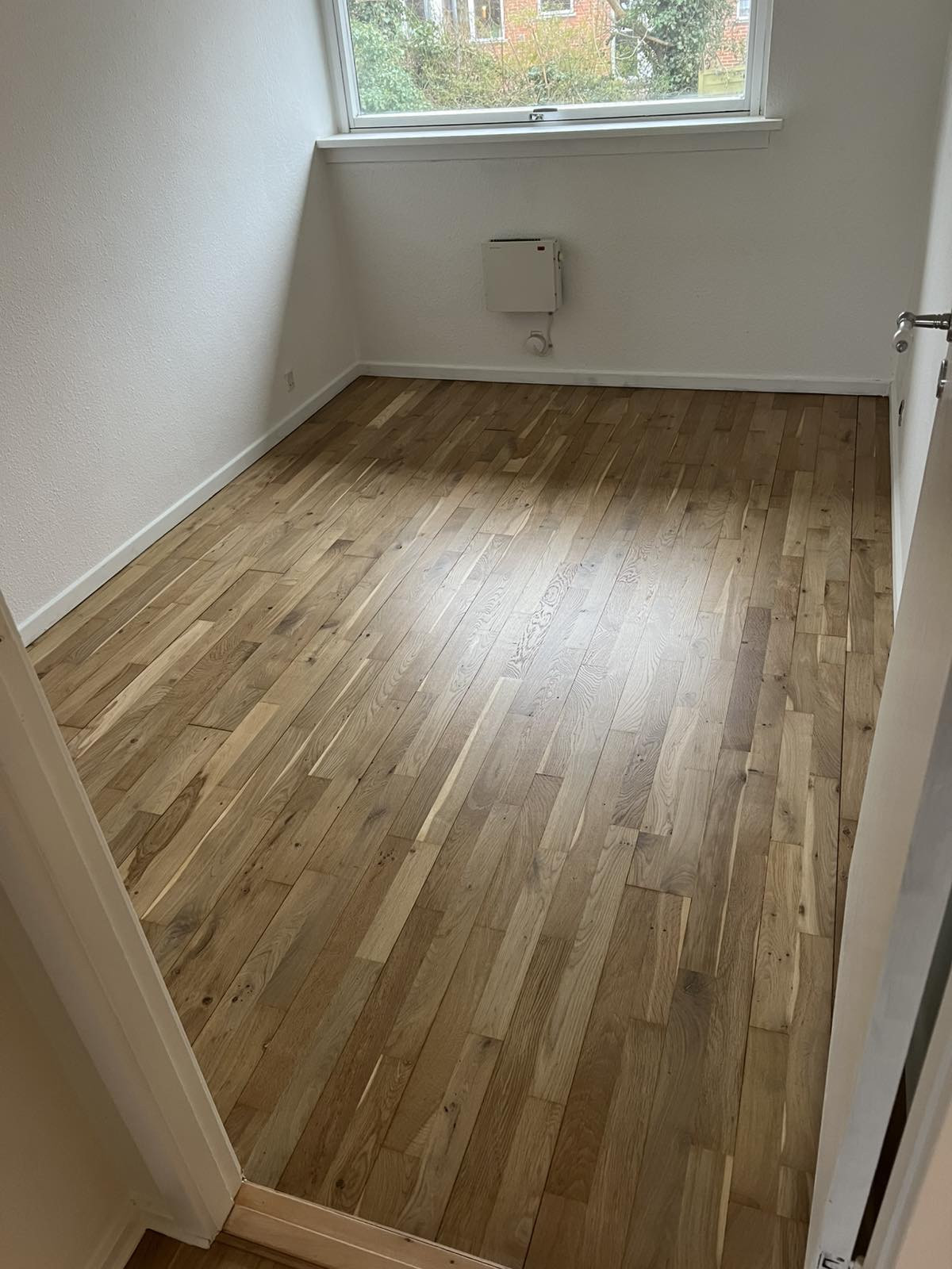 Både det lakerede gulv og den olierede bordplade er lavet pænt or ordentligt.