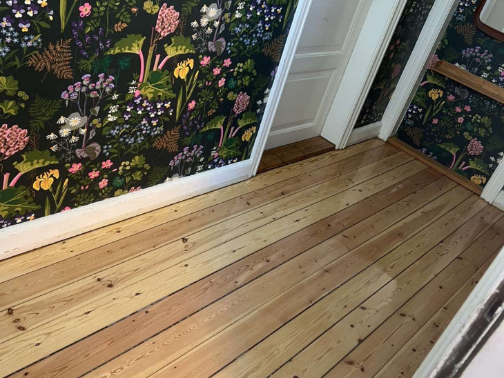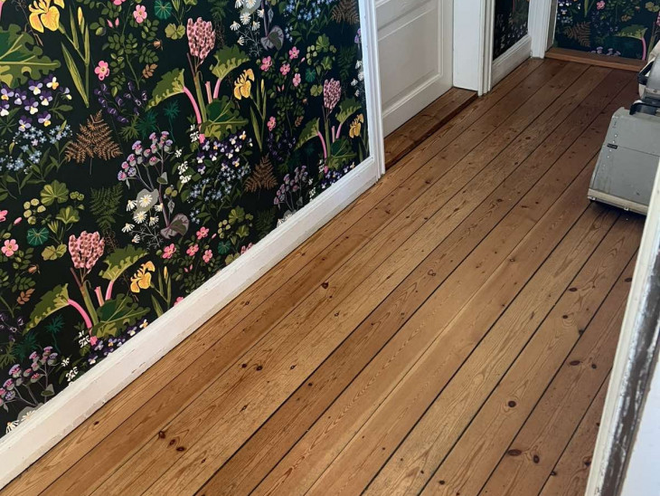Vi fik slebet og behandlet gulve i hele lejligheden (hvid lud + hvid lak).