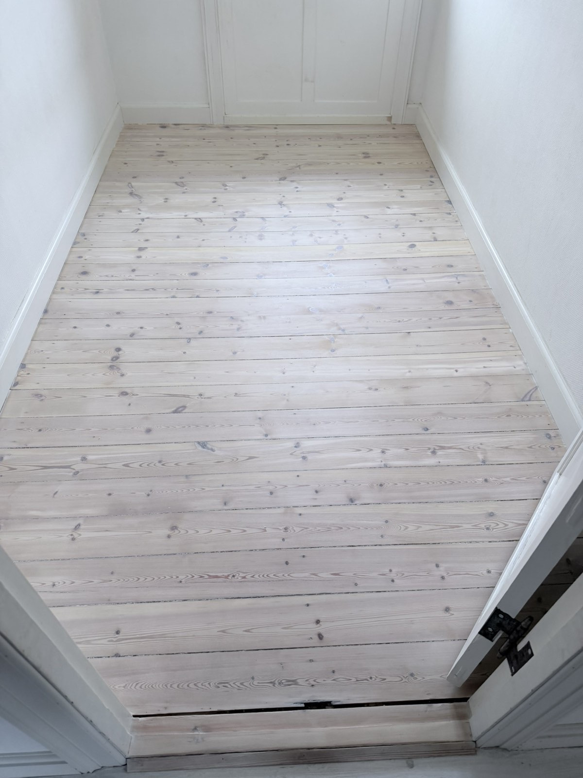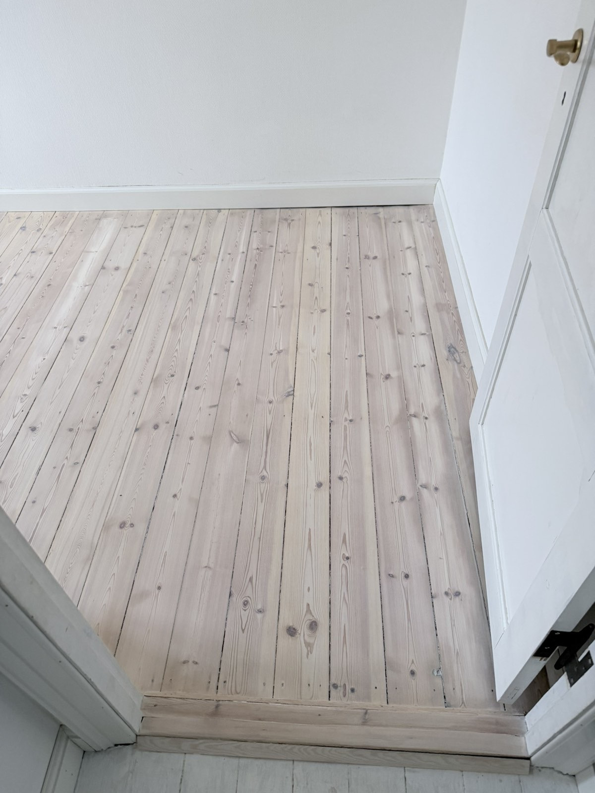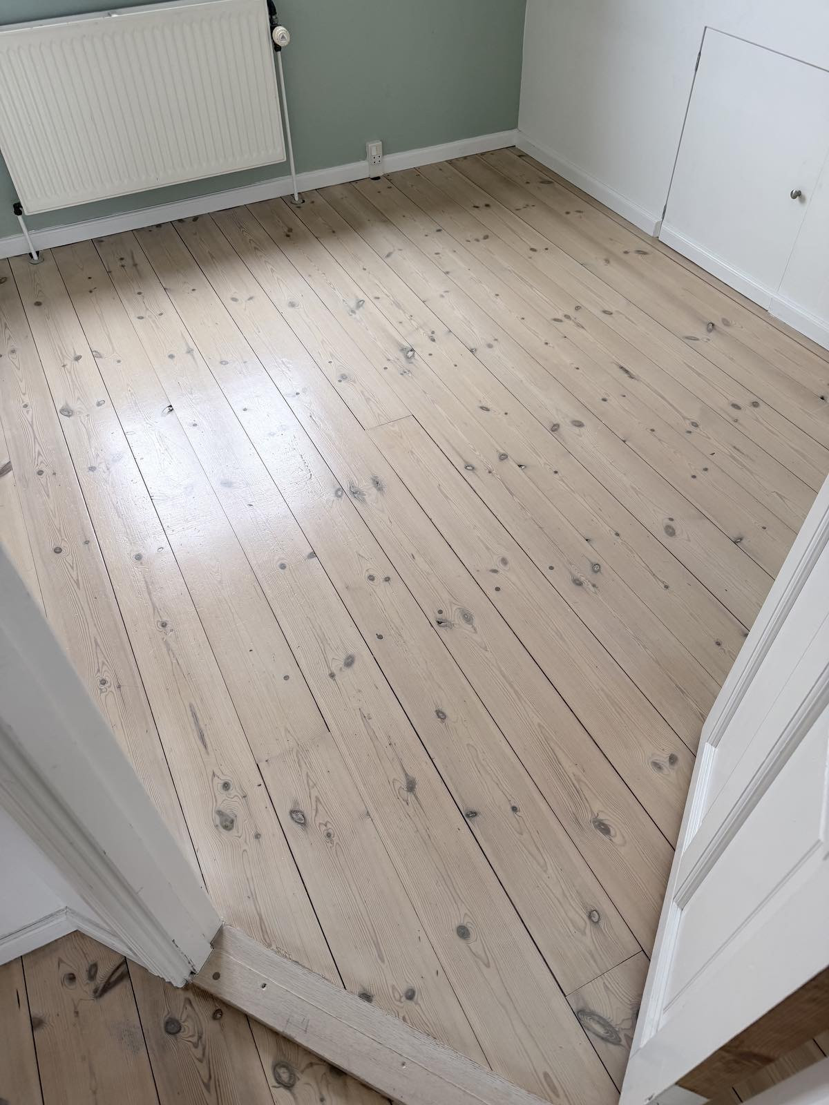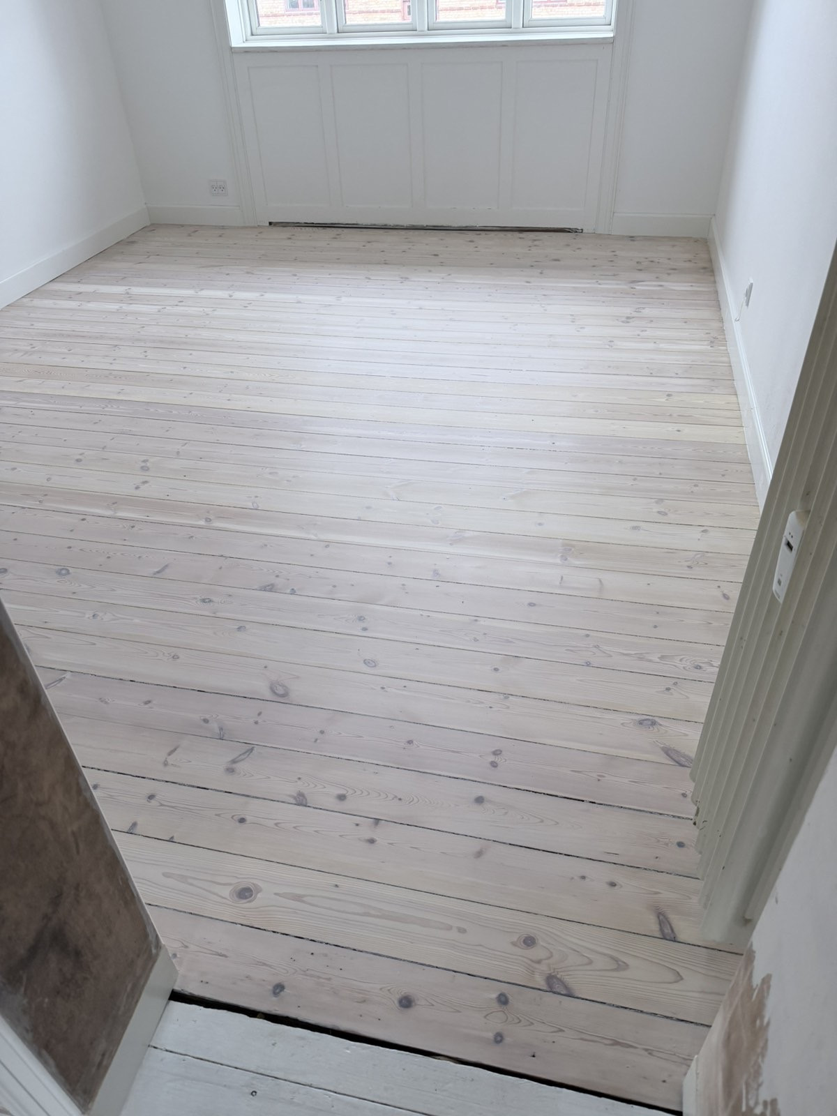 Vi fik slebet og behandlet gulve i hele lejligheden (hvid lud + hvid lak).