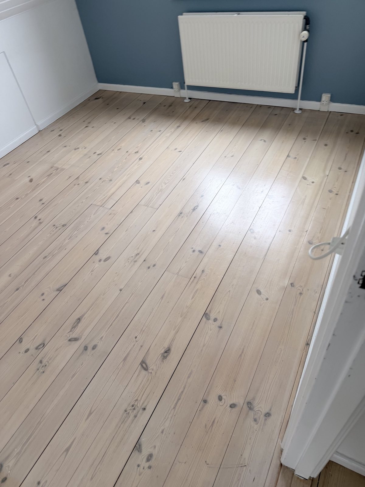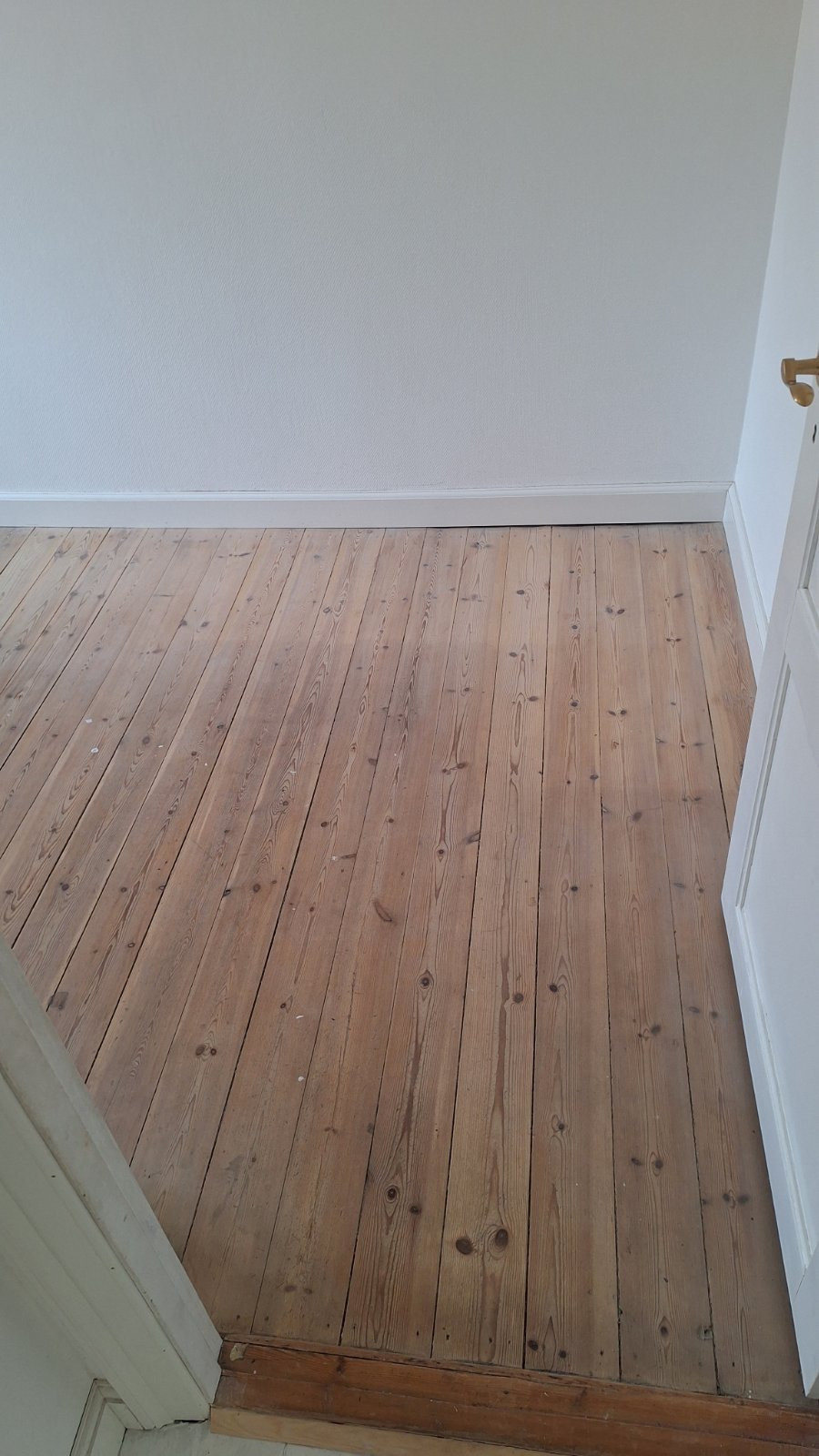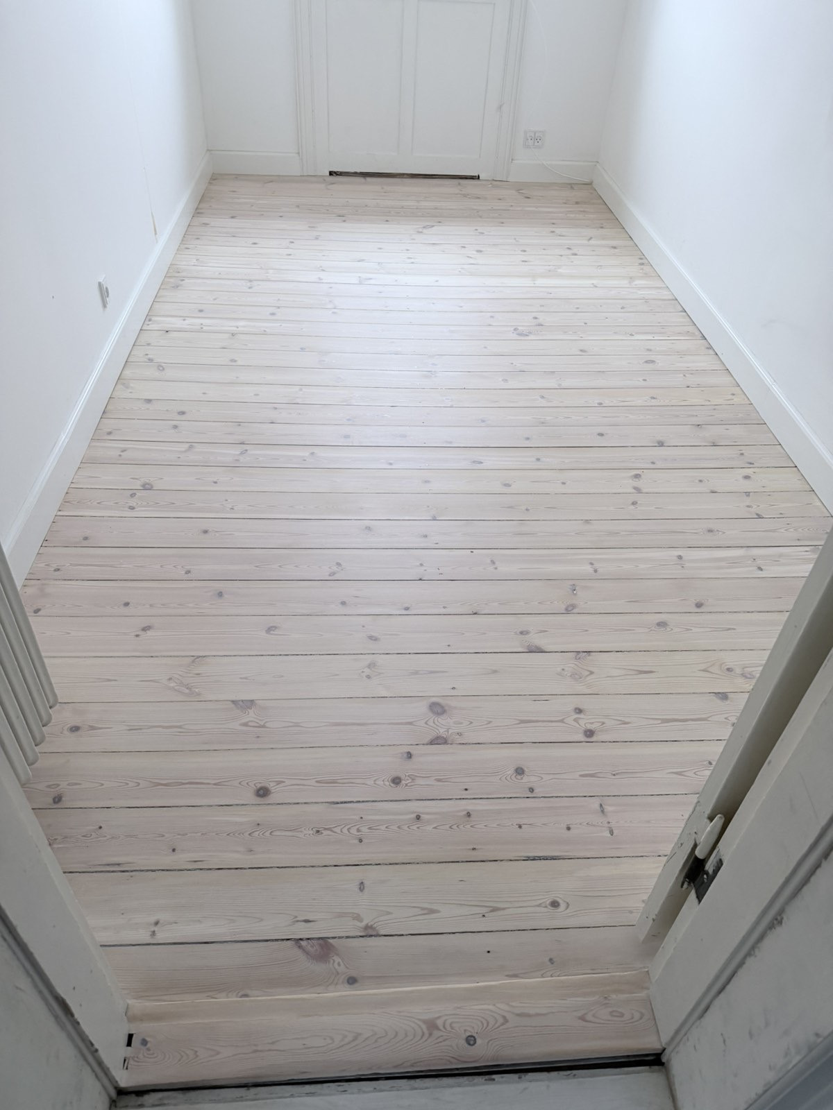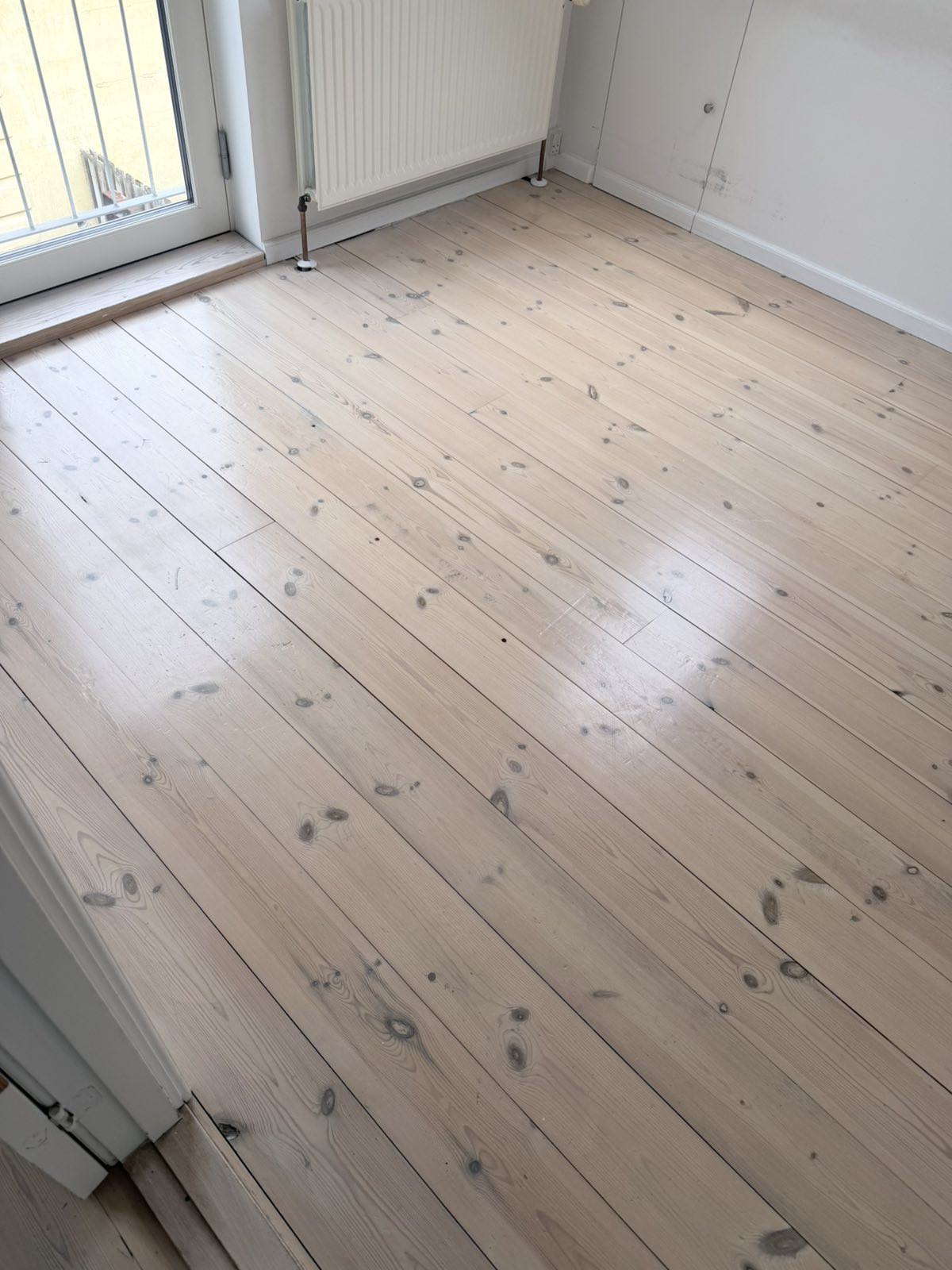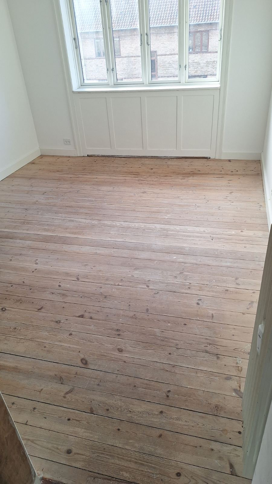 Vi fik slebet og behandlet gulve i hele lejligheden (hvid lud + hvid lak).