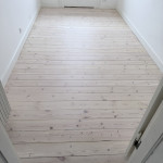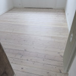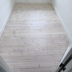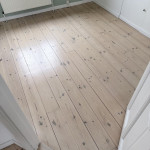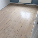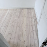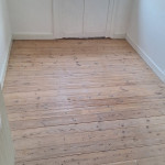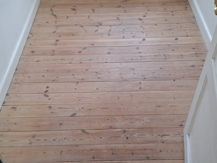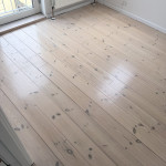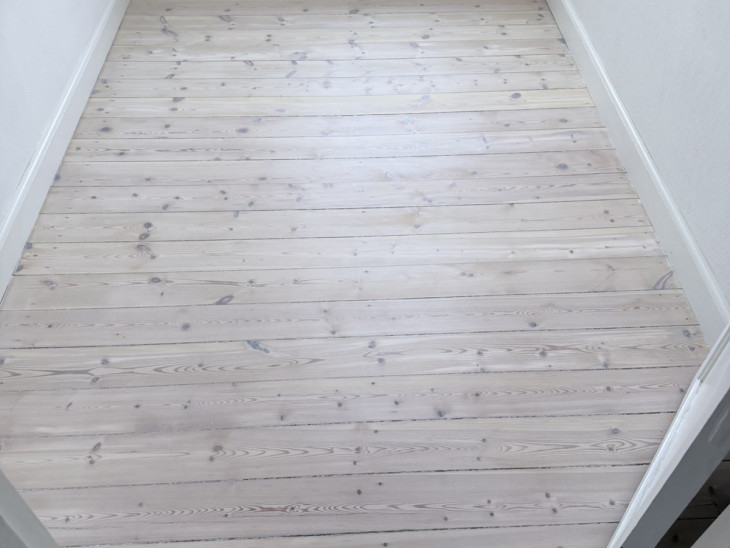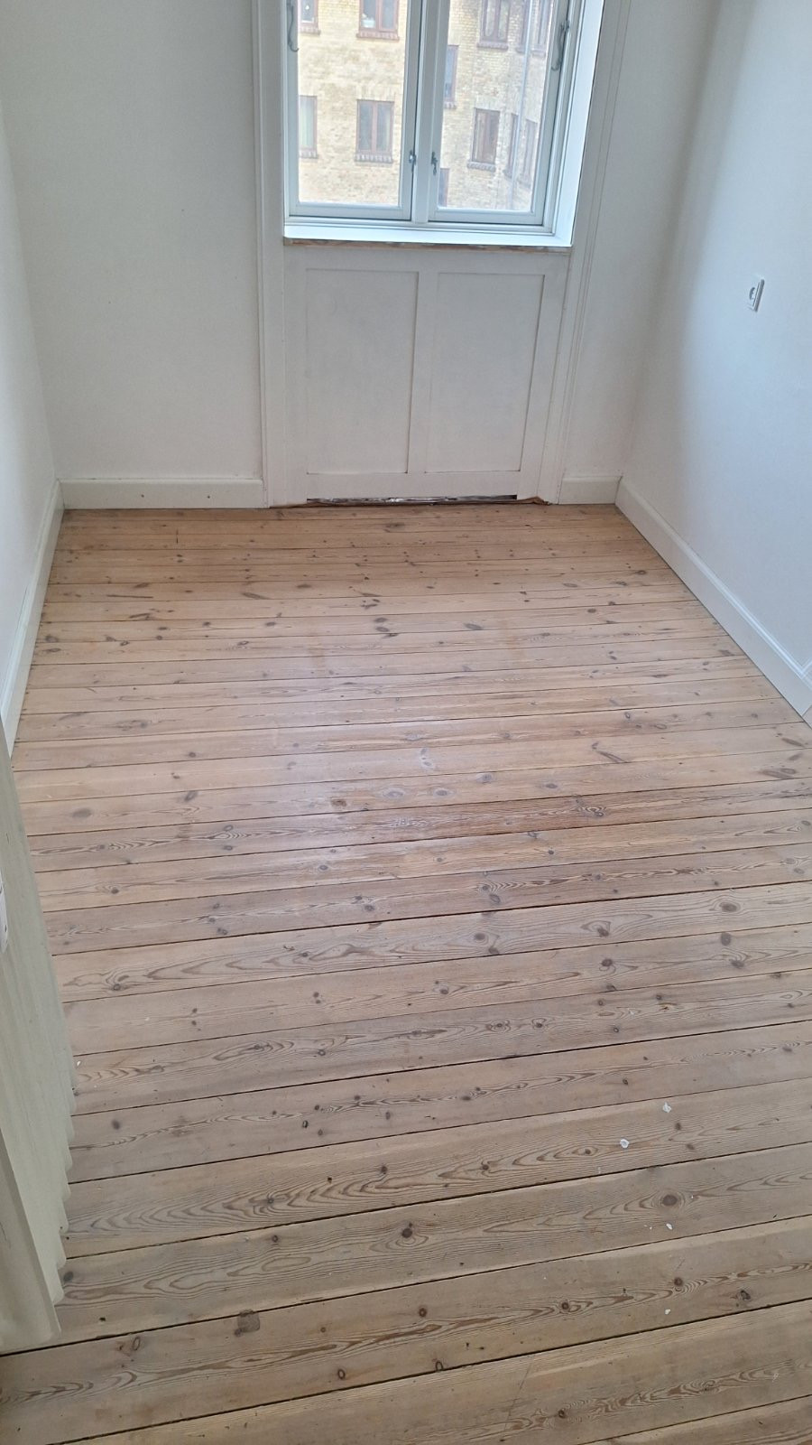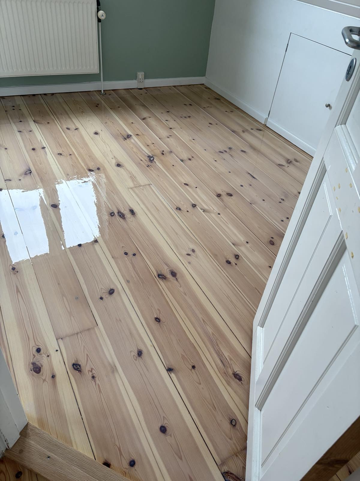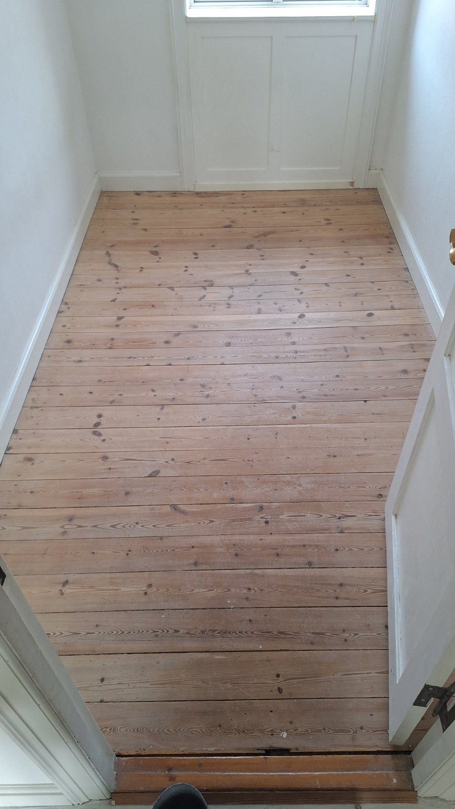 Vi fik slebet og behandlet gulve i hele lejligheden (hvid lud + hvid lak).