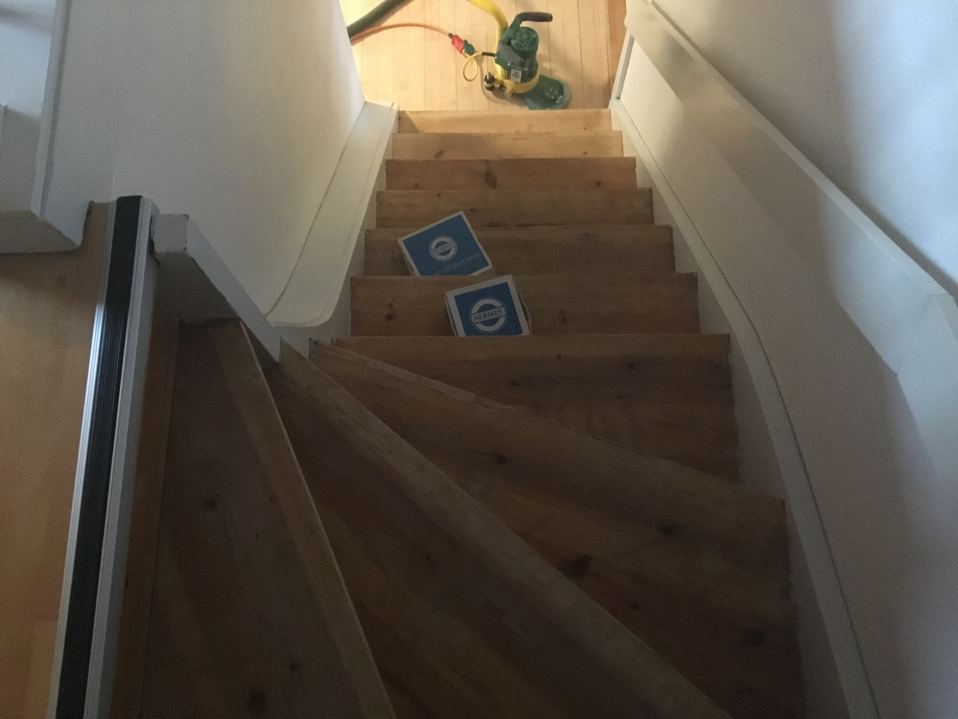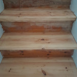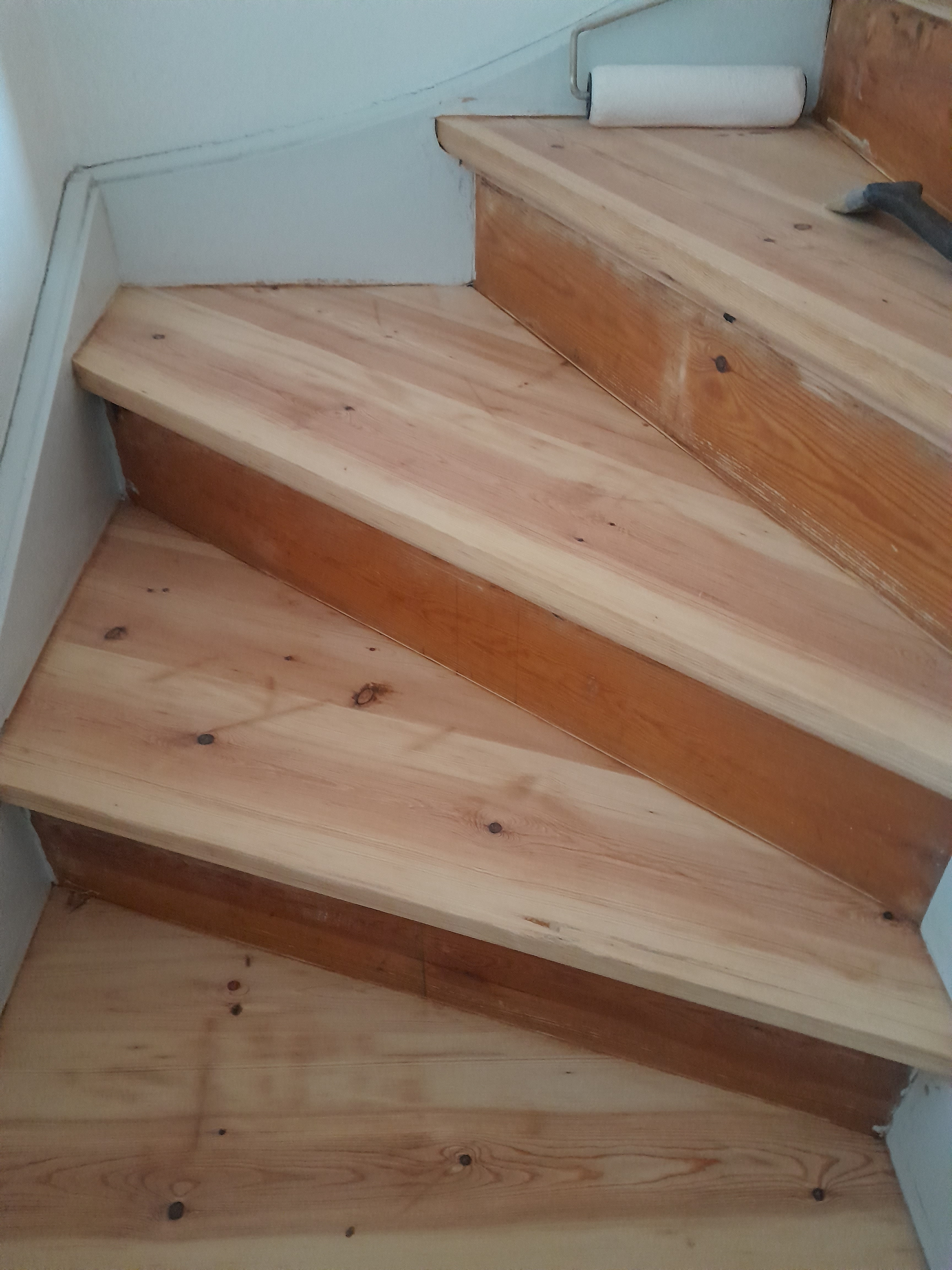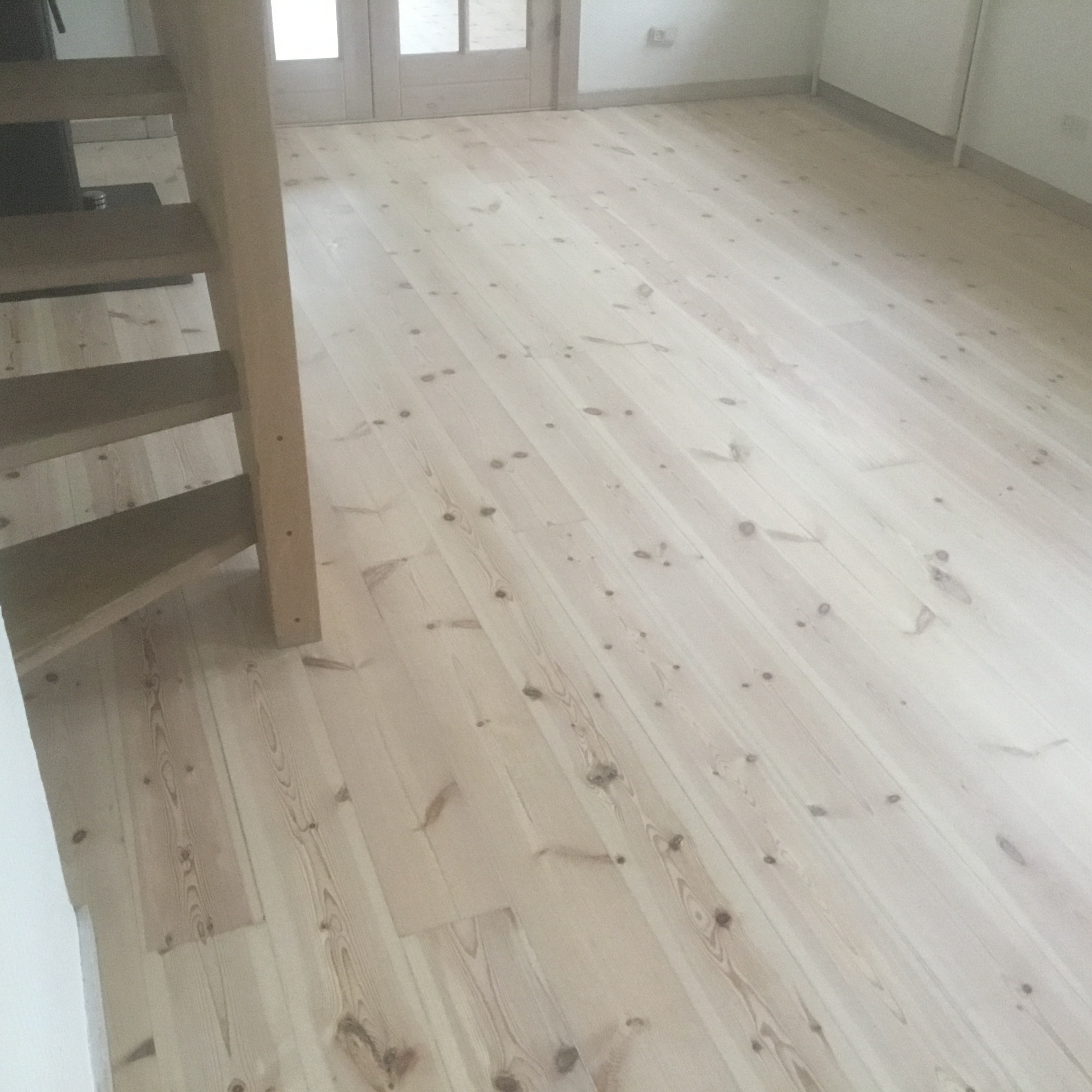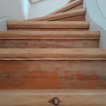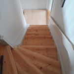 Vi har fået foretaget gulvafslibning og overfladebehandling på gulv 1. sal ( se foto) og trappe til 1. sal samt slebet og olie/voks behandlet køkkenbord og sofabord.