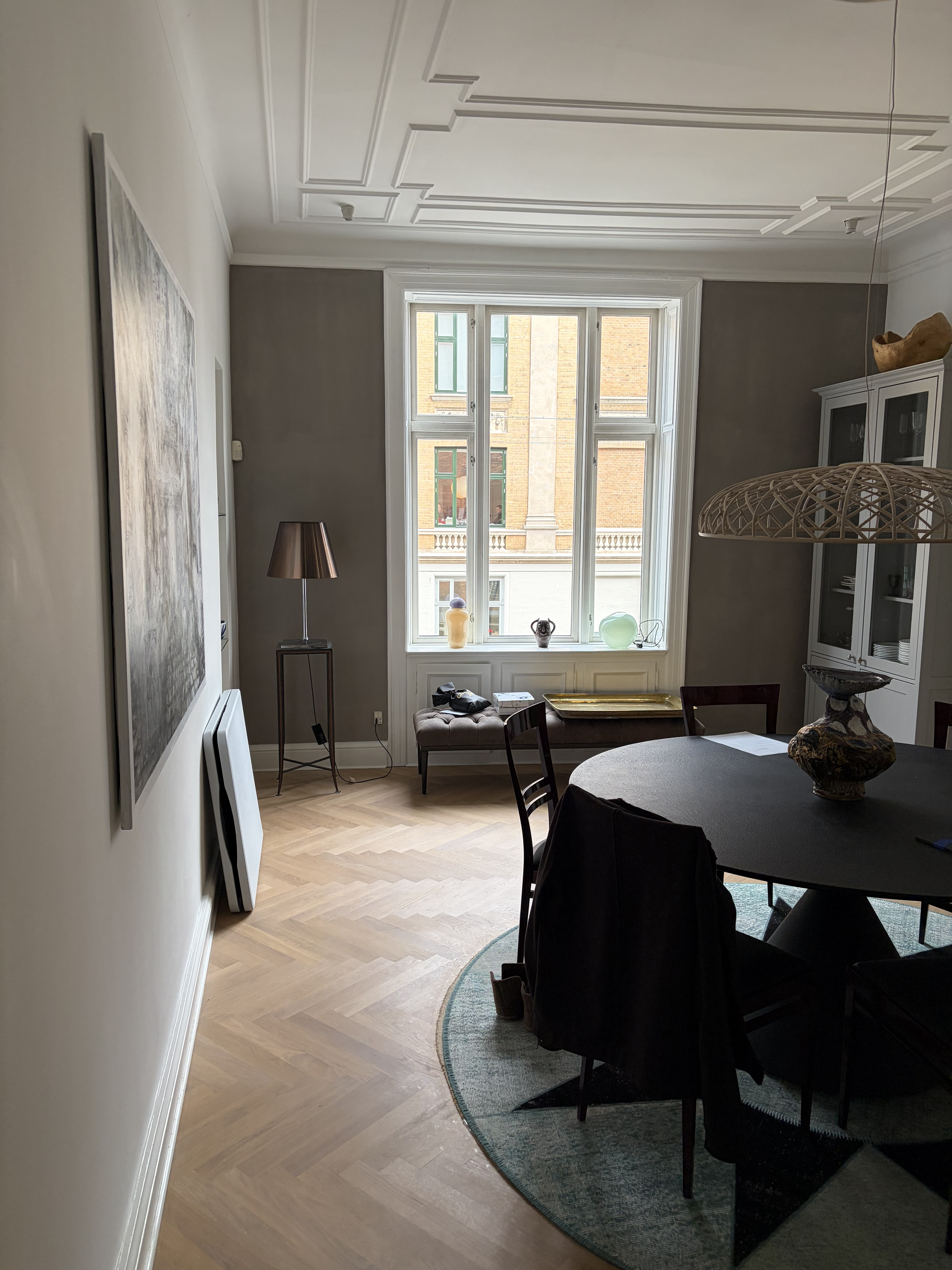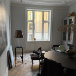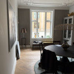 Vi fik restaureret vores gamle lofter, al maling og gipsgrunder blev fjernet, der blev lige så fint skåret rundt om stukken, derefter blev der lagt spartelmasse over hele loftet, der blev slebet og sat glas filt op, og der blev grundet og malet, og overgangen mellem filt og stuk er usynlig. Lofterne står flotte og nyrestaurerede. De to malere var virkelig behagelige at have gående.