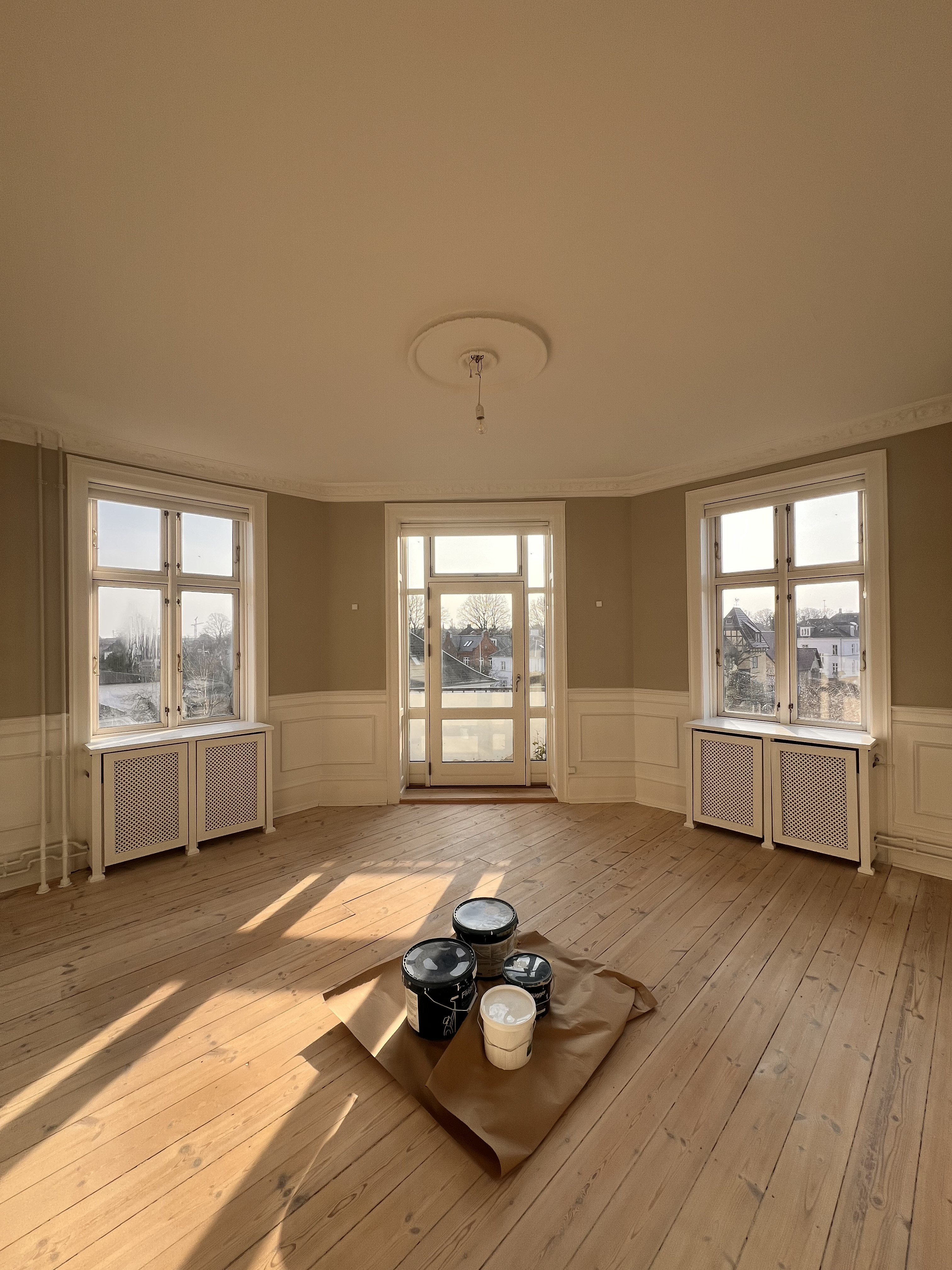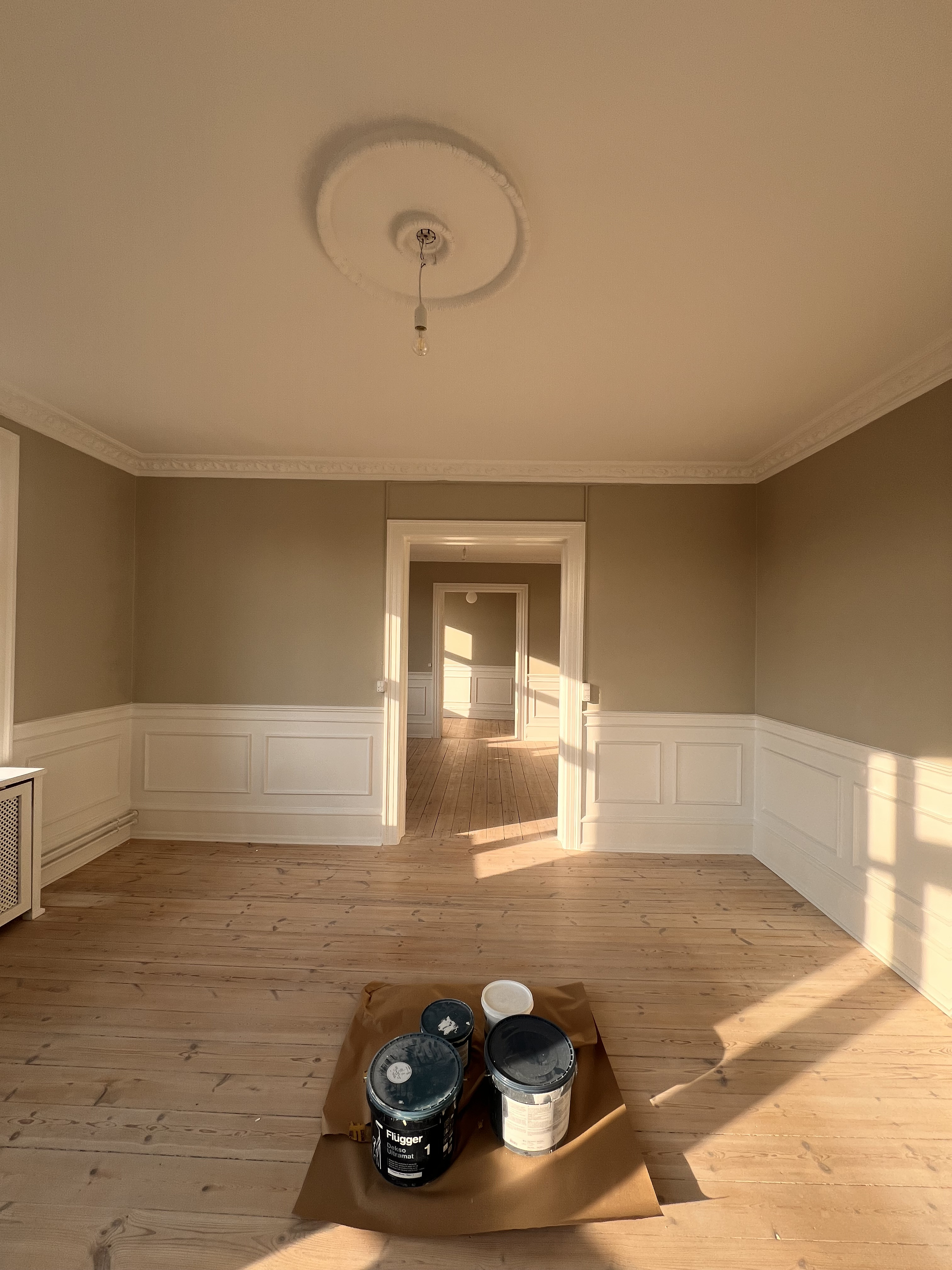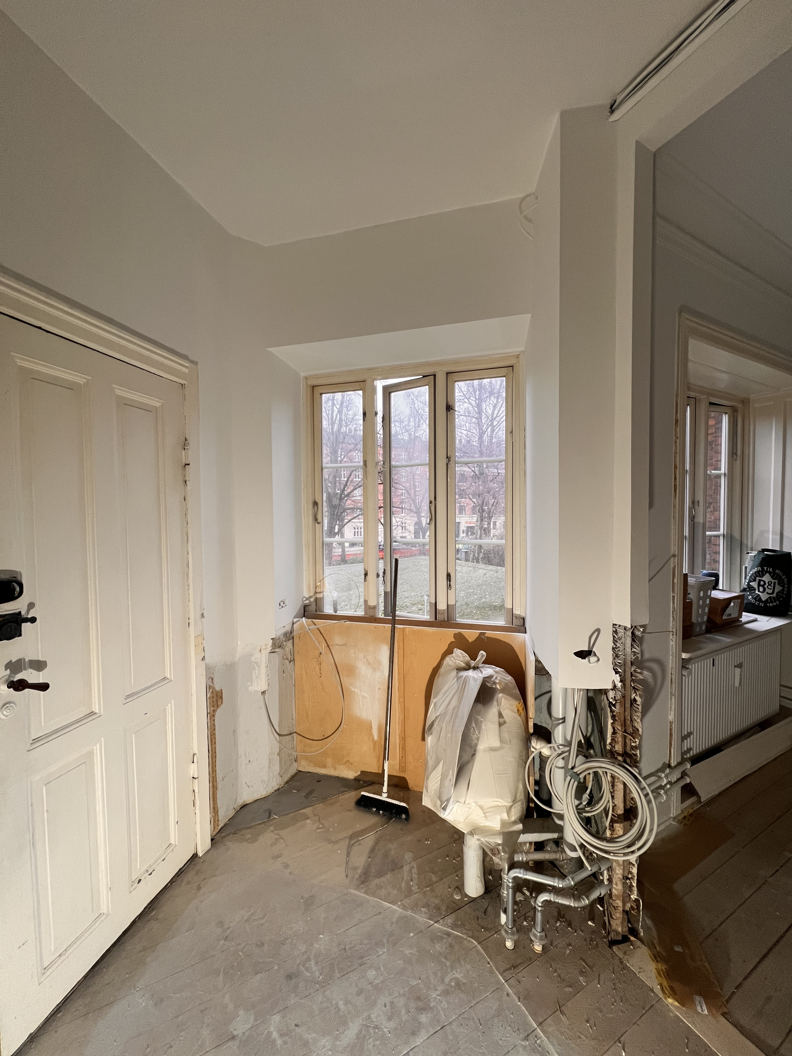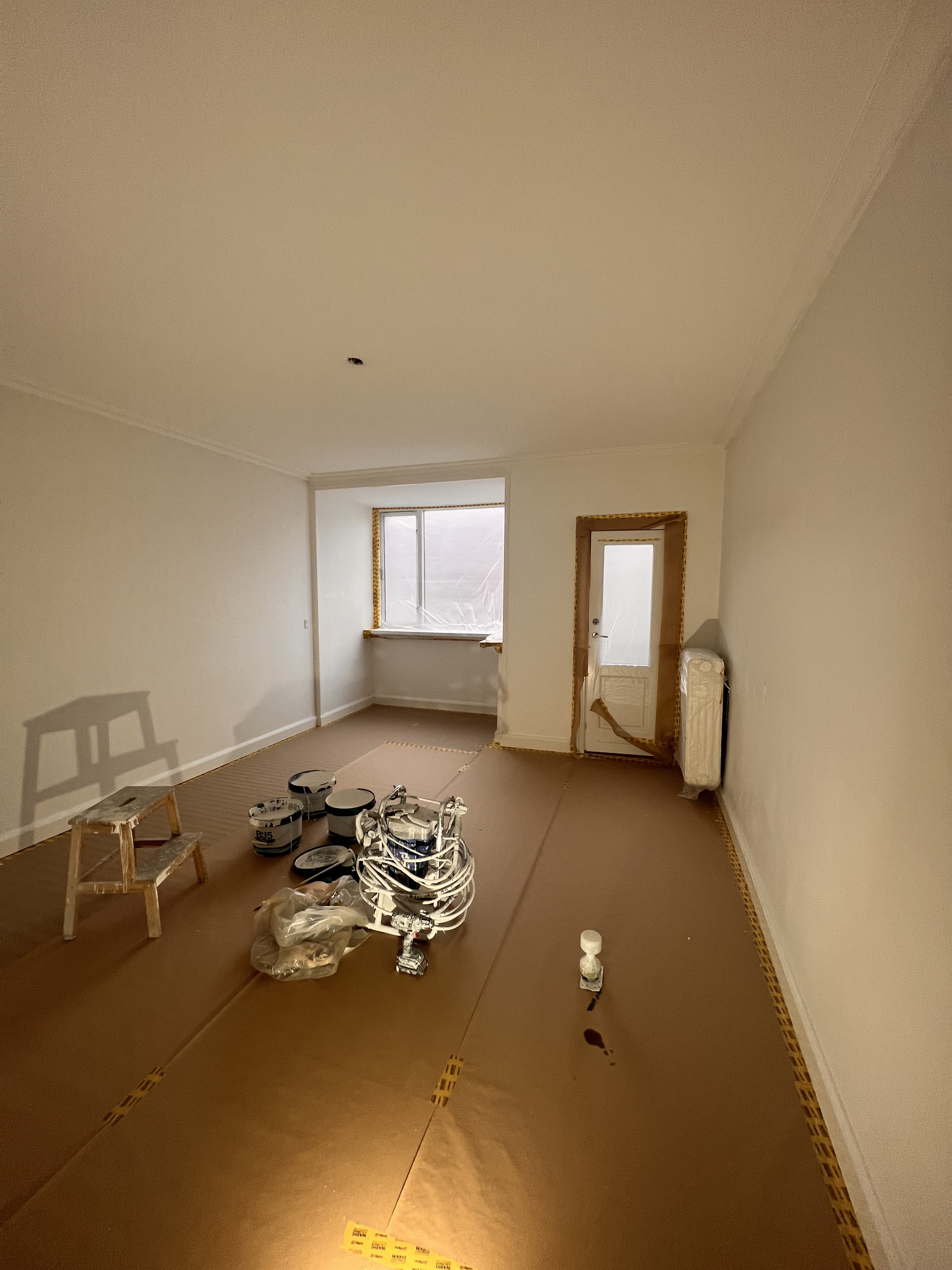Vi fik malet vores nye lejlighed hvid, der ved overtagelse havde et blåt rum inkl. loft, mørkegråt rum inkl. loft og et blåt badeværelse. Alle 98 kvm blev malet hvide, og det er super godt ud. Anton var også sød at efterlade lidt maling til os, så vi kunne give badeværelset et 3. Lag med vådrumsmaling, da det lignede lidt, at 2. Lag ikke var nok. Det fik vi gjort, og alt er godt