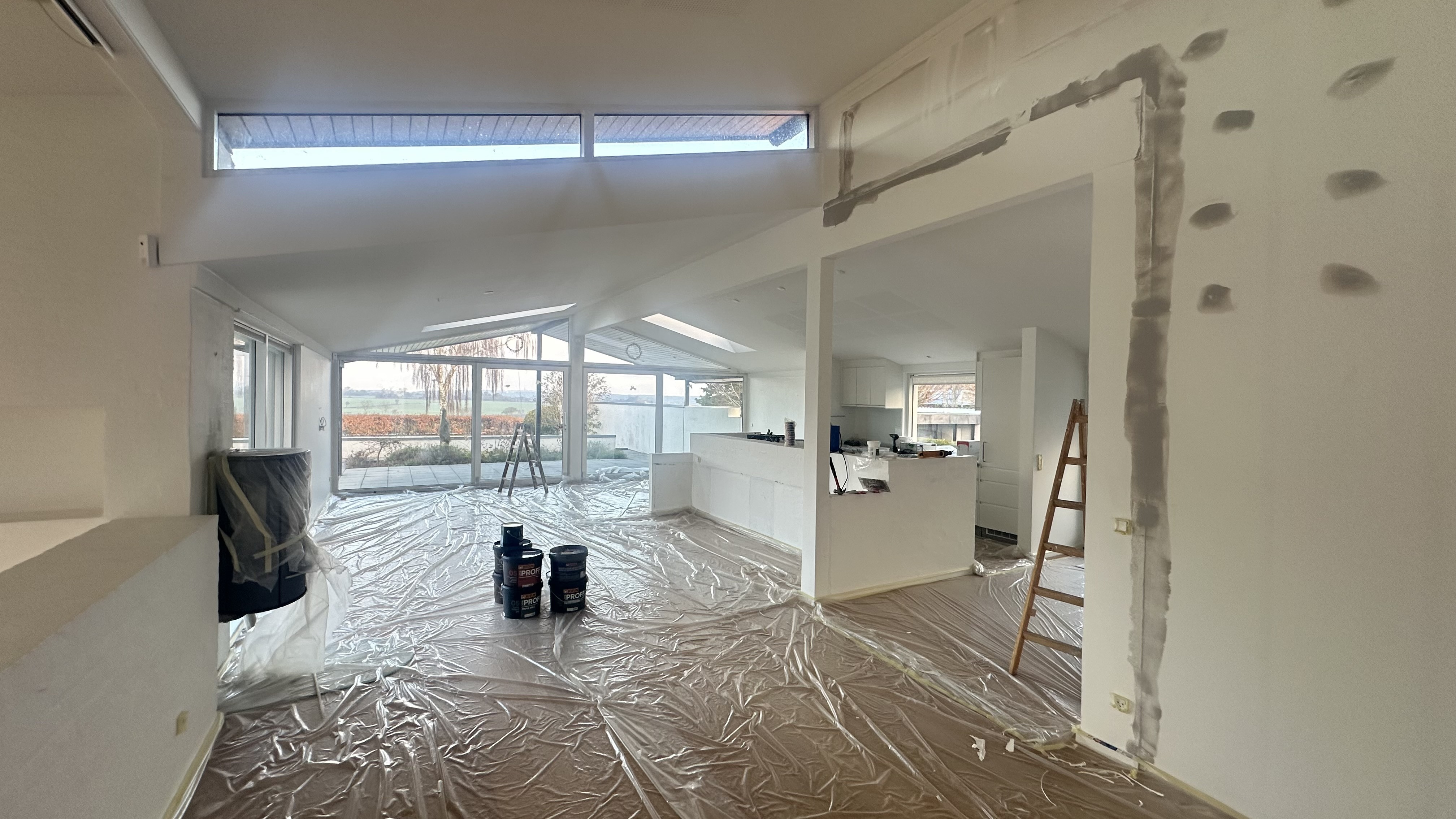 Martin har pudset, filtet og malet både vægge og loft i næsten alle rum i vores nye hus.