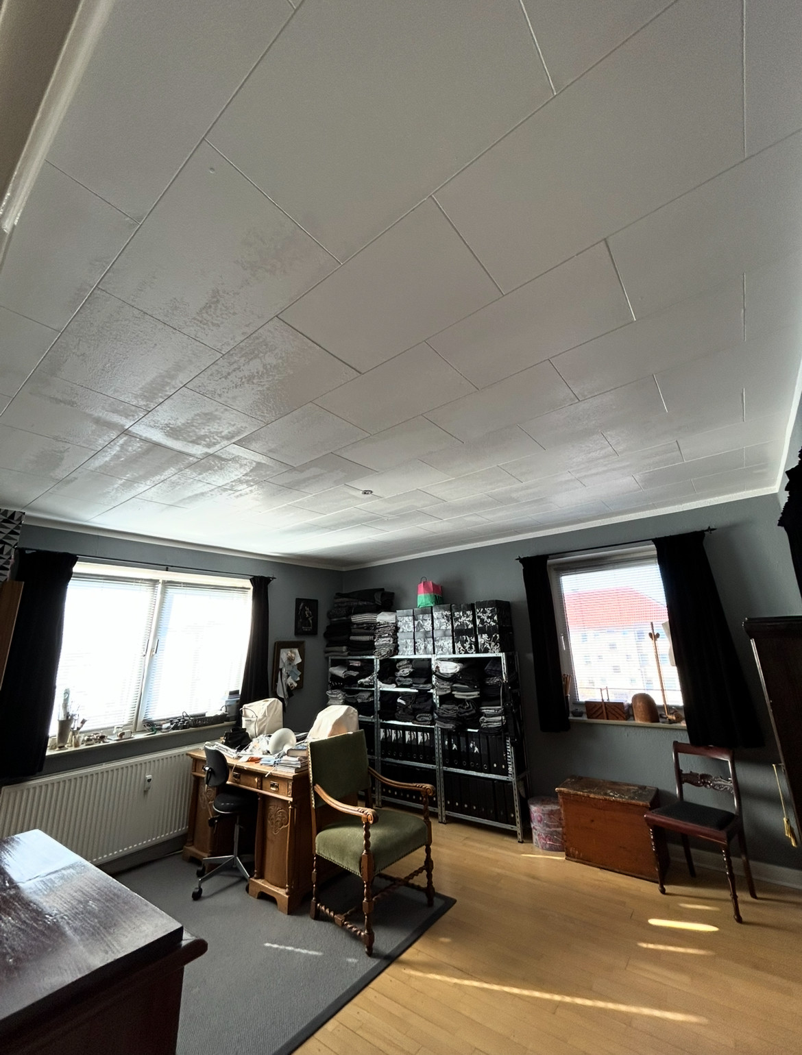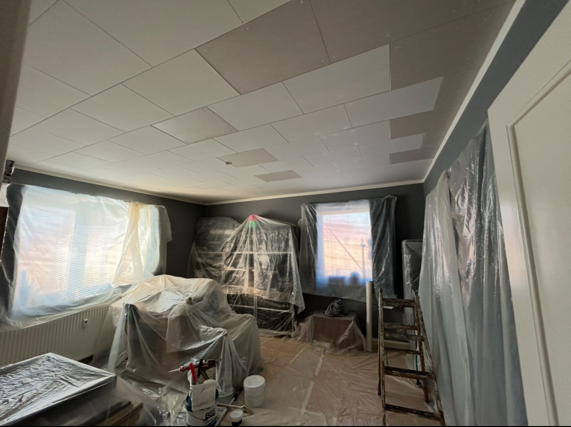 Efter en vandskade blev hele stueetagen næsten ryddet så alt skulle males vi valgte så at male 1 sal også , og da vi så var i gang valgte vi også at få malet alt træværk og vinduer udvendigt