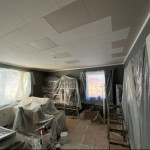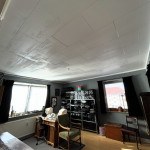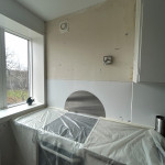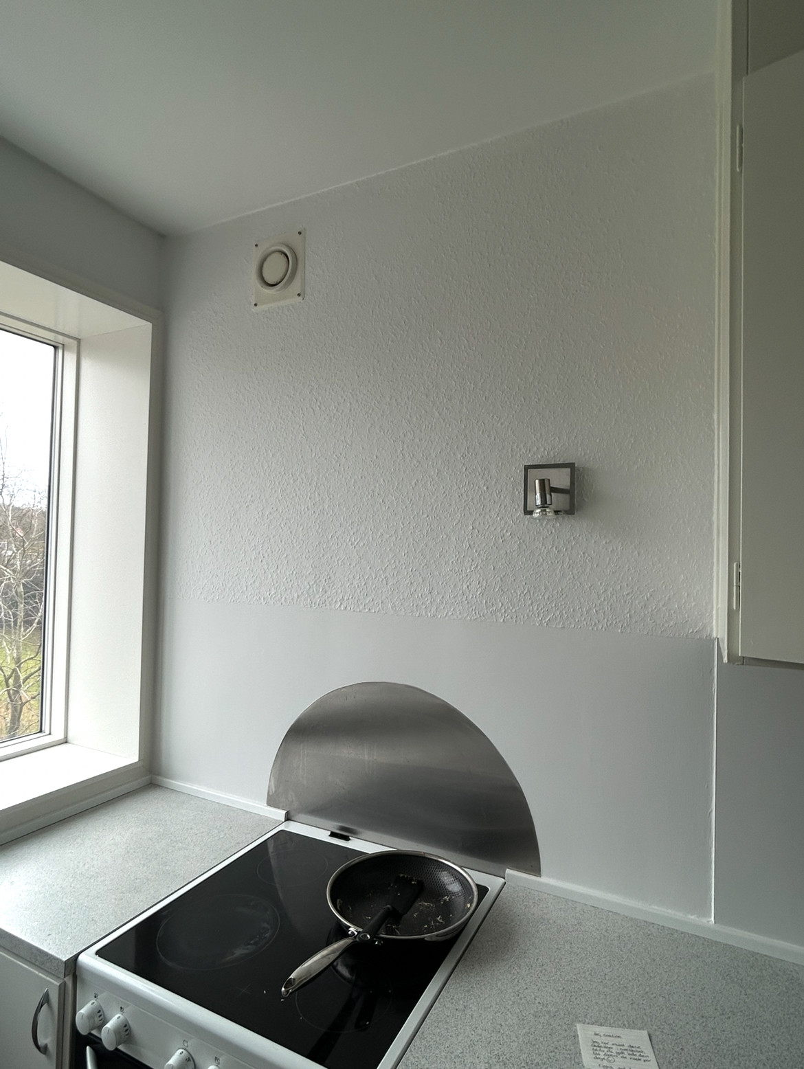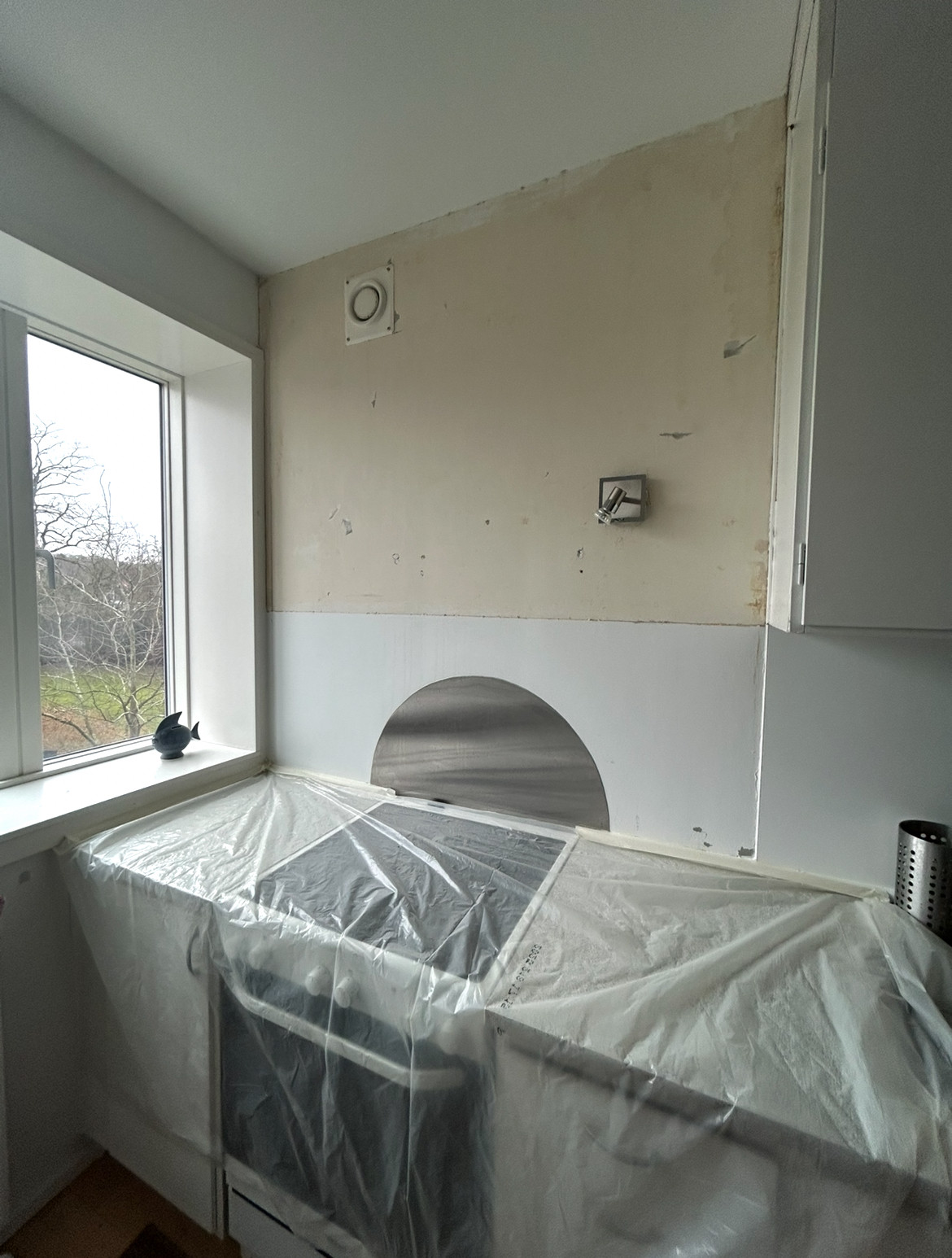 Vi har fået opsat mønstret tapet på en køkkenvæg, samt opsat en fotostat.