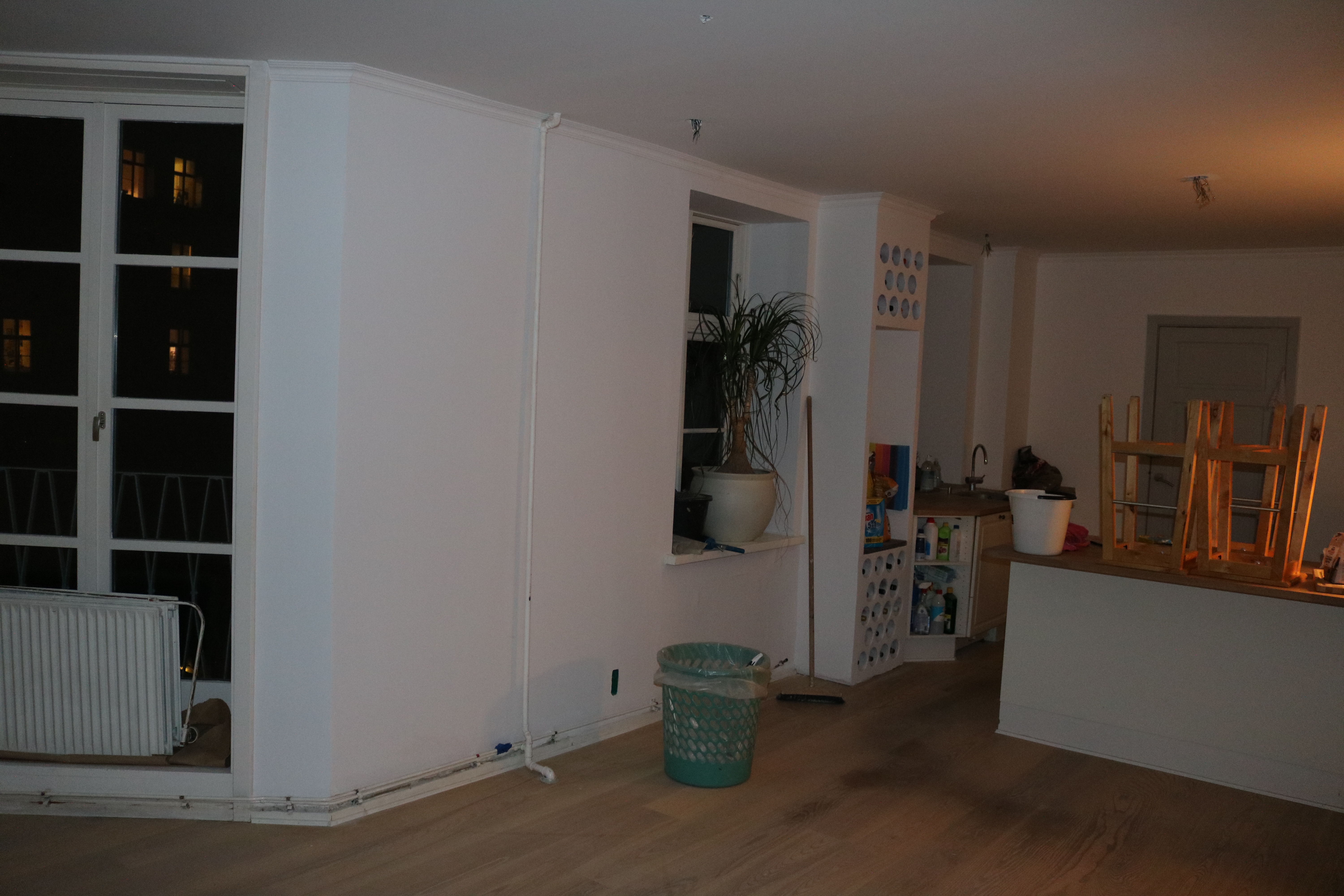 Oprydningen har været eksemplartisk, støvsugning dagligt og de stiller tingene til side, ved fyraften og bære alt ned, som de er færdige med at bruge, og de støver næsten ikke, da den maskine de bruger til at pudse væggene er så god.
