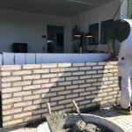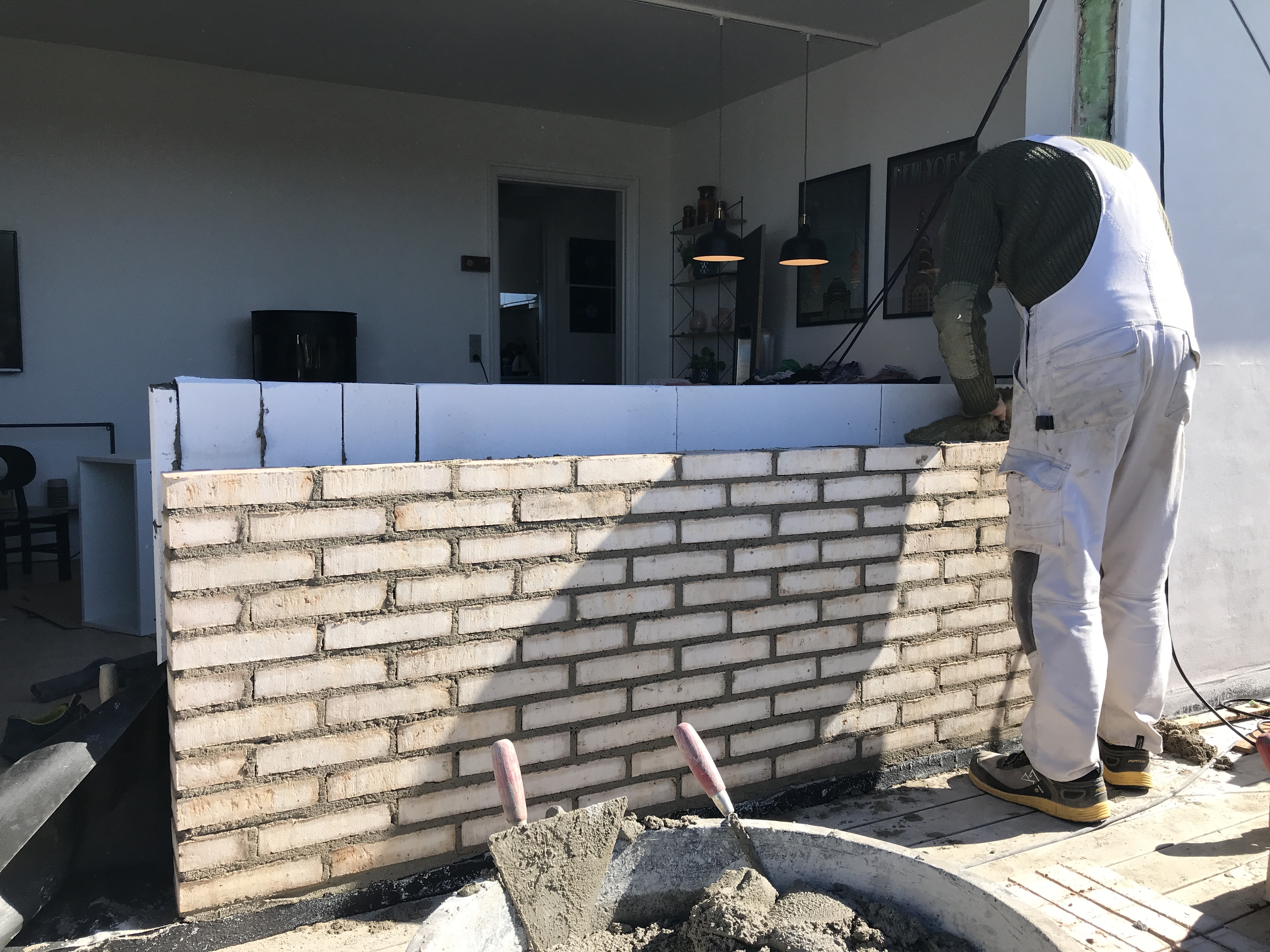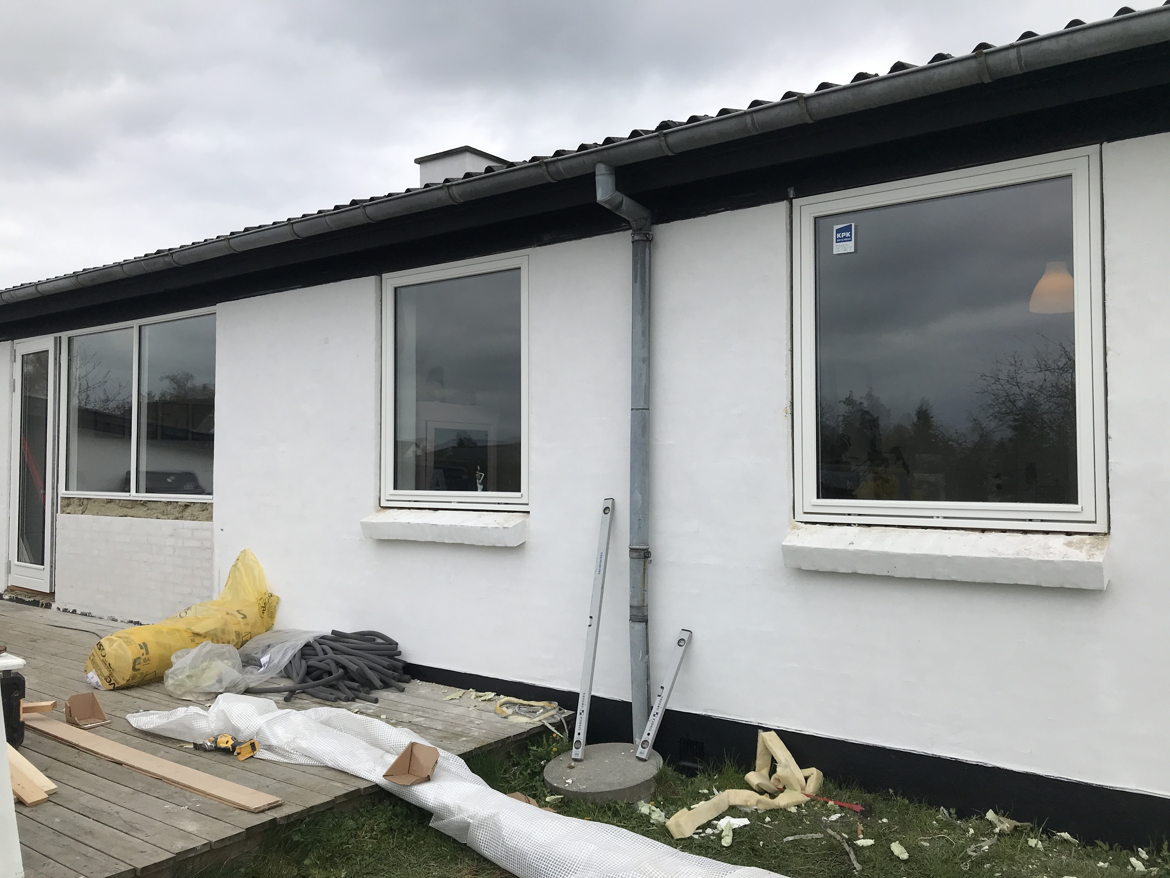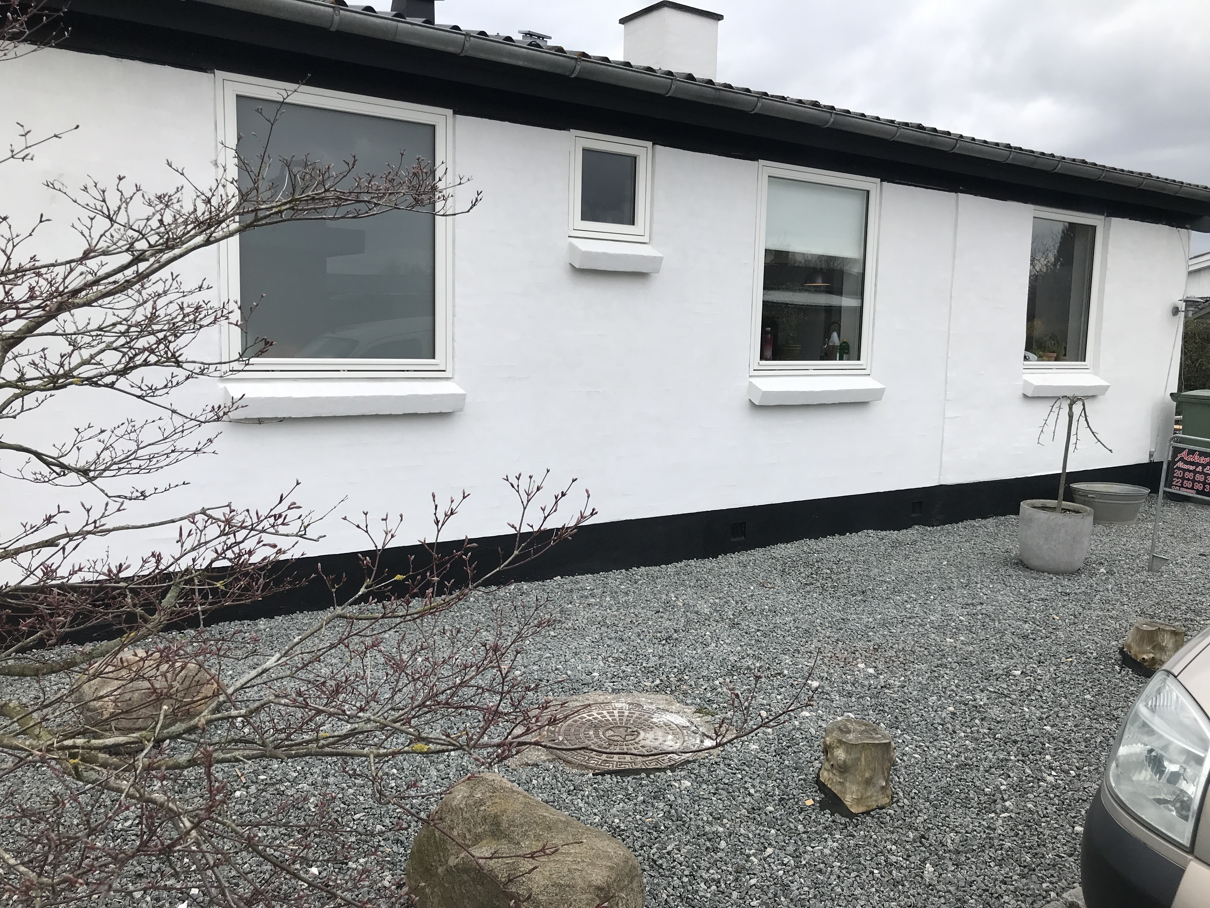 Jeg har fået lavet en understøbning af eksisterende sokkel, samt udbedret en skade i ornamenteret puds på hjørnet af et gammelt hus fra 1880.