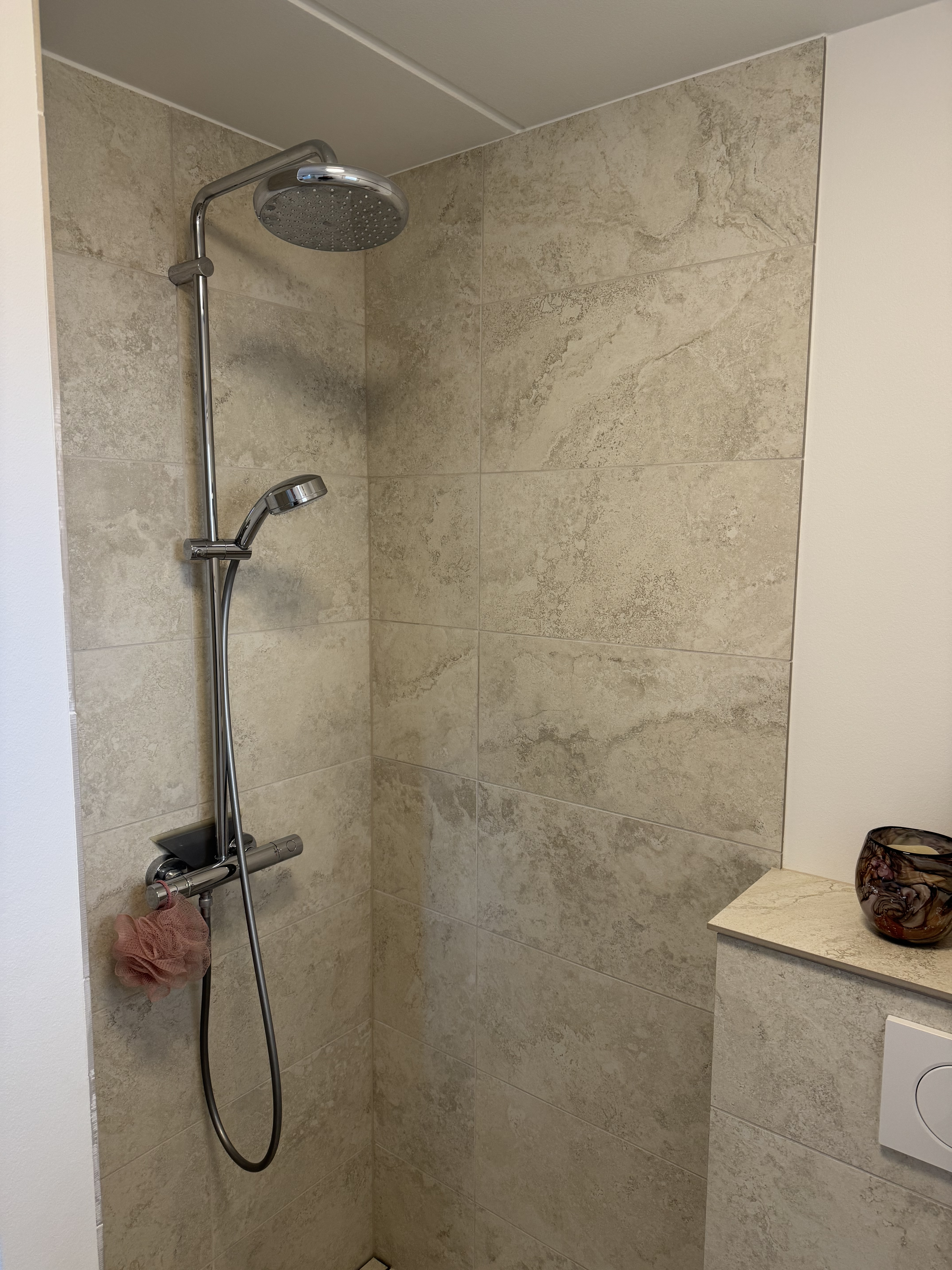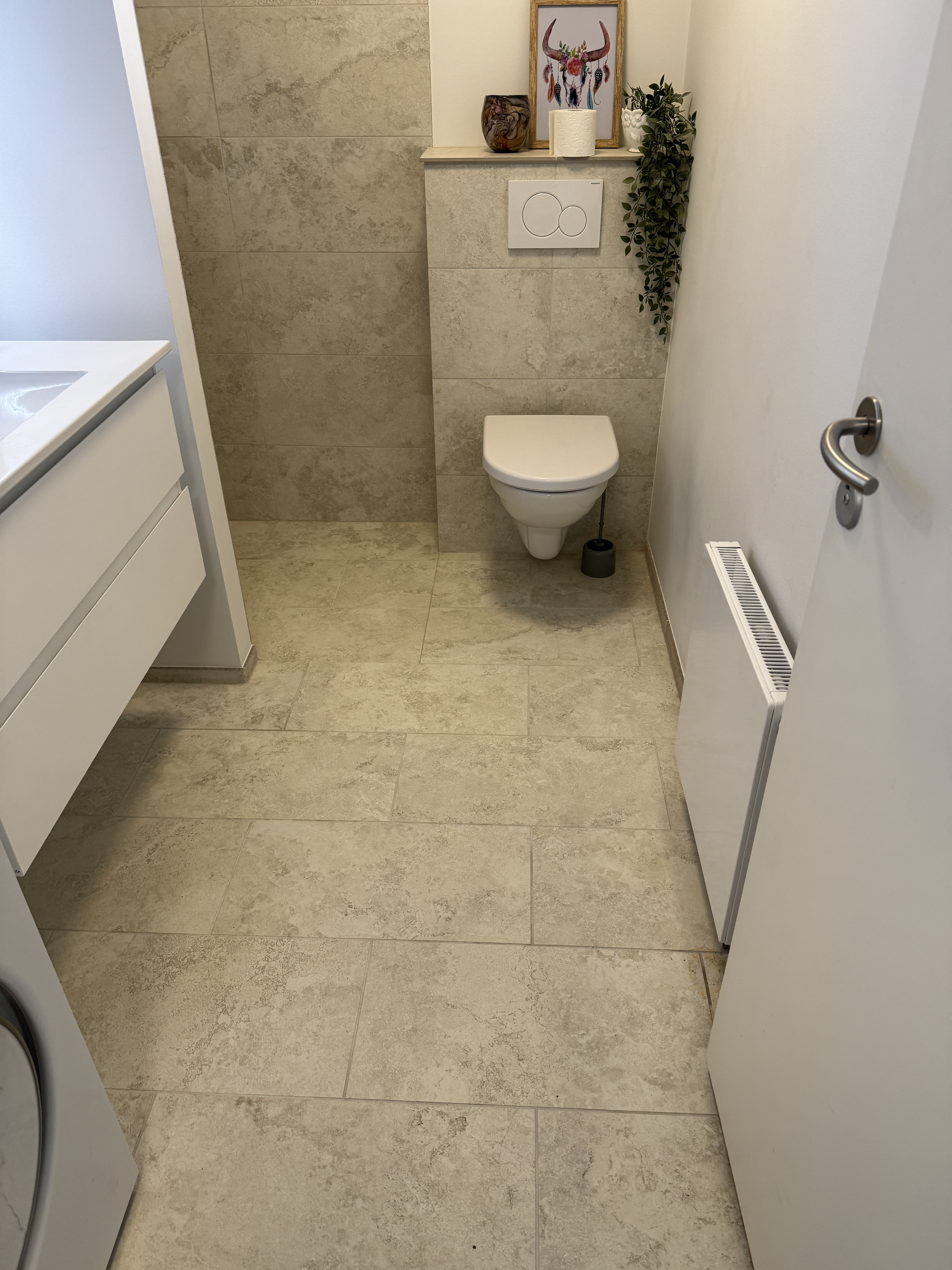 Fliser 6x600x1200mm opsat snor lige, på skæve vægge, der også skulle oprettes! Og med en flot 3mm fuge på gulv & vægge, der også flugter snor lige.